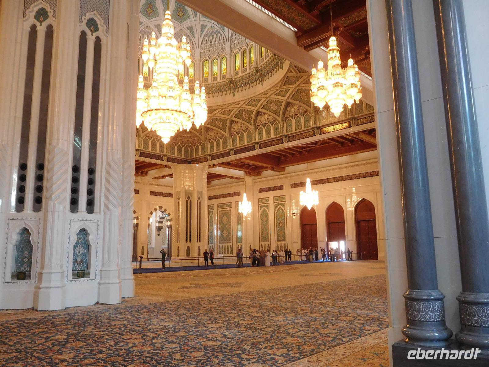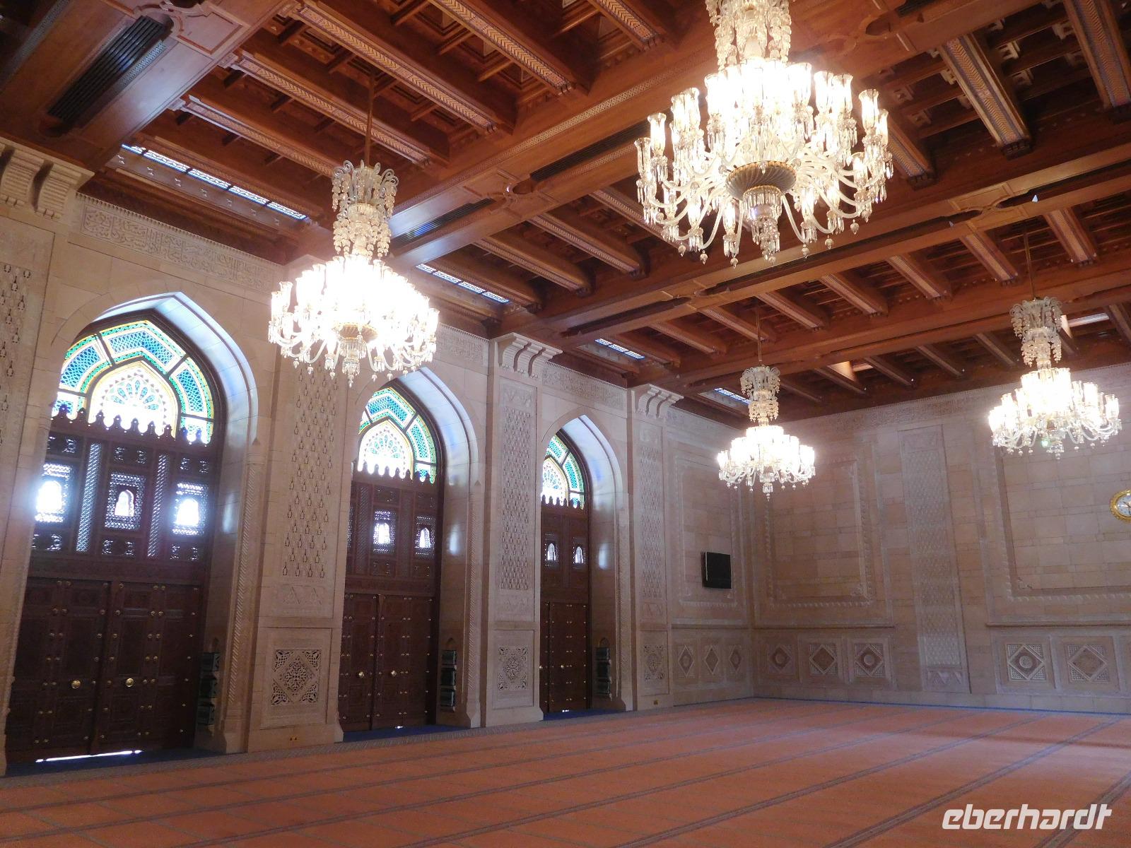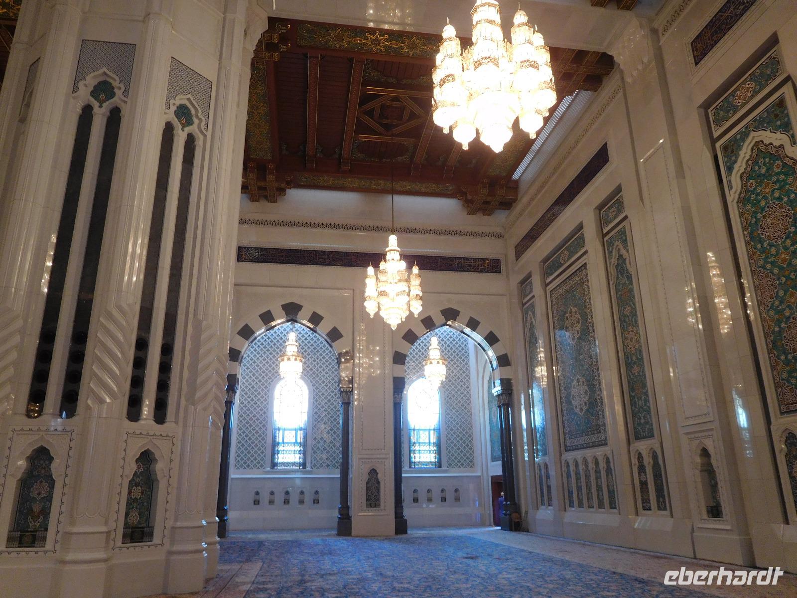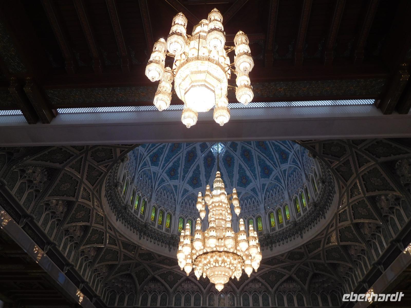 Nach diesem Raum des Staunens führte uns Mohammed weiter in den Gebetssaal der Frauen, der deutlich kleiner - nämlich nur für 750 Damen - und deutlich schlichter ausfällt. Aber auch hier hängen unter sechs Kuppeln funkelnde Kronleuchter und auch hier sind die Wände reich verziert.