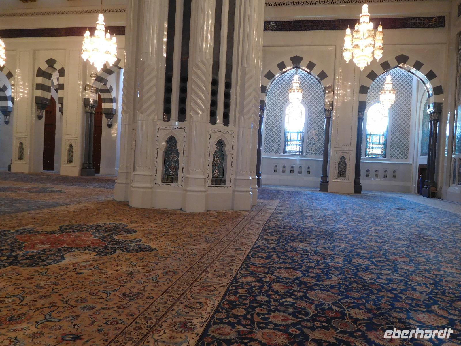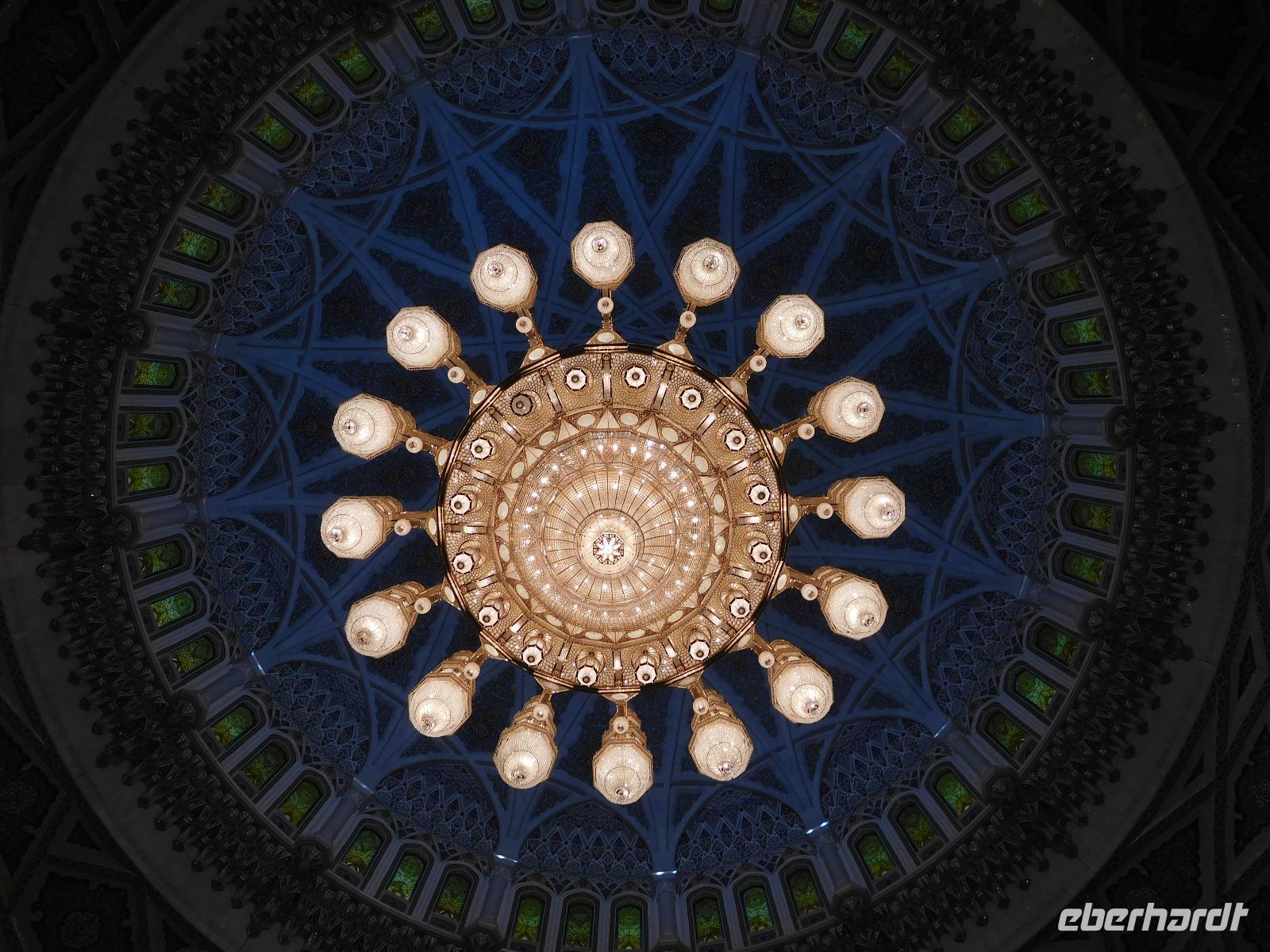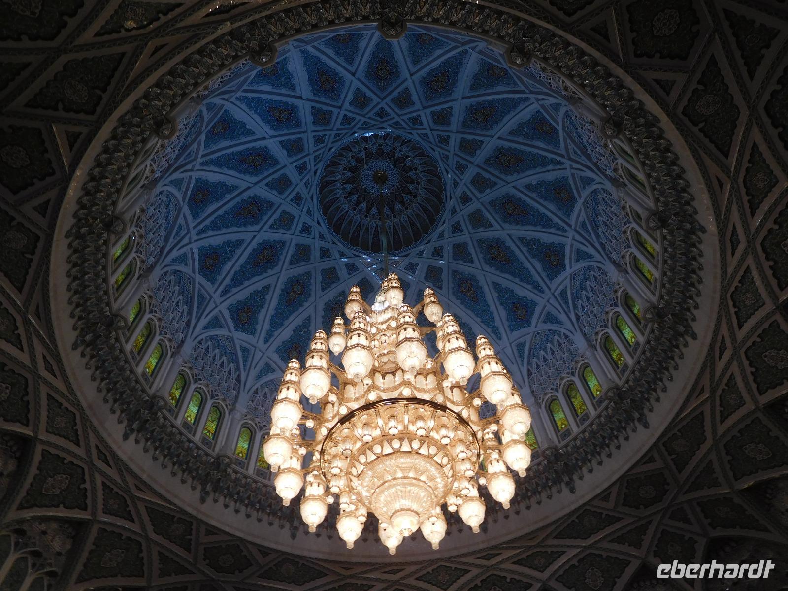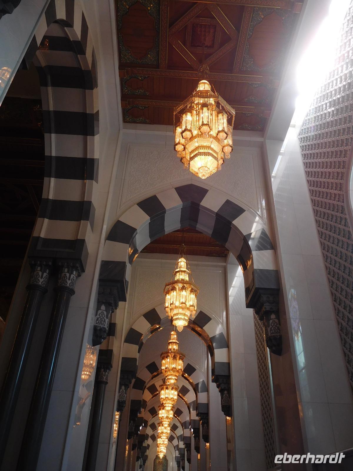 Nach diesem Raum des Staunens führte uns Mohammed weiter in den Gebetssaal der Frauen, der deutlich kleiner - nämlich nur für 750 Damen - und deutlich schlichter ausfällt. Aber auch hier hängen unter sechs Kuppeln funkelnde Kronleuchter und auch hier sind die Wände reich verziert.