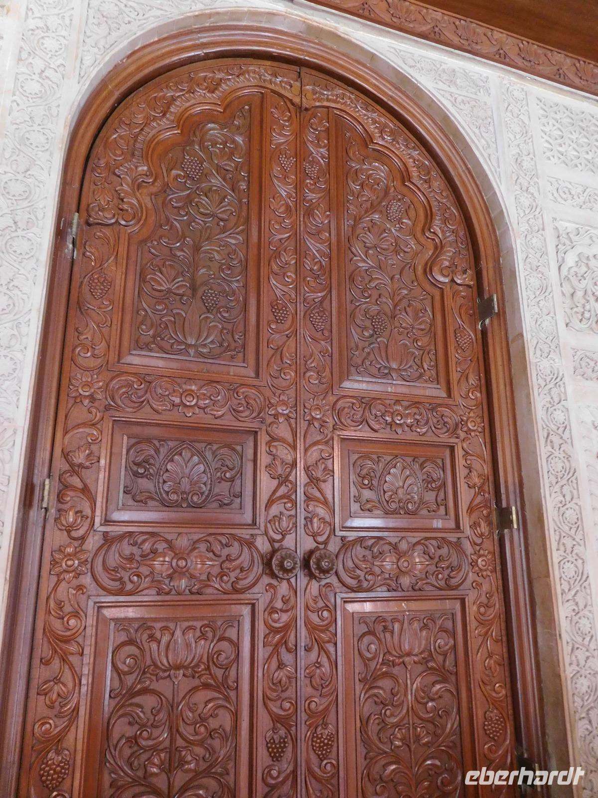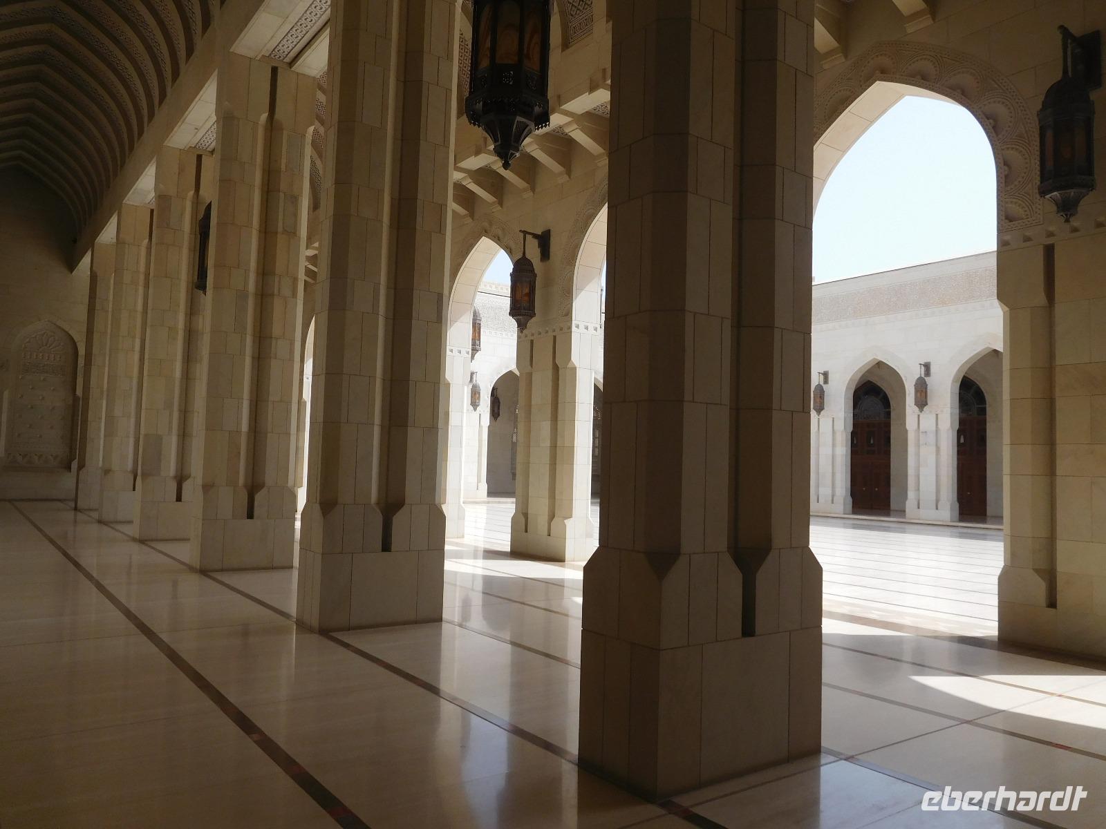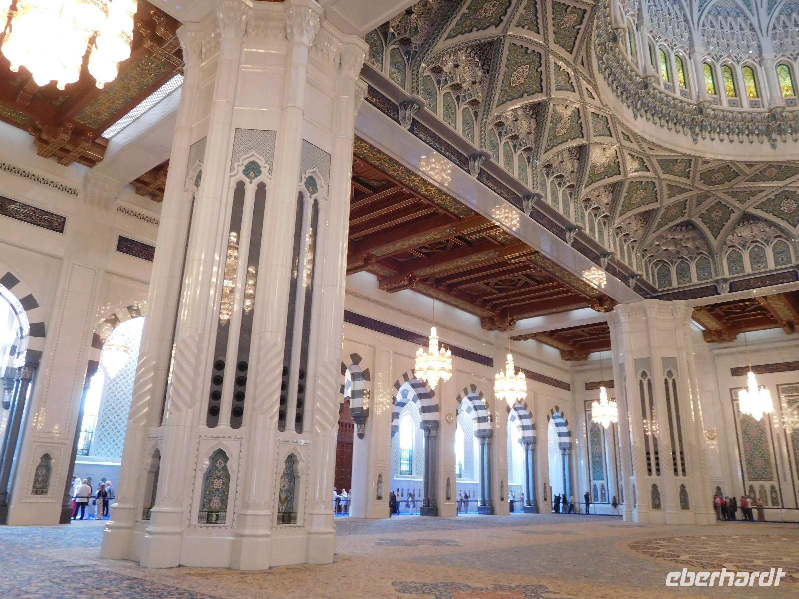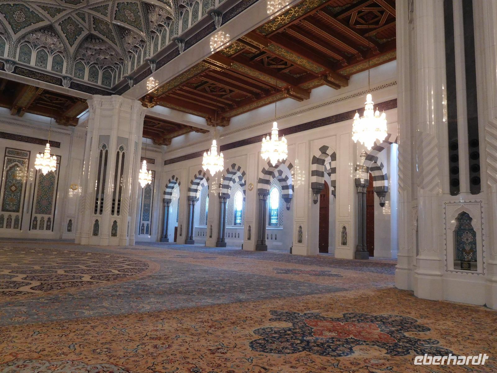 Nach diesem Raum des Staunens führte uns Mohammed weiter in den Gebetssaal der Frauen, der deutlich kleiner - nämlich nur für 750 Damen - und deutlich schlichter ausfällt. Aber auch hier hängen unter sechs Kuppeln funkelnde Kronleuchter und auch hier sind die Wände reich verziert.