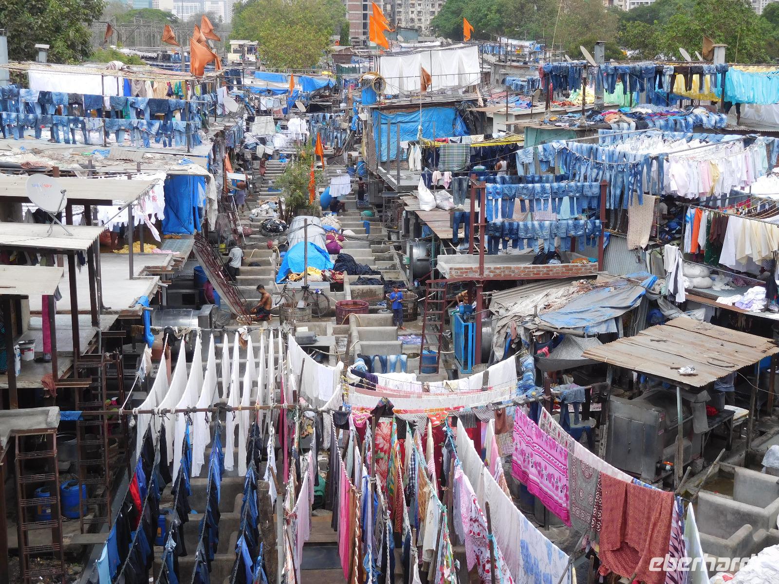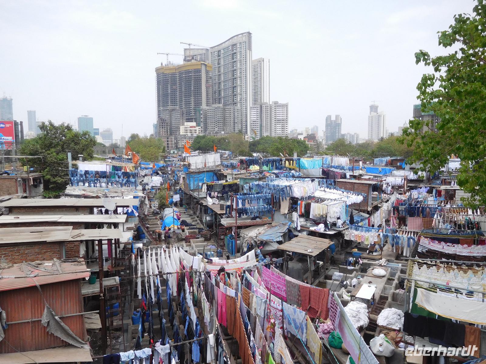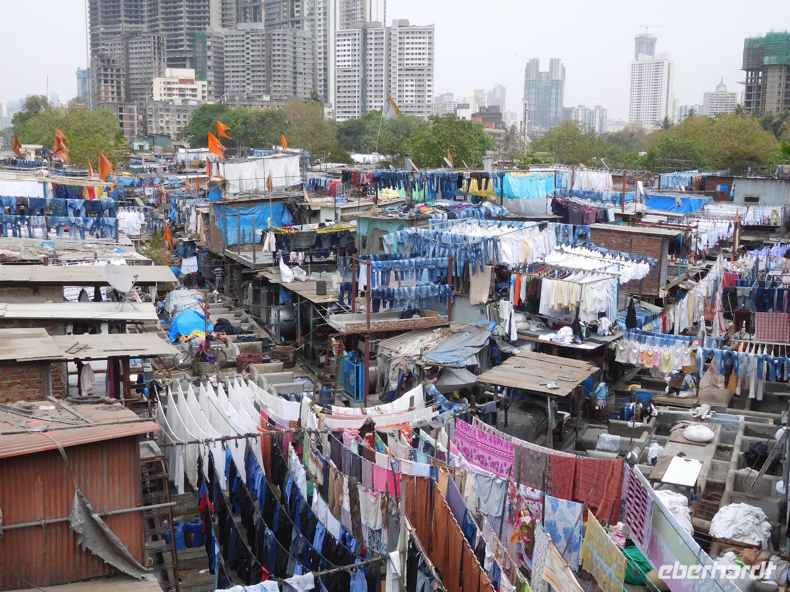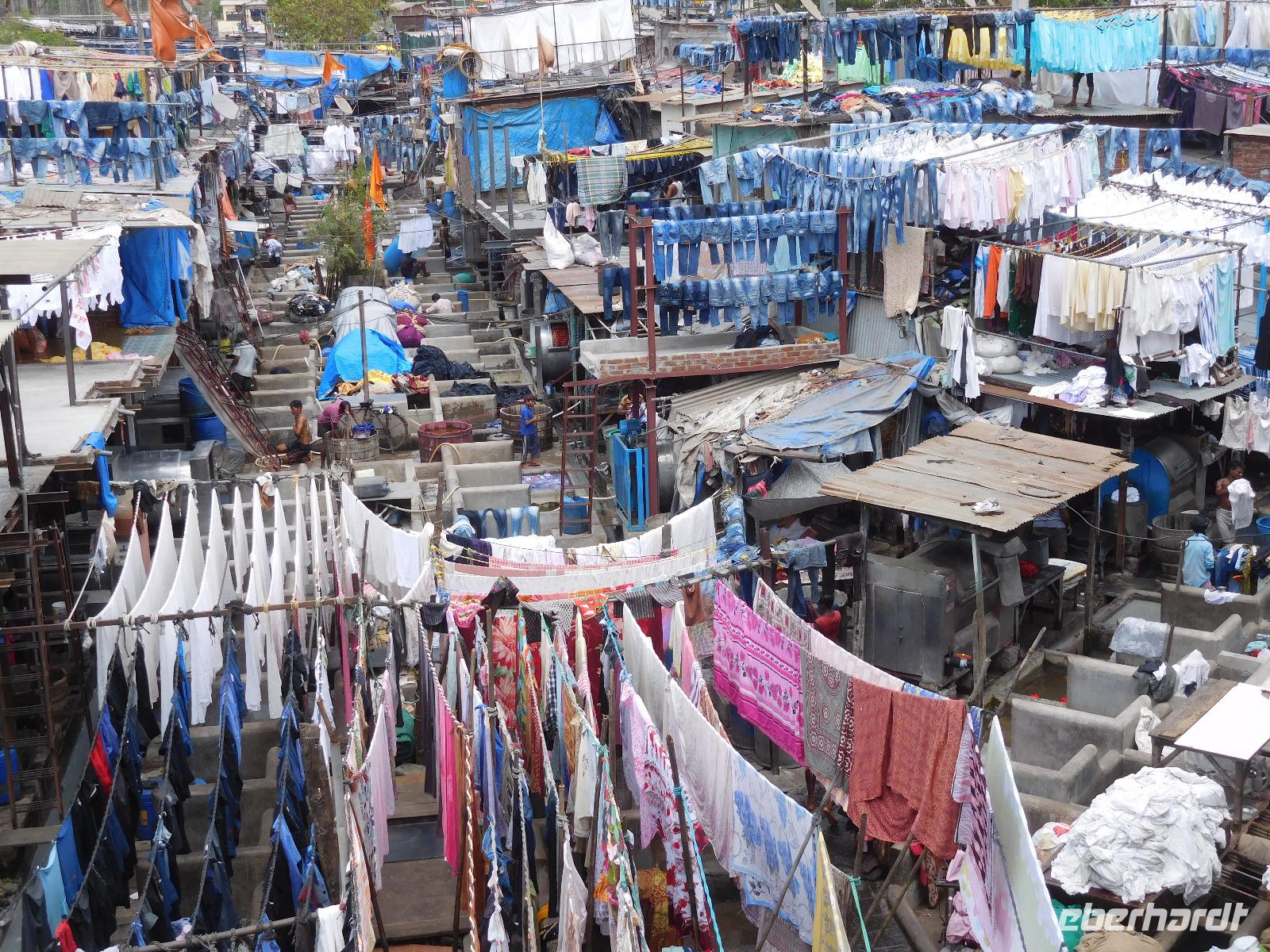 Unser Mittagessen genossen wir typisch indisch mit einer großen Vielfalt an verschiedenen Curries und süßen Desserts, bevor uns der Bus zu einem weiteren berühmten Punkt Mumbais brachte: Den Wäschereien von Dhobi Ghat. Hier wird unter freiem Himmel in vielen Wannen die anfallende Wäsche der Stadt gewaschen. Handtücher, Laken, Hosen, Hemden - alles hing fein säuberlich nach Farben sortiert in einer kleinen Siedlung zwischen den Hochhäusern der Metropole. Diese Wäschereien seien besser als die maschinellen Salons, war Guide Smita überzeugt, doch so ganz konnten wir uns das angesichts des vielen Verkehrs rund um diesen Ort nicht vorstellen.