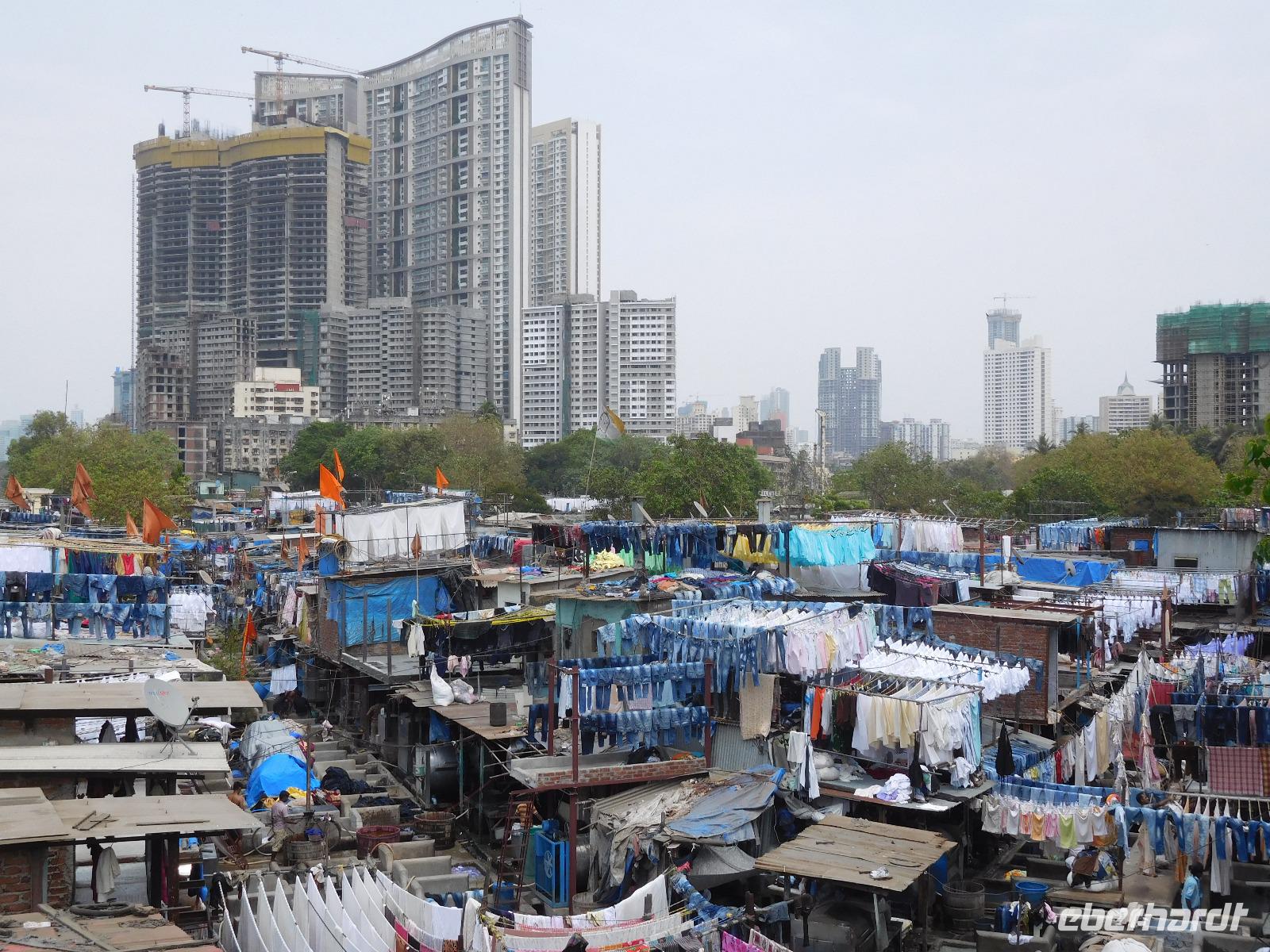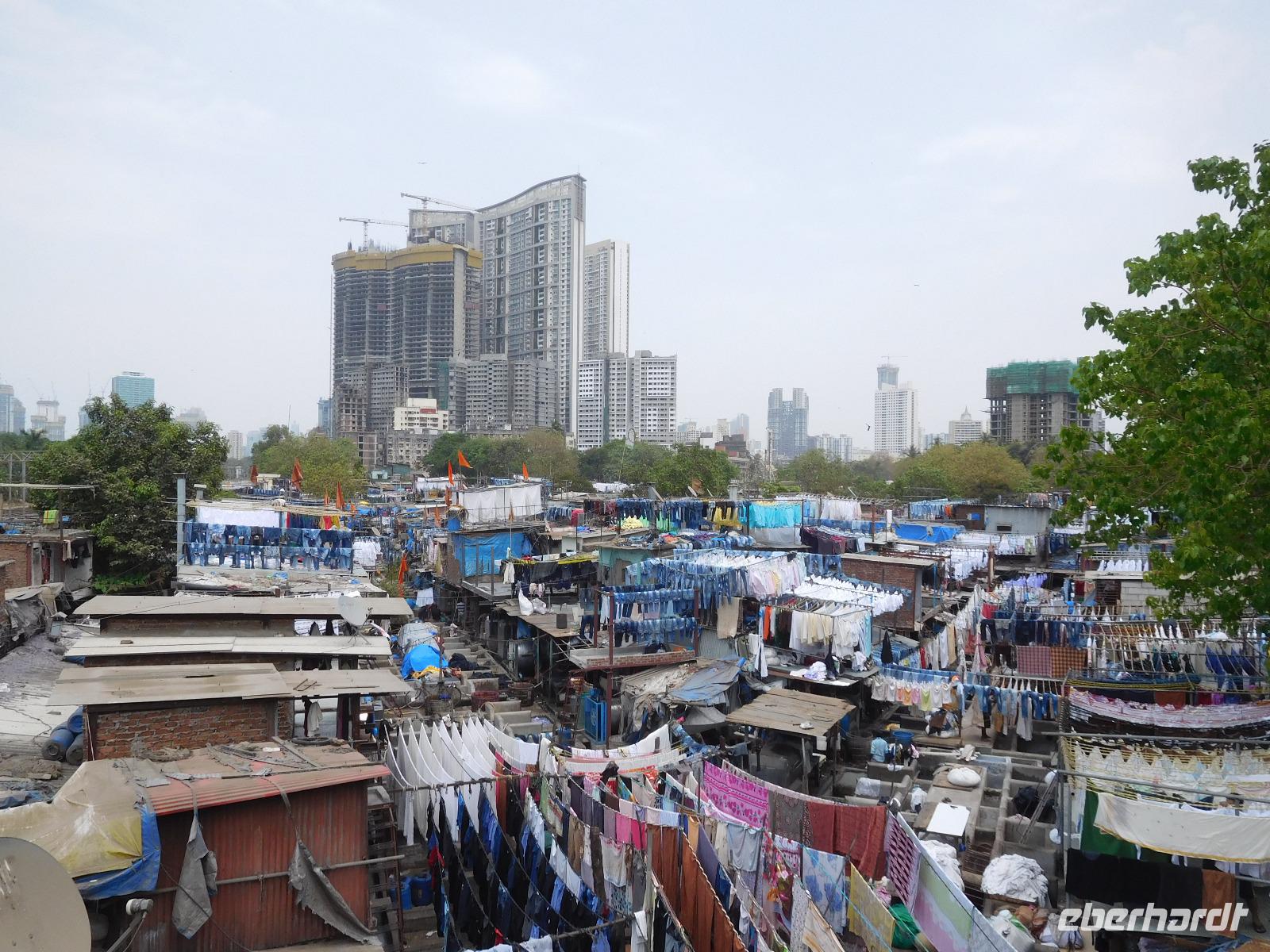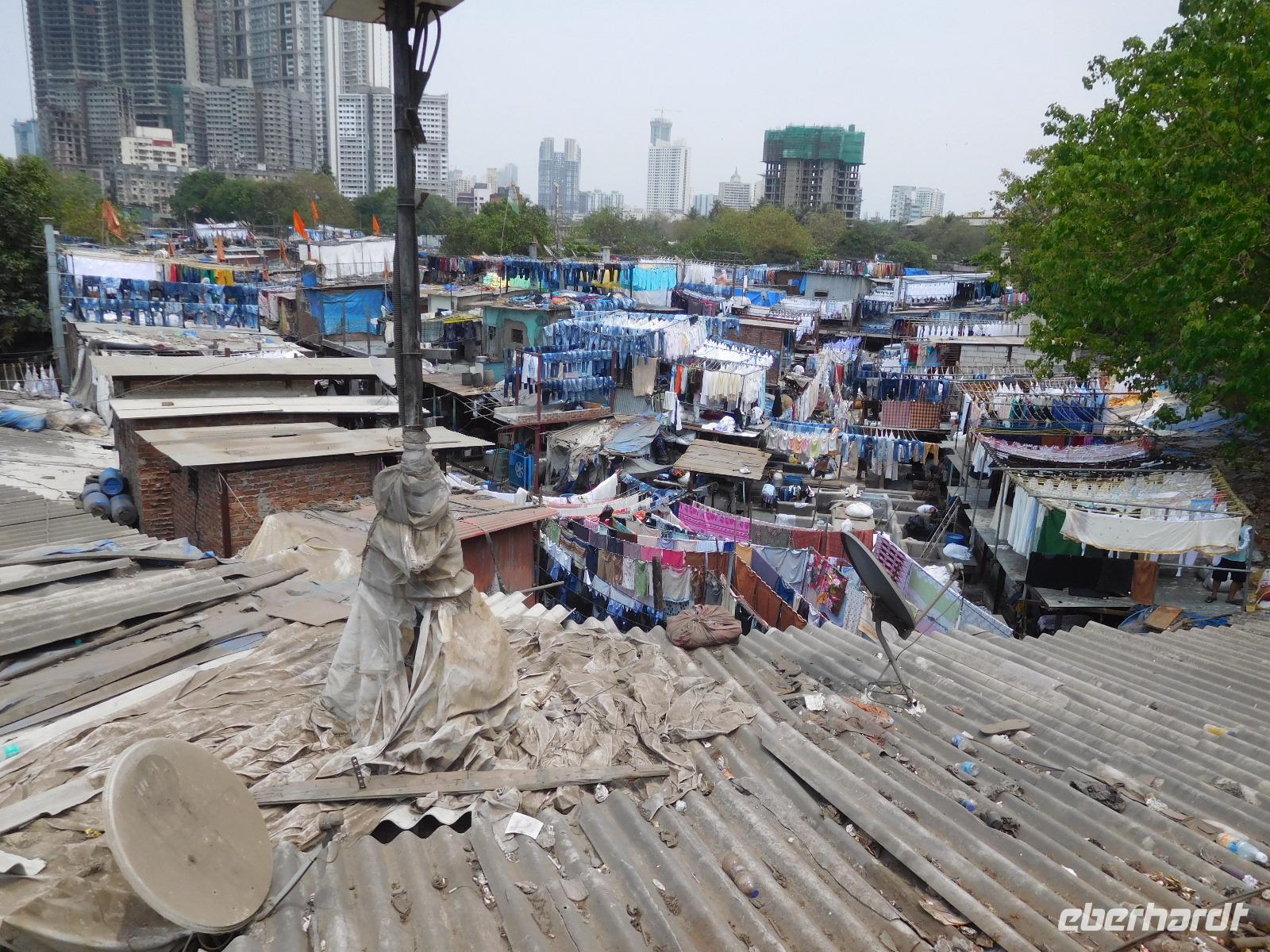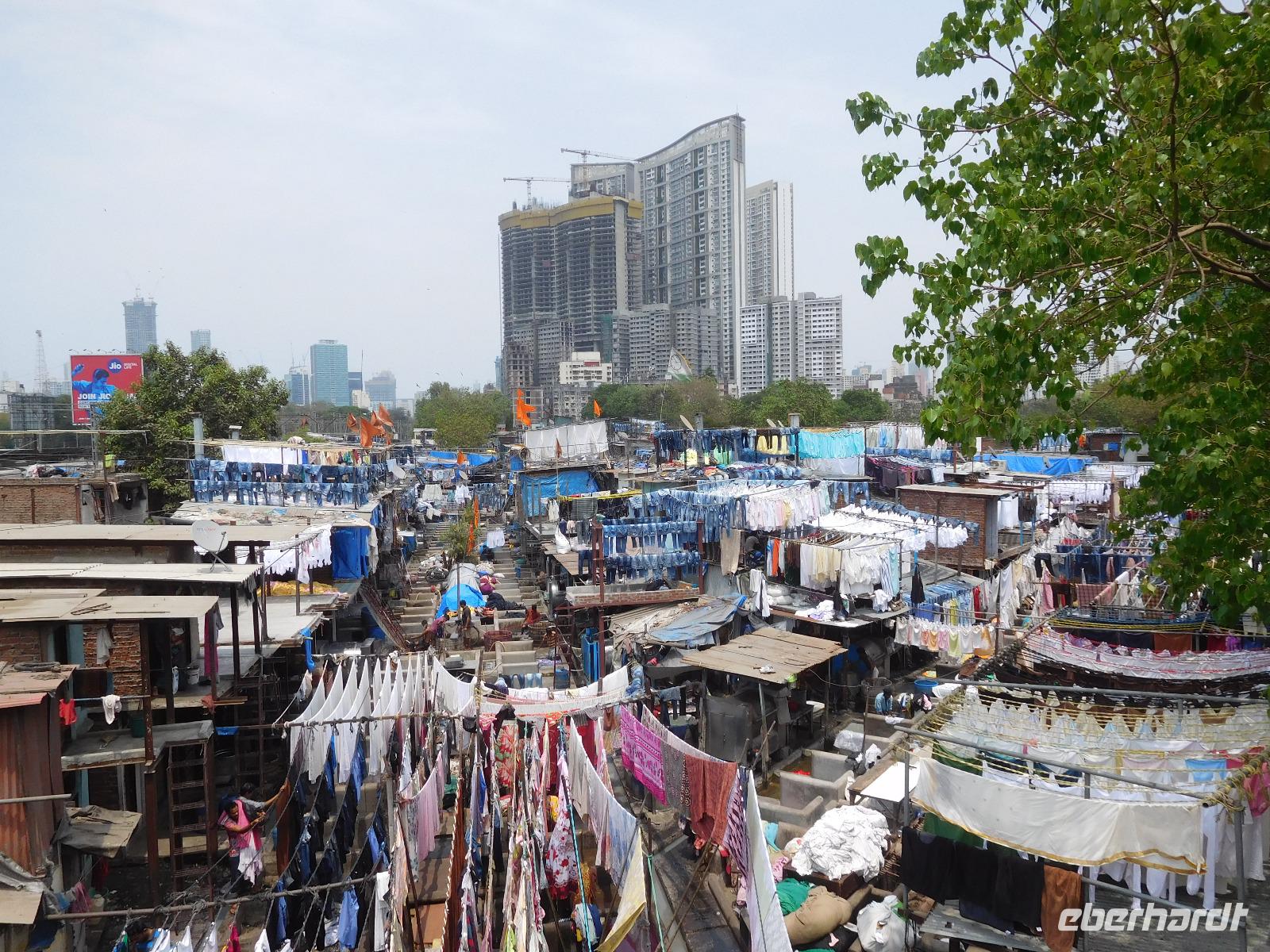 Unser Mittagessen genossen wir typisch indisch mit einer großen Vielfalt an verschiedenen Curries und süßen Desserts, bevor uns der Bus zu einem weiteren berühmten Punkt Mumbais brachte: Den Wäschereien von Dhobi Ghat. Hier wird unter freiem Himmel in vielen Wannen die anfallende Wäsche der Stadt gewaschen. Handtücher, Laken, Hosen, Hemden - alles hing fein säuberlich nach Farben sortiert in einer kleinen Siedlung zwischen den Hochhäusern der Metropole. Diese Wäschereien seien besser als die maschinellen Salons, war Guide Smita überzeugt, doch so ganz konnten wir uns das angesichts des vielen Verkehrs rund um diesen Ort nicht vorstellen.