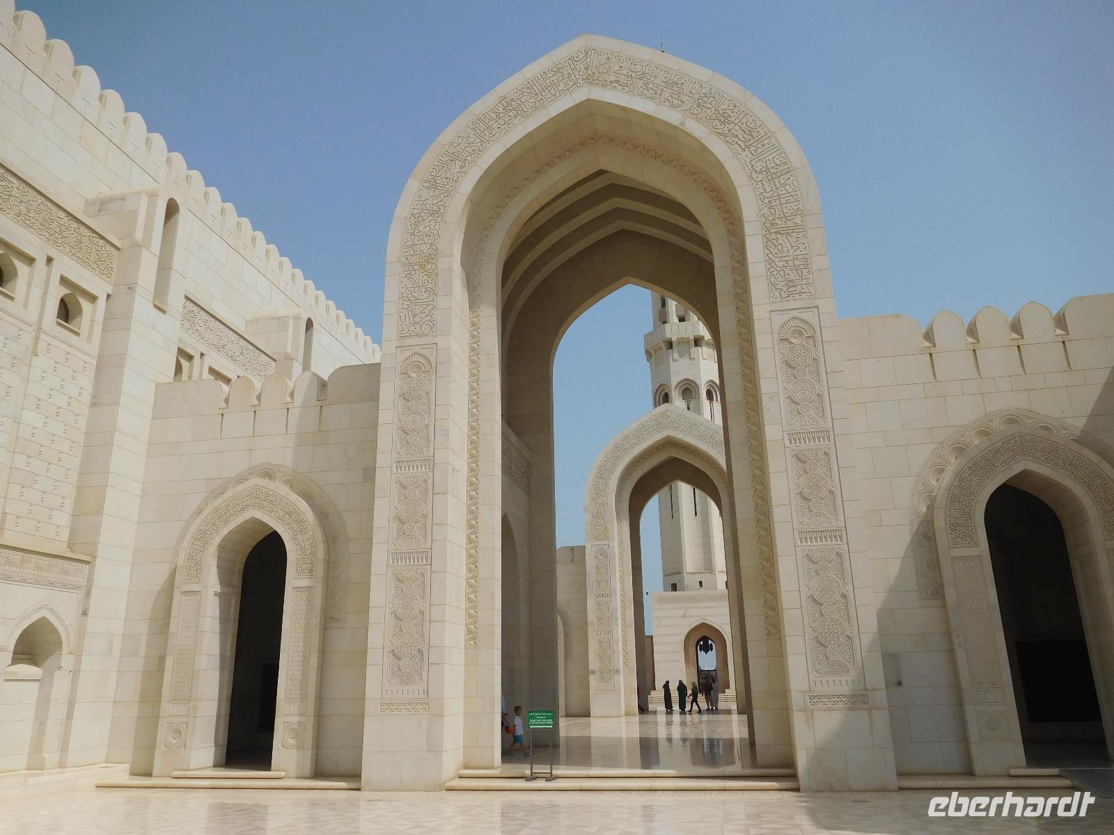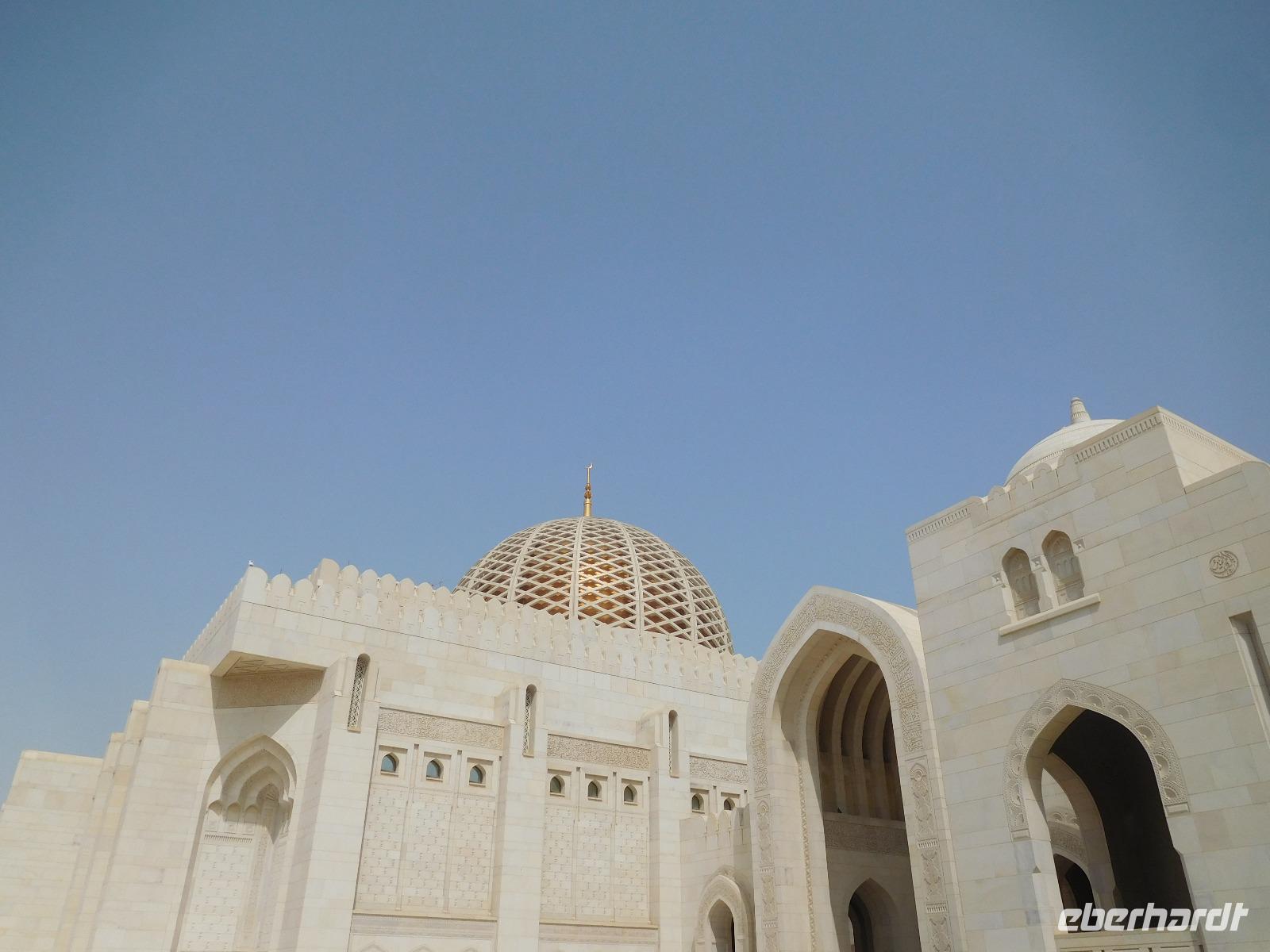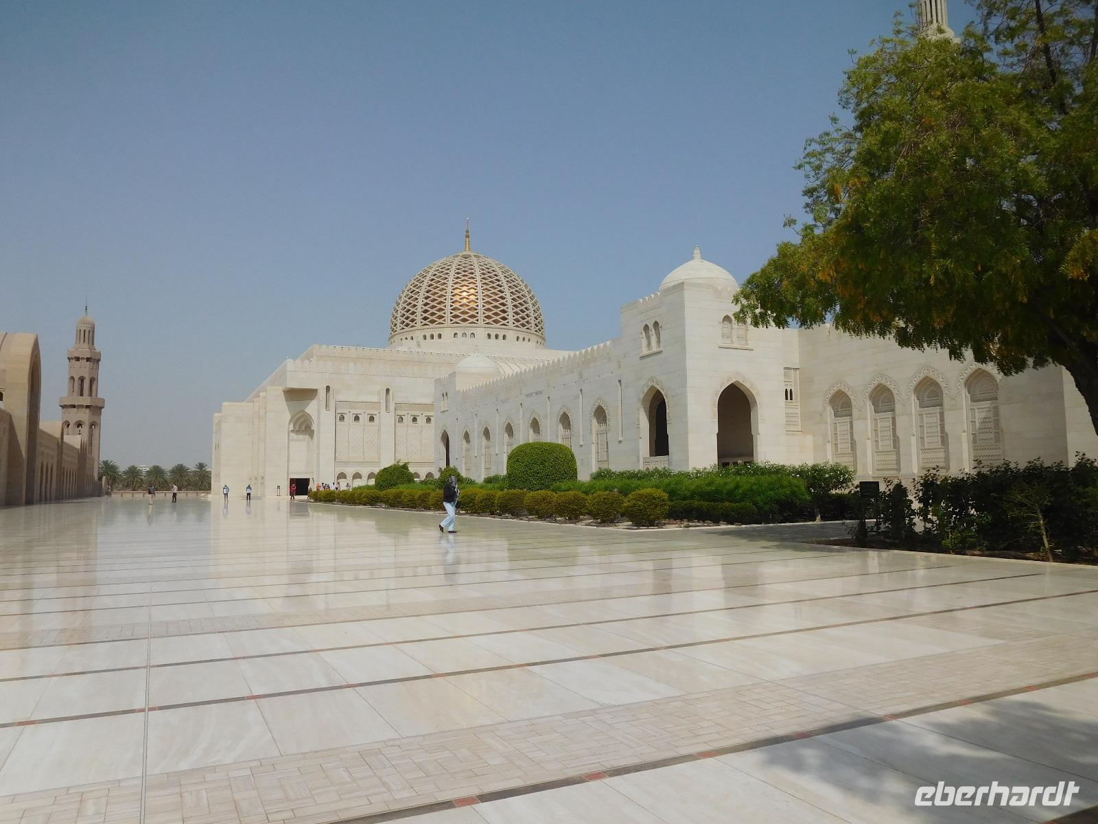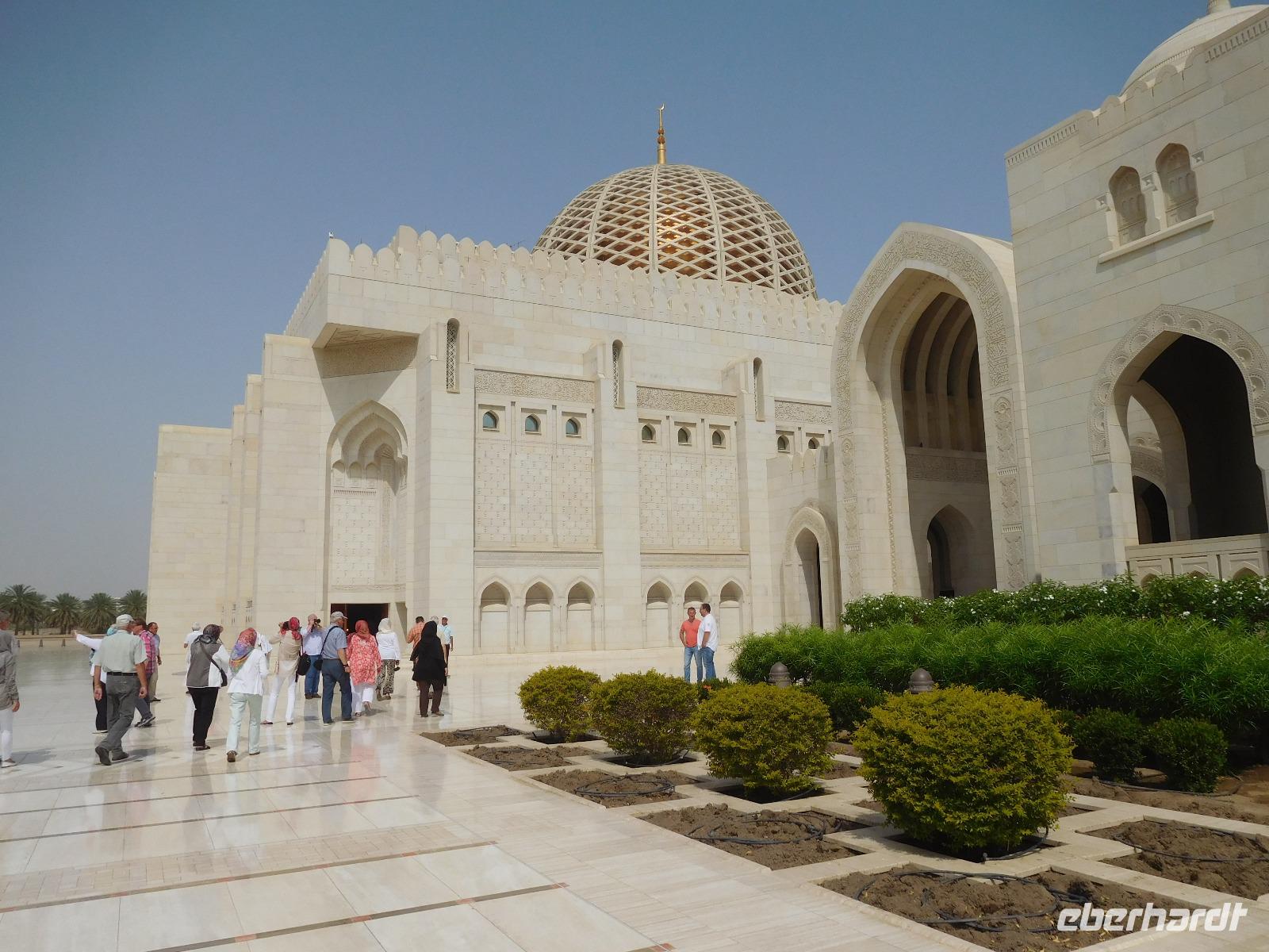 Mit Guide Mohammed fuhren wir zur Großen Sultan Qaboos Moschee, bei der die Frauen erst einmal das Verschleiern probten, bevor wir in das riesige Gelände eintreten durften. Diese Moschee ist mit einer Fläche von 4 Hektar eine der weltweit größten Moscheen. Der Innenraum der großen Männergebetshalle bietet rund 6.500 Gläubigen den Platz und beherbergt einen riesigen Schatz an Handwerkskunst. Zu unseren Füßen lag ein riesiger handgeknüpfter Teppich, den 600 Knüpferinnen mehr als drei Jahre lang gefertigt haben. Über unseren Köpfen schwebt der zweitgrößte Kronleuchter der Welt, dank unzähliger Swarovski-Kristallen magisch funkelnd. An den Wänden und Decken verzaubern und lehren kunstvolle Kalligrafien.