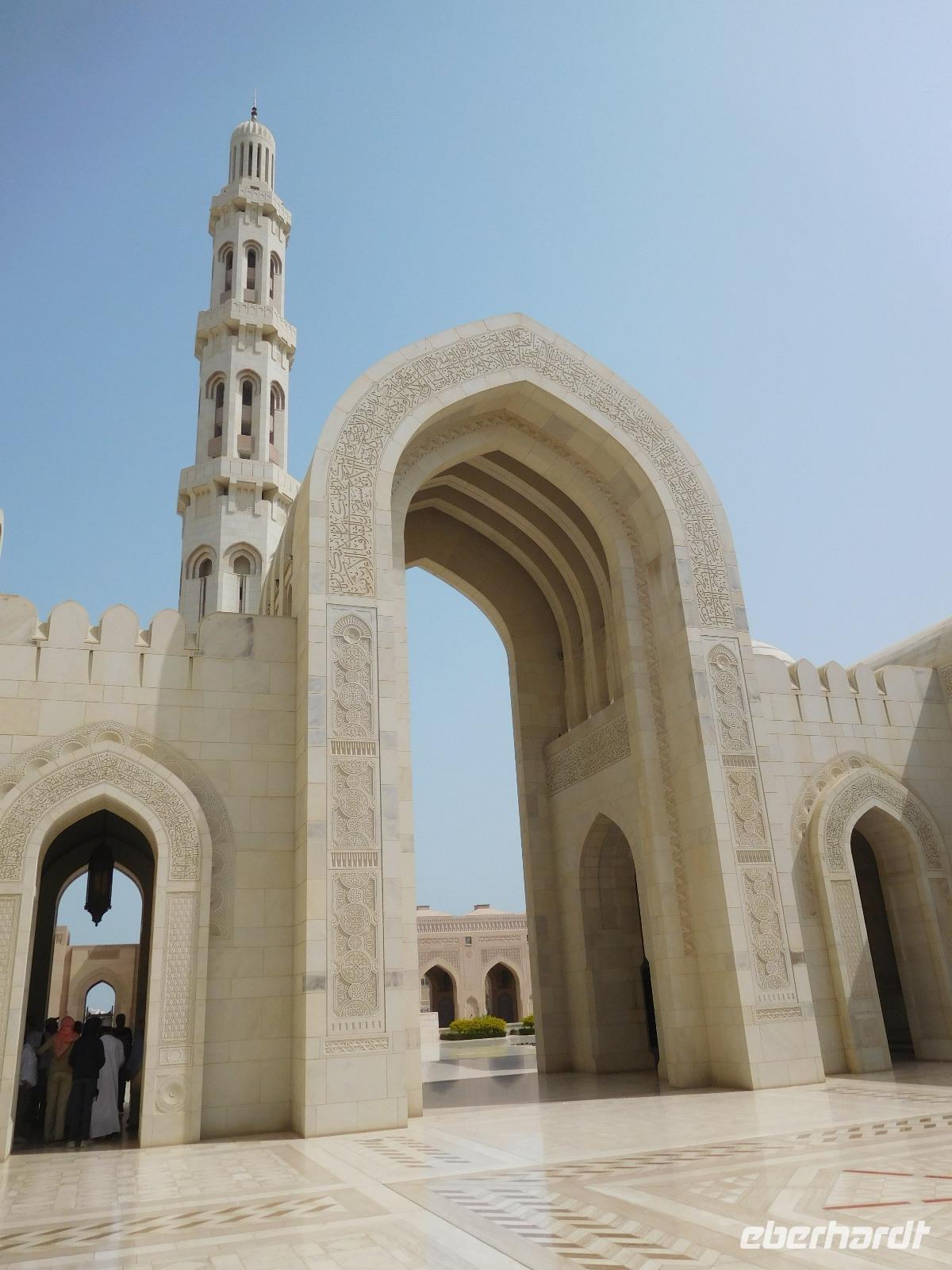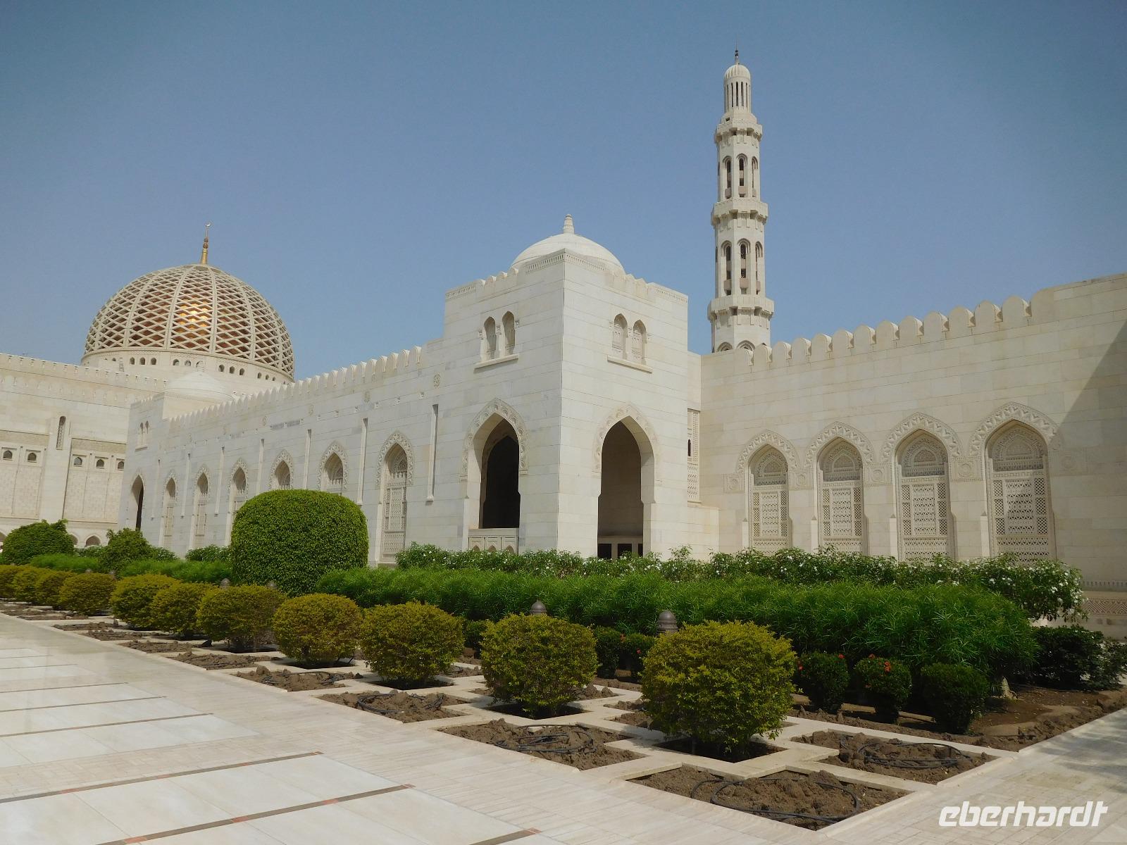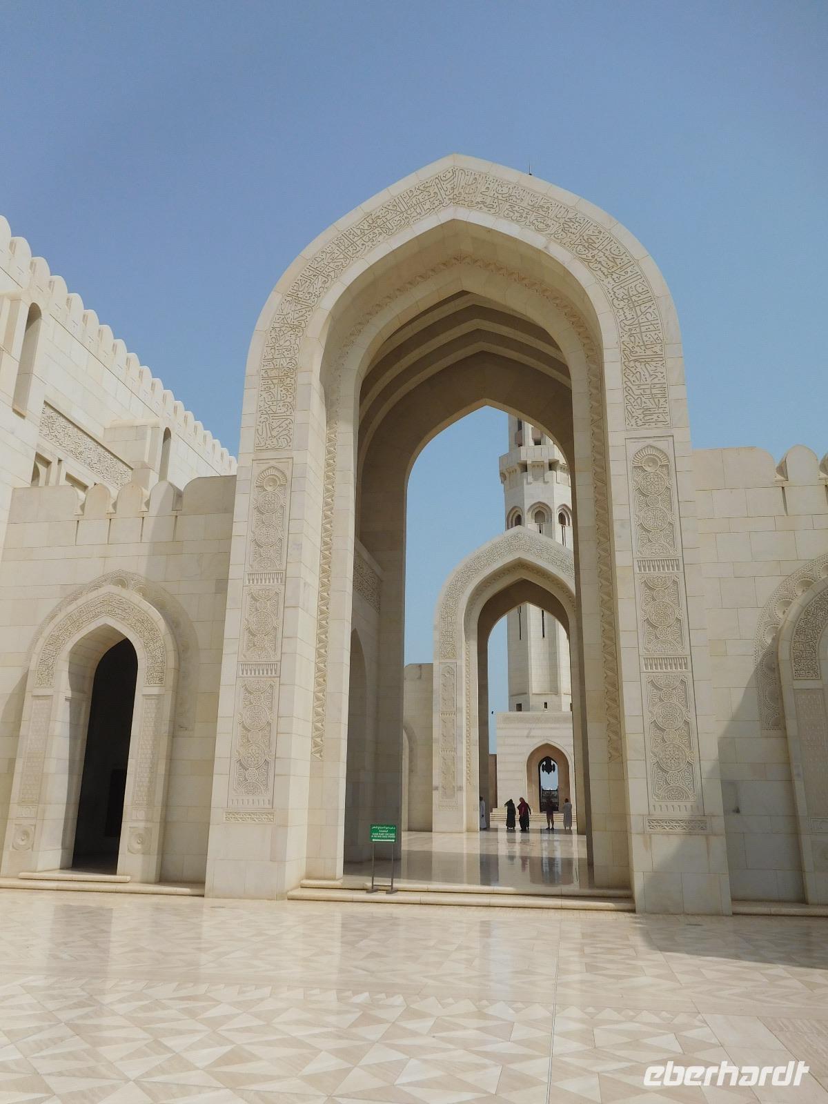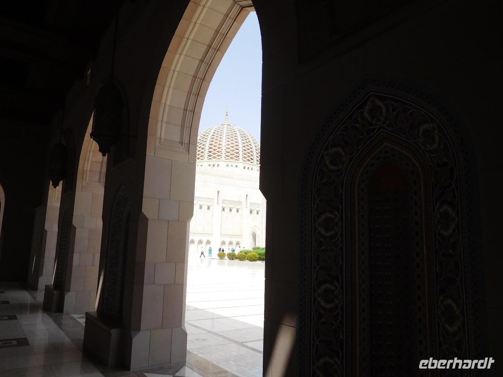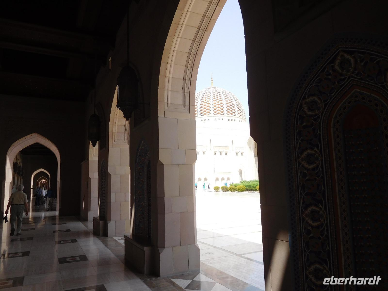 Mit Guide Mohammed fuhren wir zur Großen Sultan Qaboos Moschee, bei der die Frauen erst einmal das Verschleiern probten, bevor wir in das riesige Gelände eintreten durften. Diese Moschee ist mit einer Fläche von 4 Hektar eine der weltweit größten Moscheen. Der Innenraum der großen Männergebetshalle bietet rund 6.500 Gläubigen den Platz und beherbergt einen riesigen Schatz an Handwerkskunst. Zu unseren Füßen lag ein riesiger handgeknüpfter Teppich, den 600 Knüpferinnen mehr als drei Jahre lang gefertigt haben. Über unseren Köpfen schwebt der zweitgrößte Kronleuchter der Welt, dank unzähliger Swarovski-Kristallen magisch funkelnd. An den Wänden und Decken verzaubern und lehren kunstvolle Kalligrafien.
