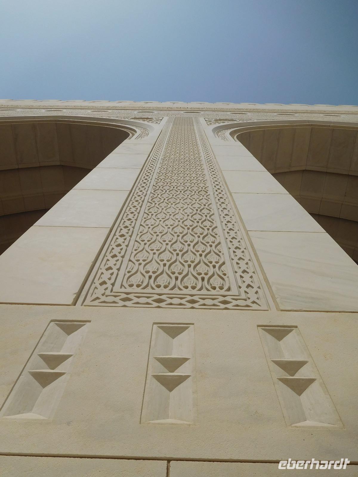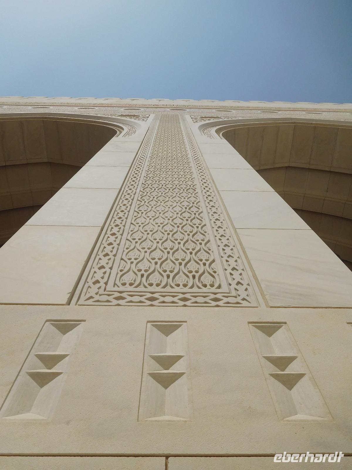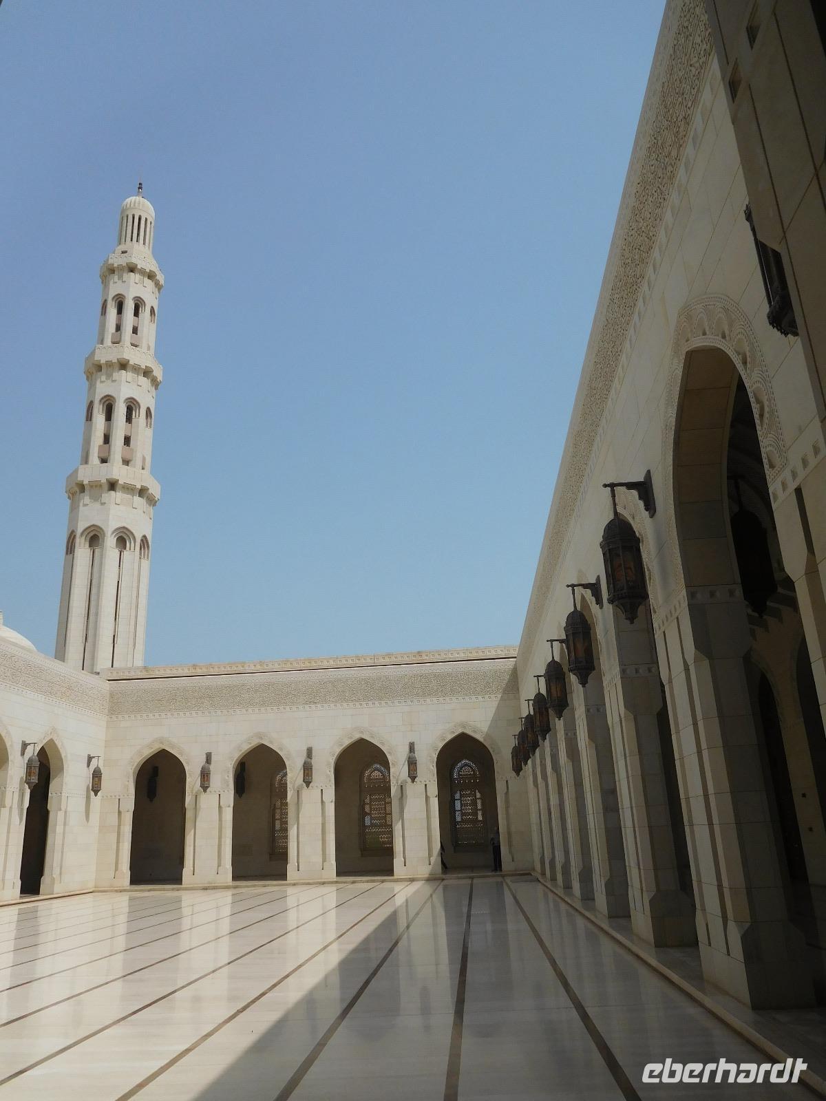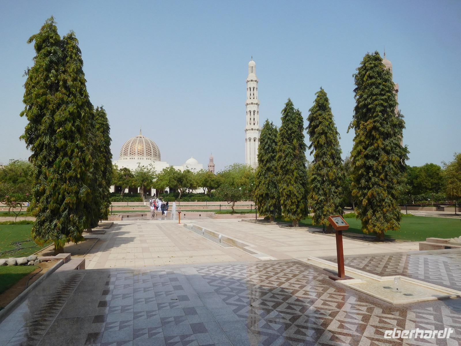 Mit Guide Mohammed fuhren wir zur Großen Sultan Qaboos Moschee, bei der die Frauen erst einmal das Verschleiern probten, bevor wir in das riesige Gelände eintreten durften. Diese Moschee ist mit einer Fläche von 4 Hektar eine der weltweit größten Moscheen. Der Innenraum der großen Männergebetshalle bietet rund 6.500 Gläubigen den Platz und beherbergt einen riesigen Schatz an Handwerkskunst. Zu unseren Füßen lag ein riesiger handgeknüpfter Teppich, den 600 Knüpferinnen mehr als drei Jahre lang gefertigt haben. Über unseren Köpfen schwebt der zweitgrößte Kronleuchter der Welt, dank unzähliger Swarovski-Kristallen magisch funkelnd. An den Wänden und Decken verzaubern und lehren kunstvolle Kalligrafien.