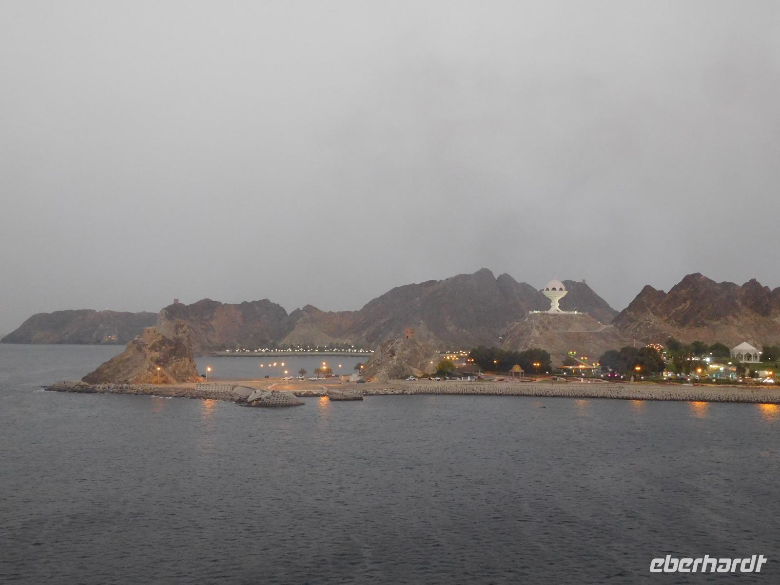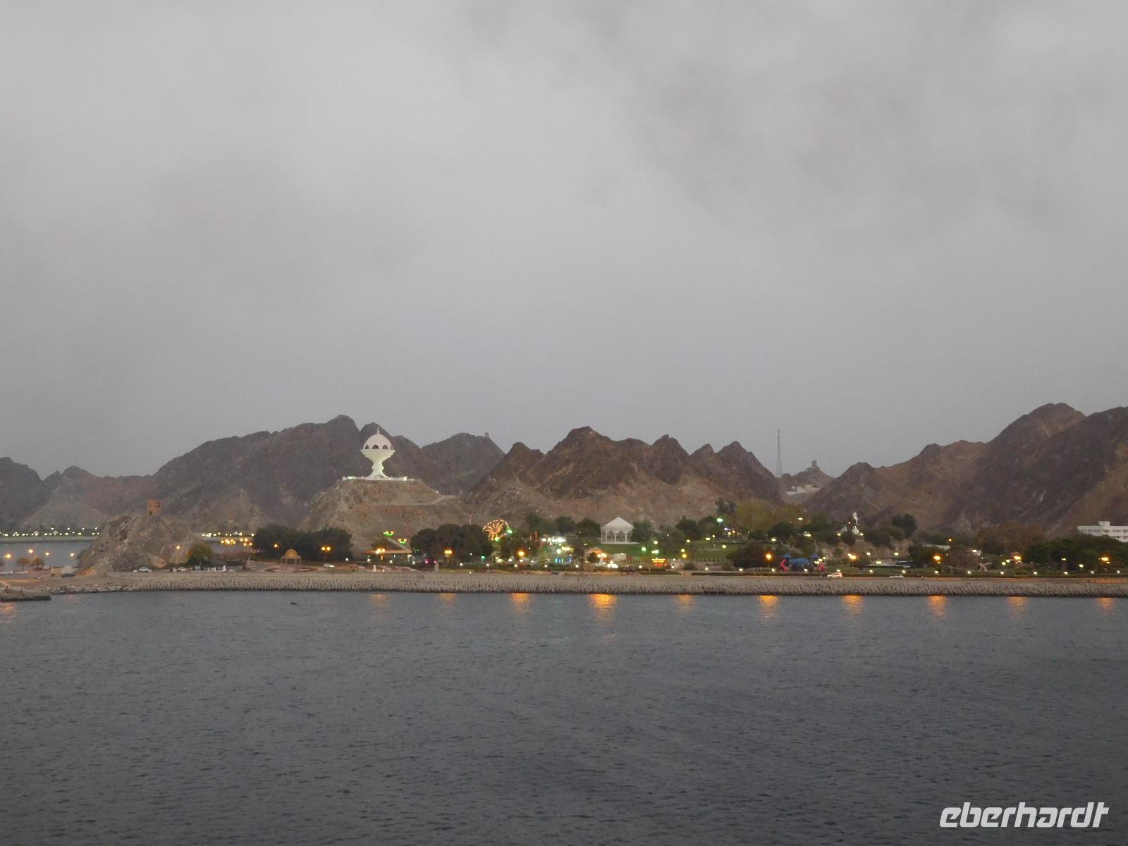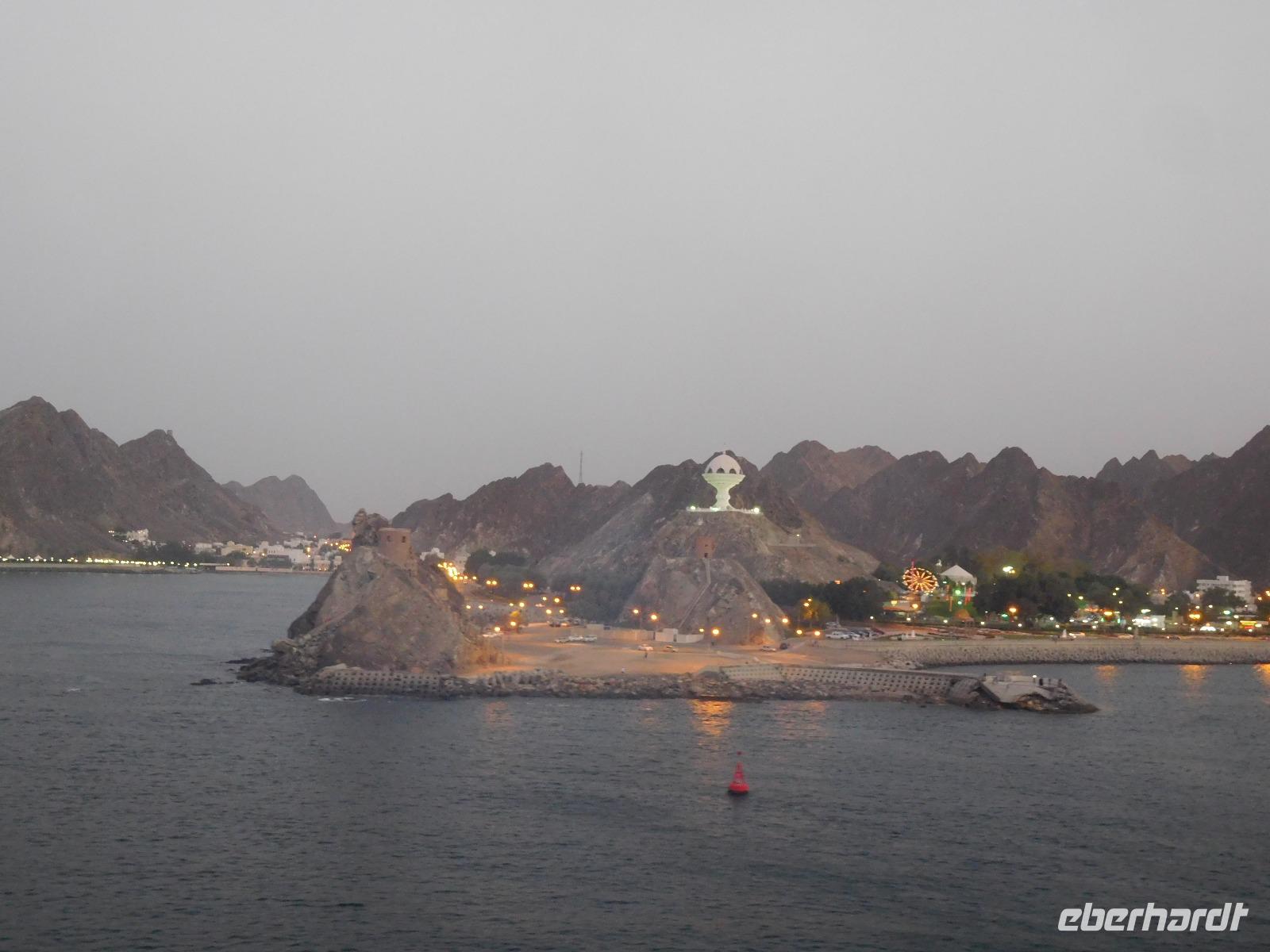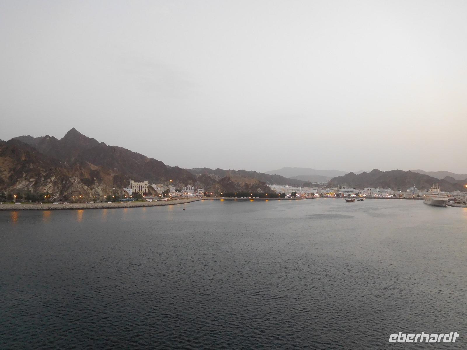 Auf den ersten Blick war klar: Hier waren wir im bisher schönsten Hafen unserer Reise. Wir lagen direkt in der Hauptstadt Muscat, die uns mit weißgetünchten Häusern anstrahlte und von schroffen Felsen gerahmt war.