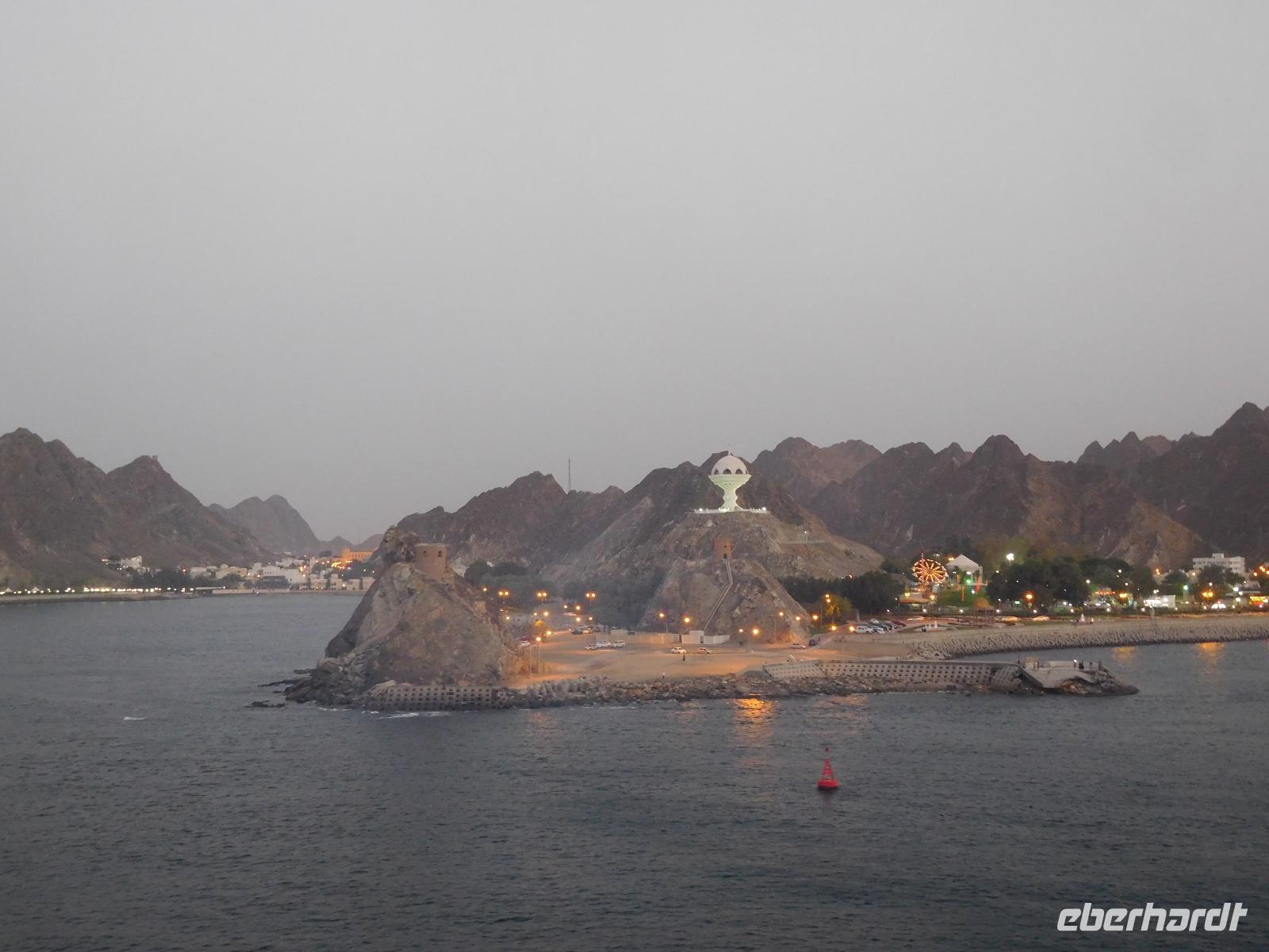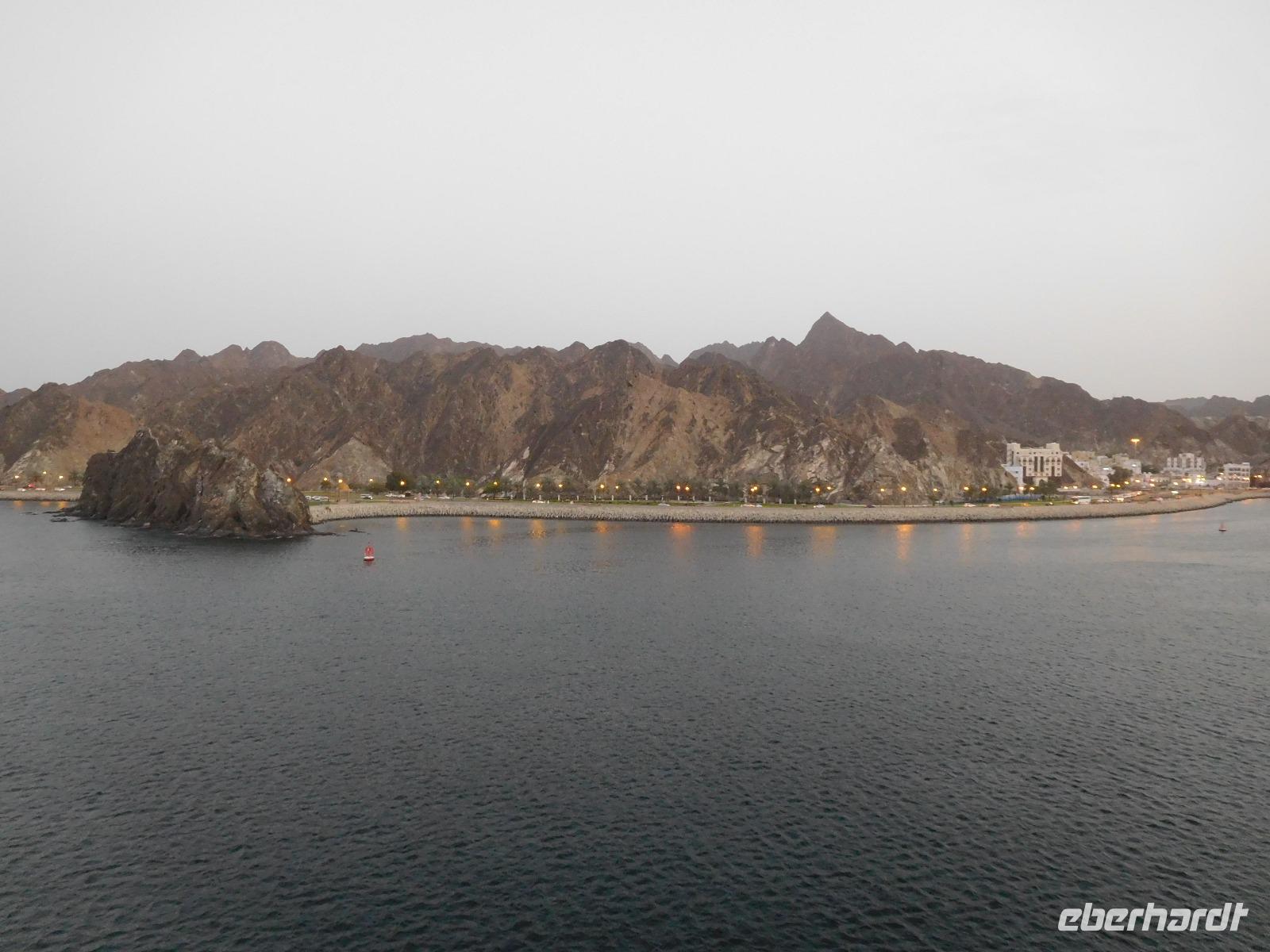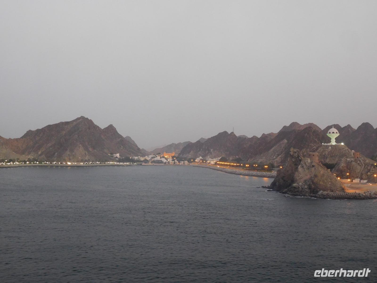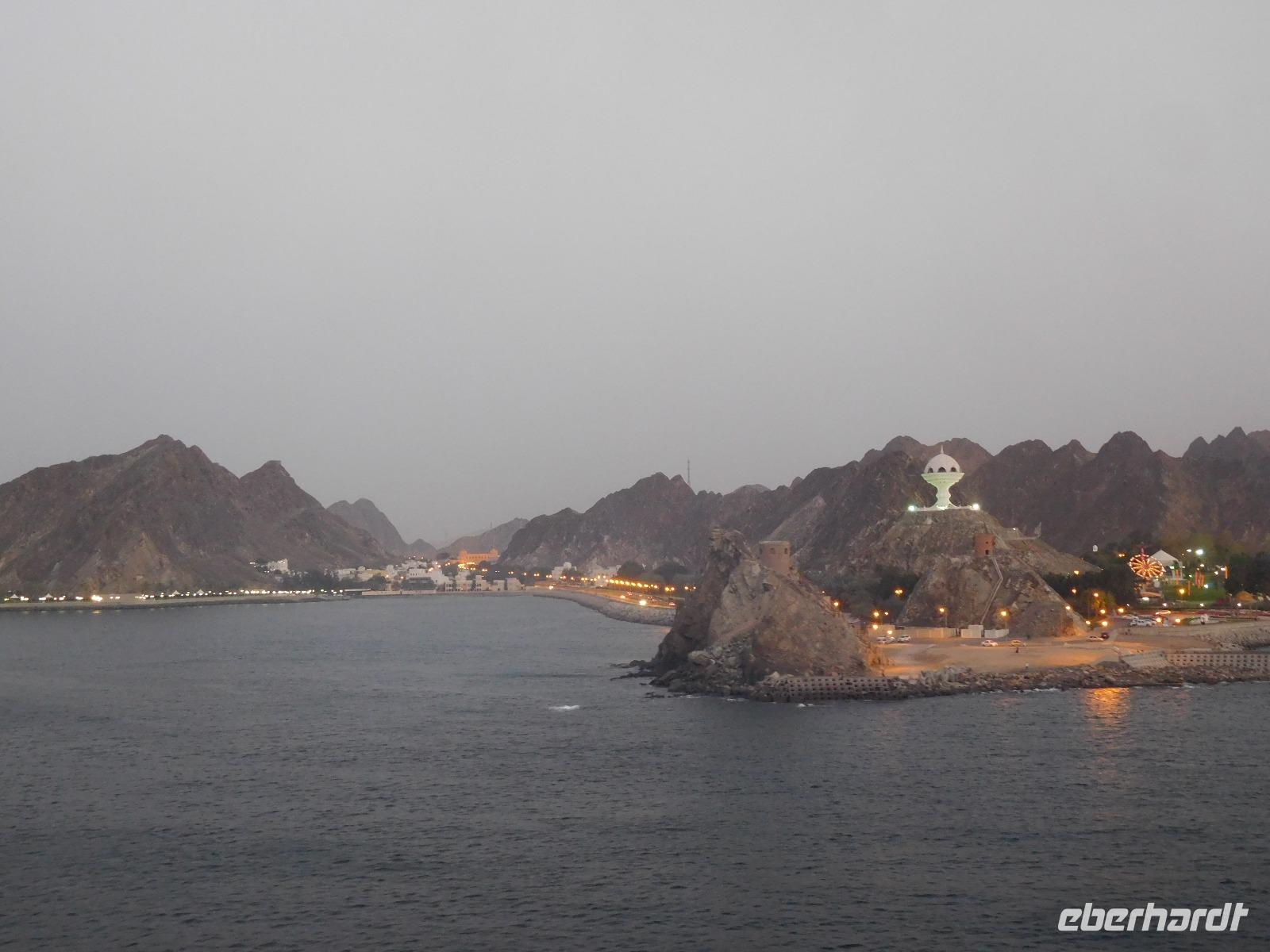 Auf den ersten Blick war klar: Hier waren wir im bisher schönsten Hafen unserer Reise. Wir lagen direkt in der Hauptstadt Muscat, die uns mit weißgetünchten Häusern anstrahlte und von schroffen Felsen gerahmt war.