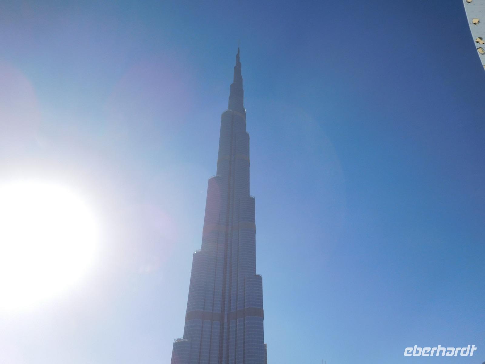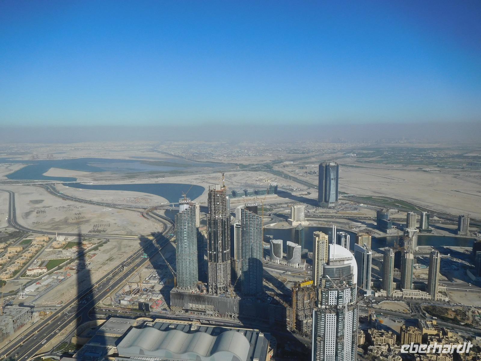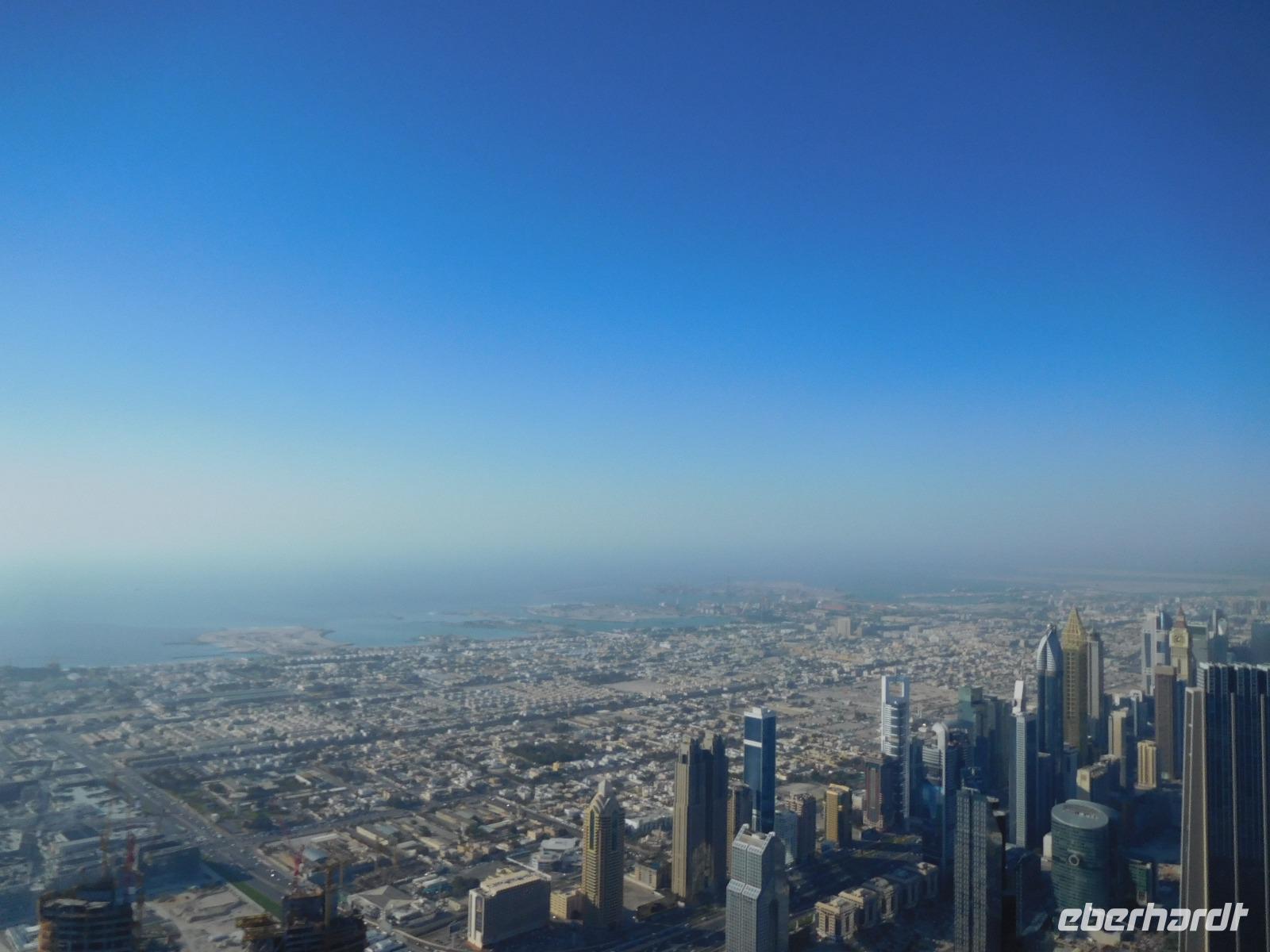 Hoch hinaus ging es anschließend auf dem Burj Khalifa, dem höchsten Gebäude der Welt. Allein auf der Aussichtsplattform auf der 124. Etage konnten wir schon die Millionenmetropole aus Beton und Glas überblicken - und die Spitze unseres Turms immer noch nicht ausmachen!