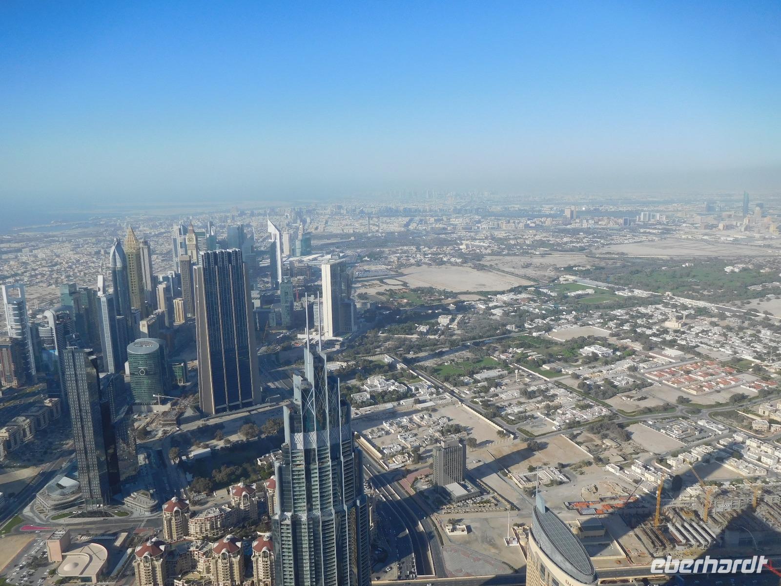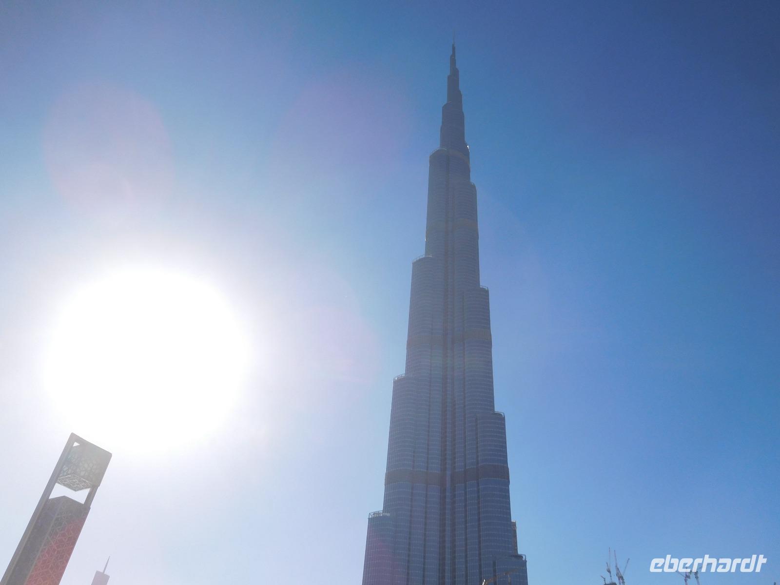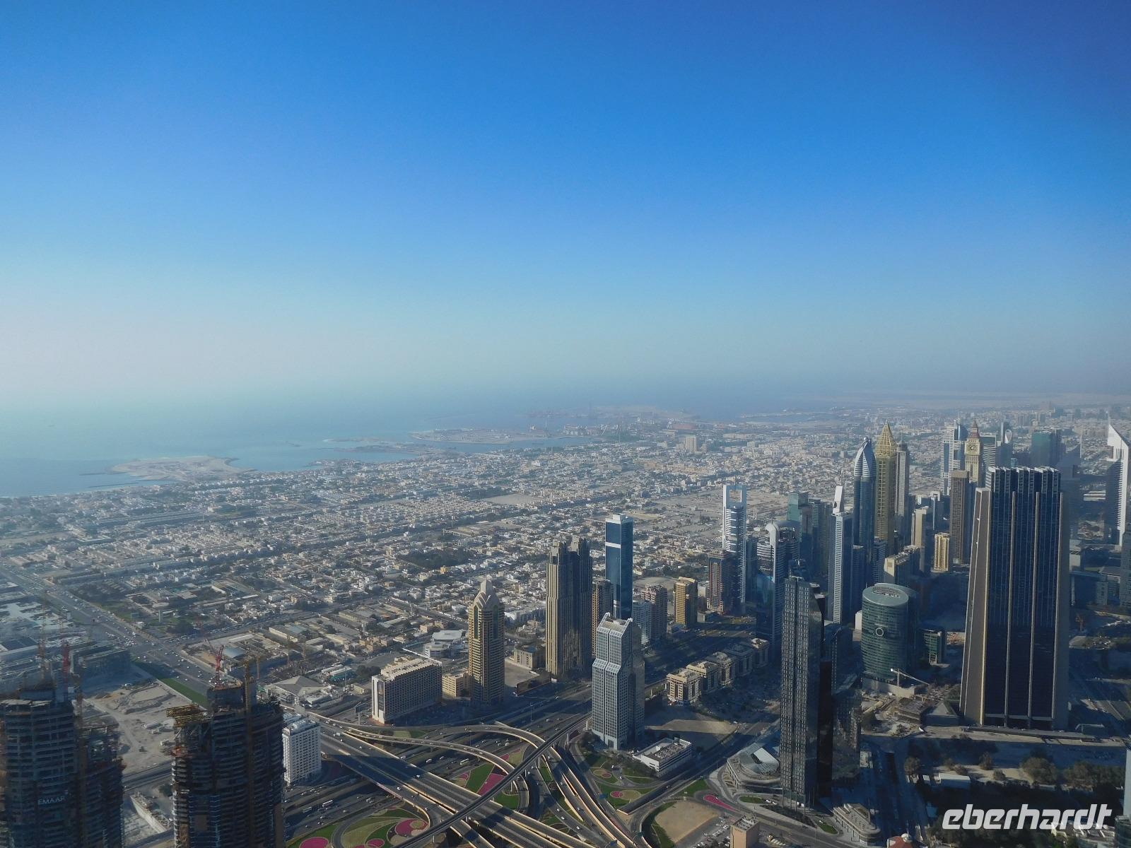 Hoch hinaus ging es anschließend auf dem Burj Khalifa, dem höchsten Gebäude der Welt. Allein auf der Aussichtsplattform auf der 124. Etage konnten wir schon die Millionenmetropole aus Beton und Glas überblicken - und die Spitze unseres Turms immer noch nicht ausmachen!