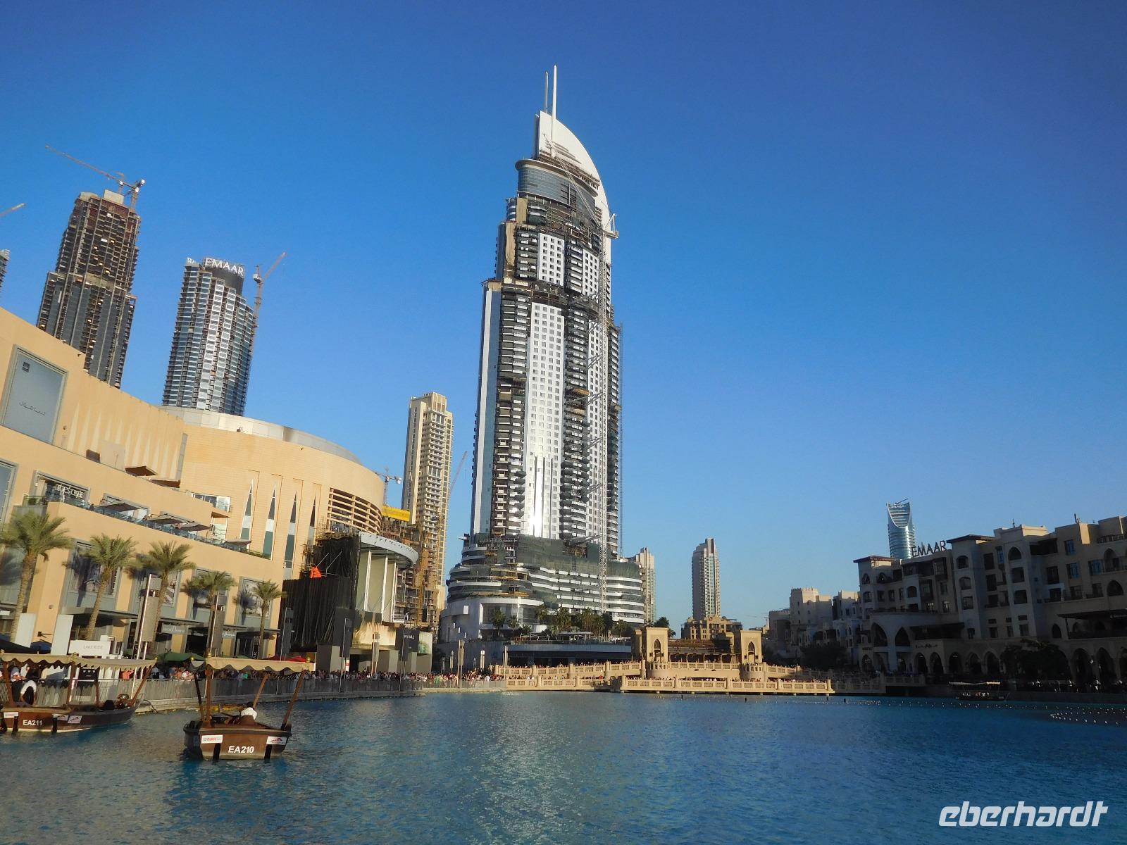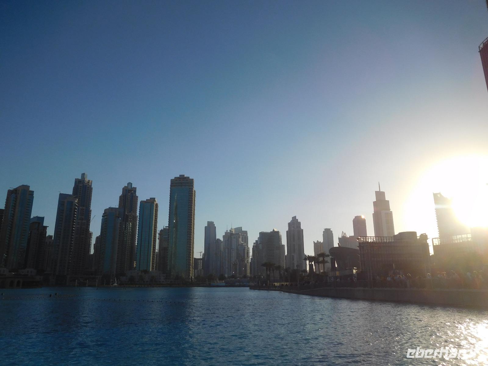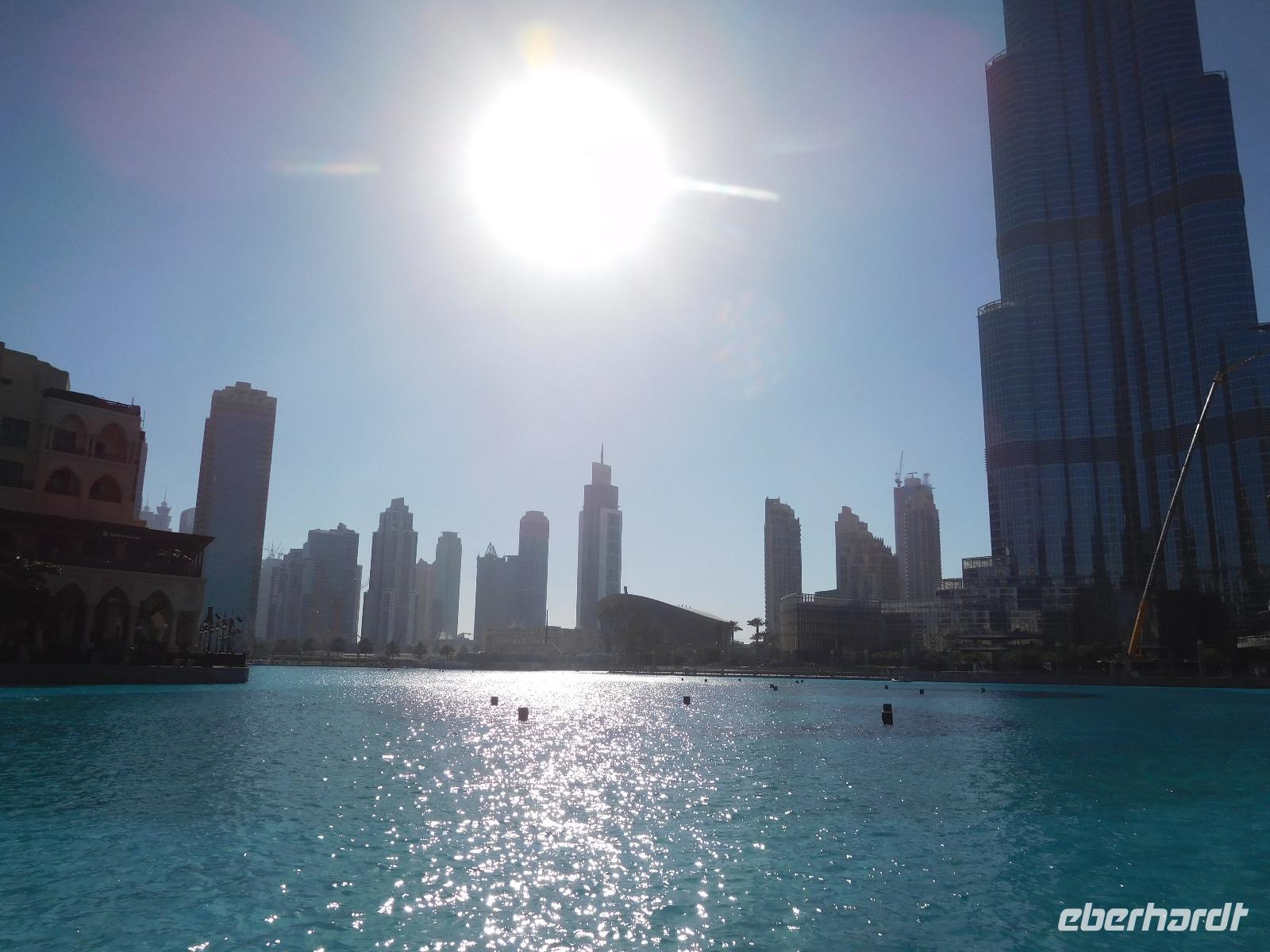 Tief beeindruckt nahmen wir uns nach dieser Auffahrt die Zeit, um die ersten Wasserspiele des heutigen Tages zu sehen, die am Fuße des Burj Khalifa allabendlich mit einer pompösen, mit Musik begleiteten Show, stattfinden.