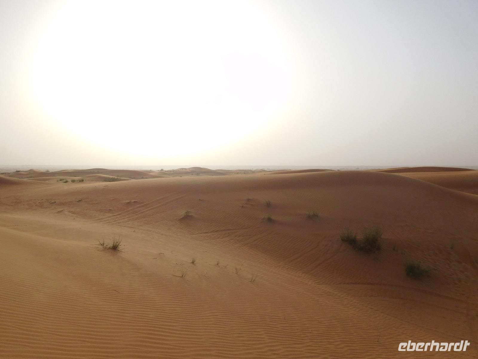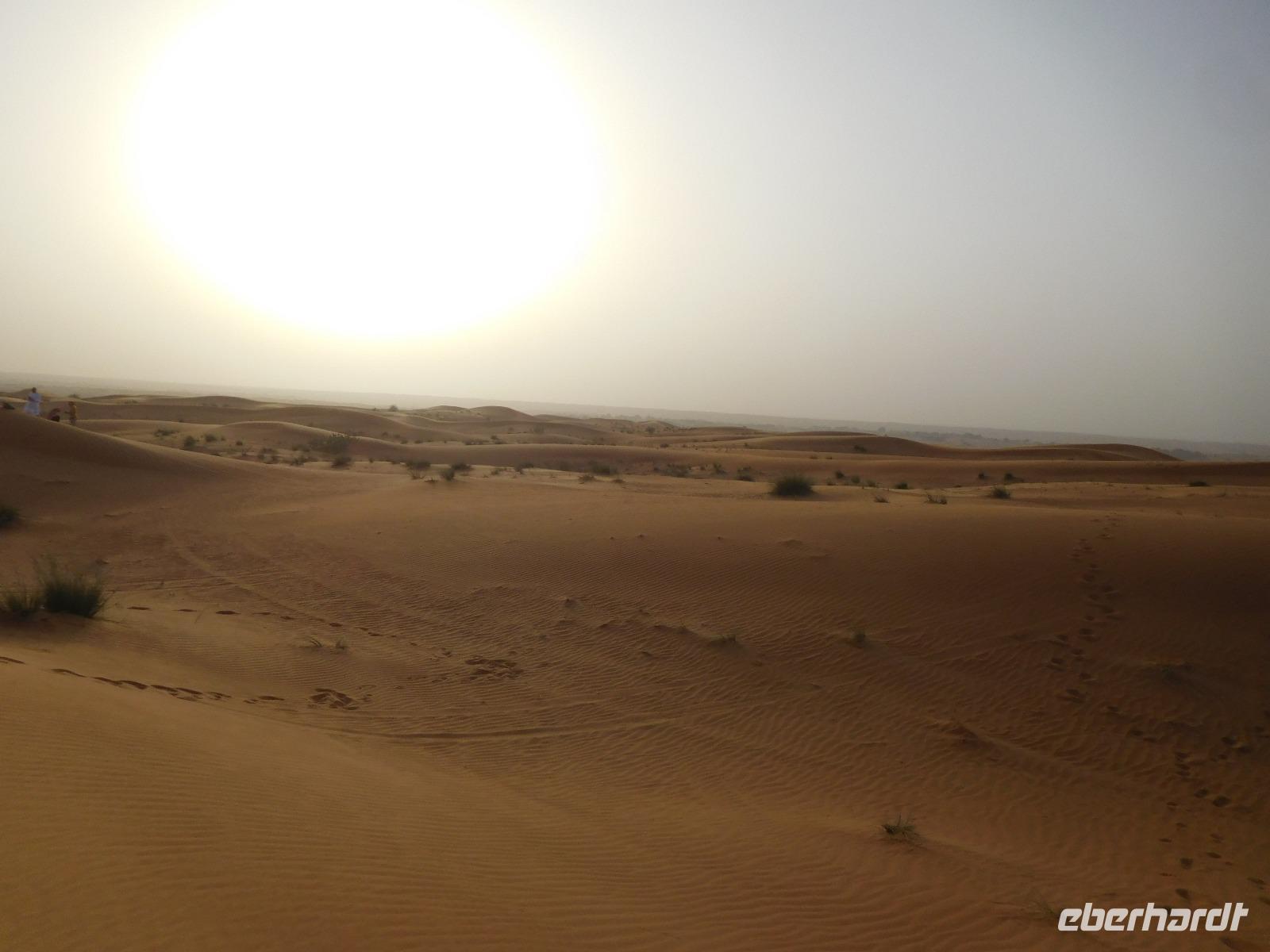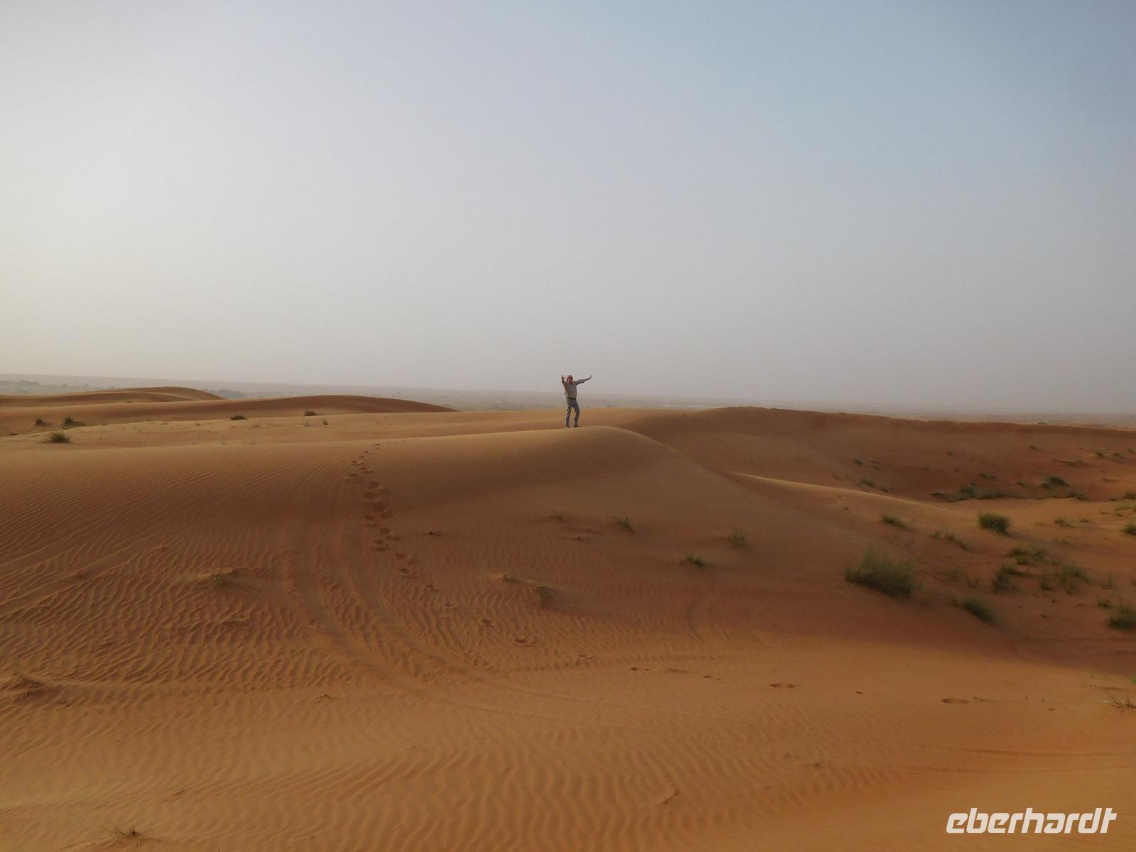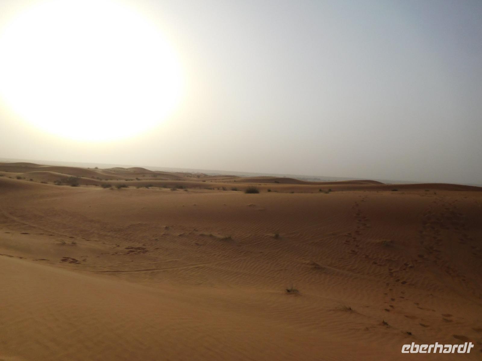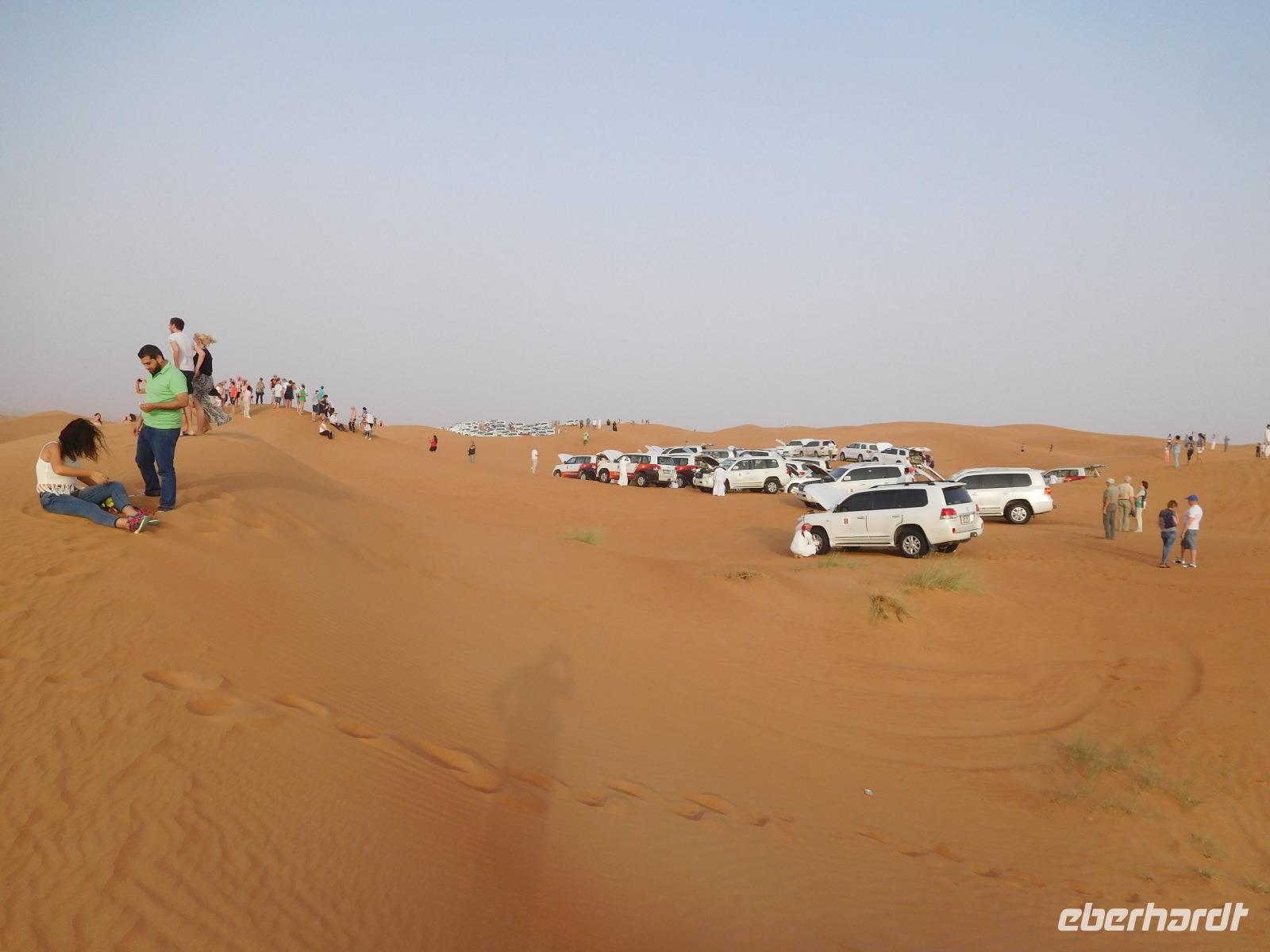 Unsere Reise war aber noch nicht vorbei, denn jetzt ging es in drei Geländewagen in die Wüste! Zwischenzeitlich war von Einsamkeit hier keine Rede, denn ca. 80 weitere Wagen begleiteten uns auf unserem Weg zum Wüstencamp. Glücklicherweise ist die Wüste mit ihrem feinen roten Sand aber so groß, dass auch wir bei den verschiedenen Stopps die Ruhe spüren konnten. Am Abend war der Sand schon erstaunlich kühl, zumindest hätten wir erwartet, dass er deutlich heißer sein würde.