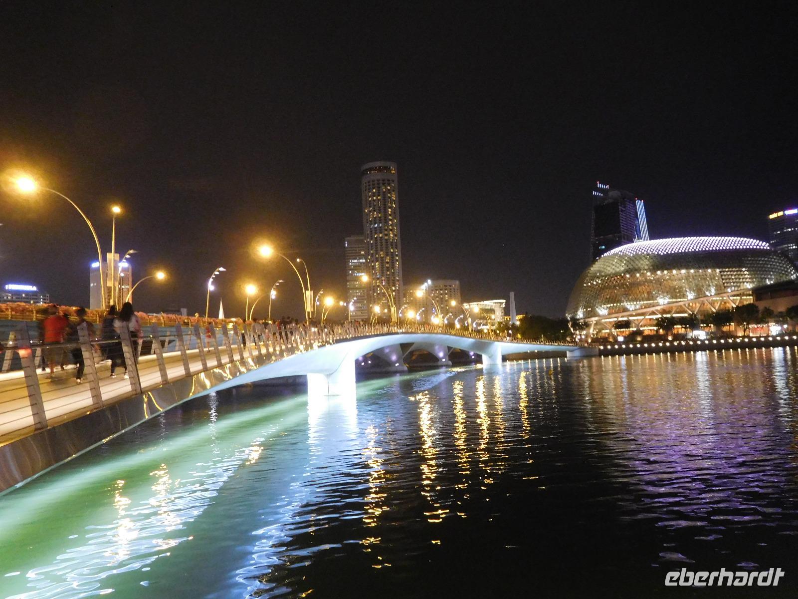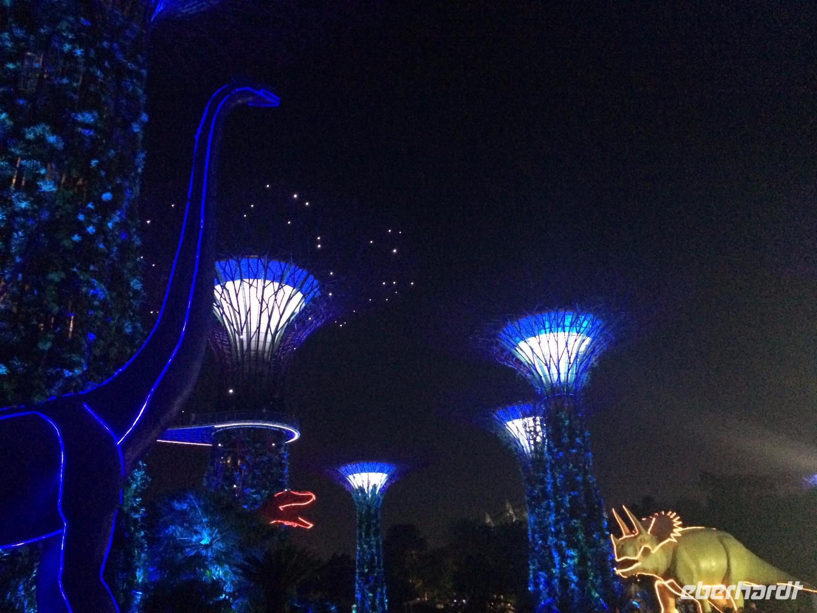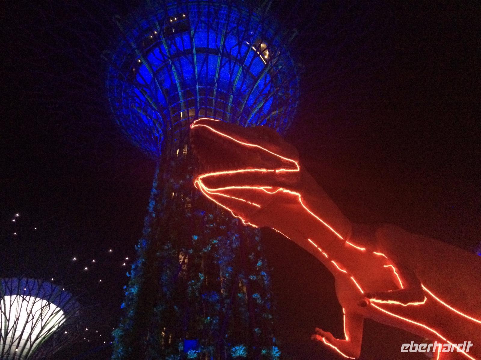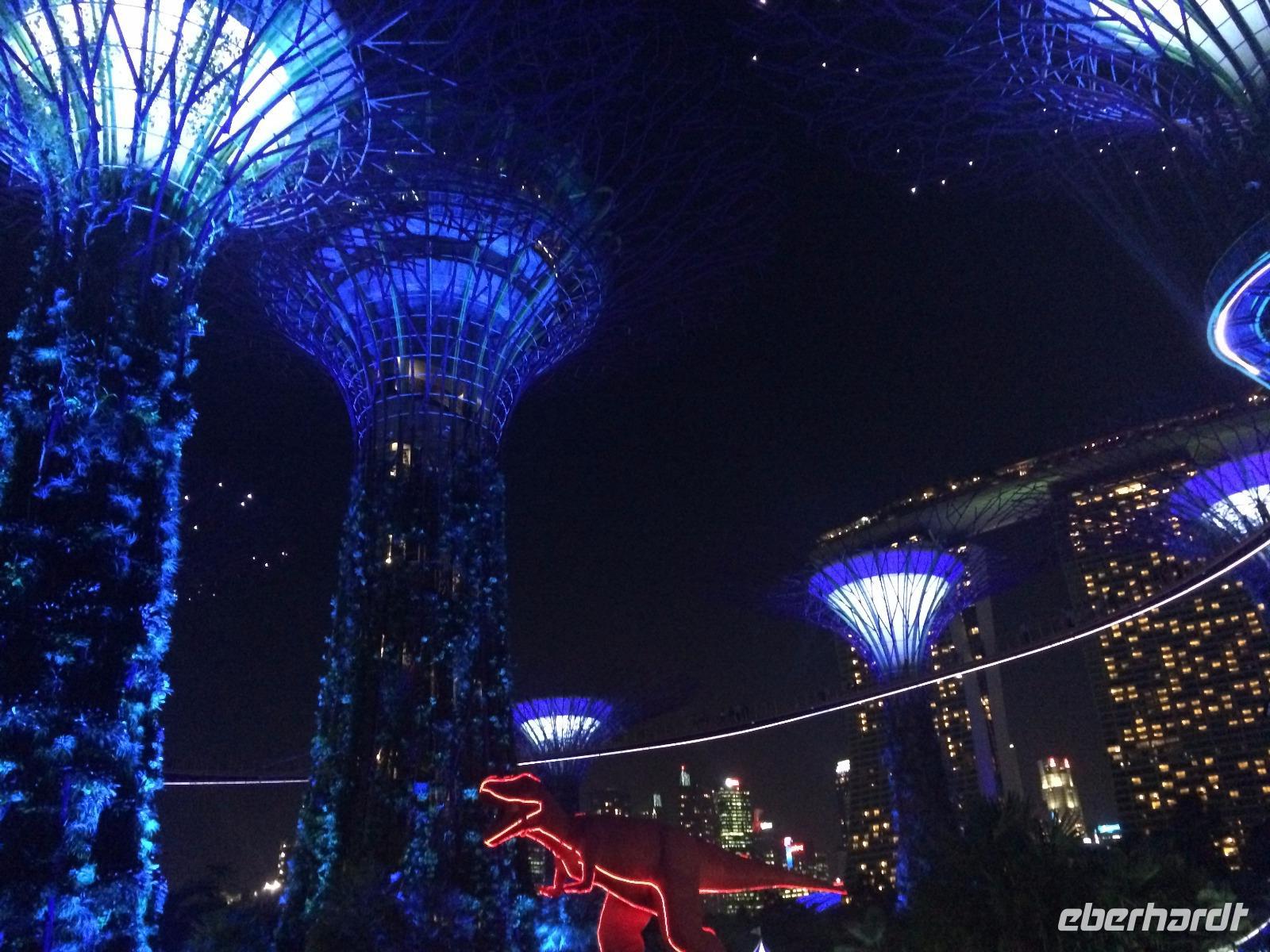 Abends zog es uns noch einmal von Bord, denn wie alles in Singapur lockten auch die Gardens by the Bay mit spektakulärem Lichterglanz. Zwar wurde uns aus Zeitgründen der Skywalk verwehrt, aber die Lichtshow der Supertrees ließ den Frust darüber schnell vergessen.