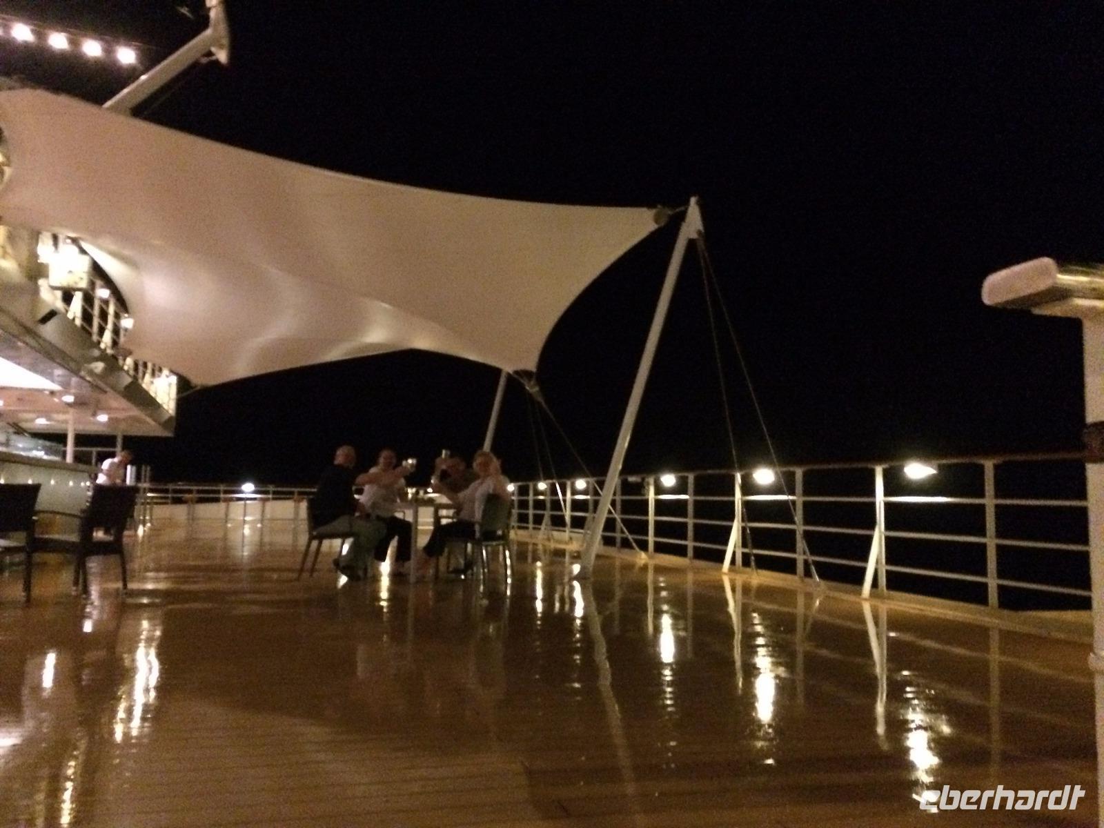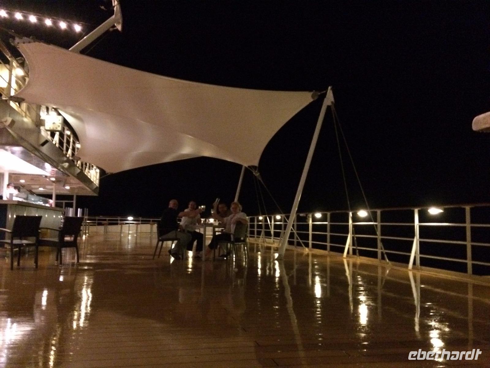 Die Zeit war so schnell verflogen, dass mittlerweile auch das Bergfest unserer Reise erreicht war. Das eigentlich schon früher, aber es an einem Seetag zu begehen, war viel gemütlicher. Und so saßen wir abends in einer schönen Runde an Deck zusammen und probierten uns durch die Cocktail-Karte.