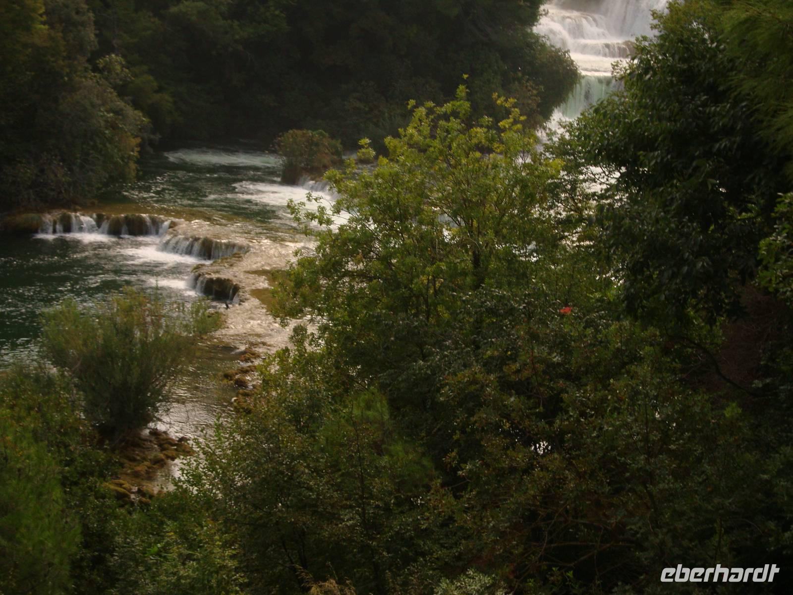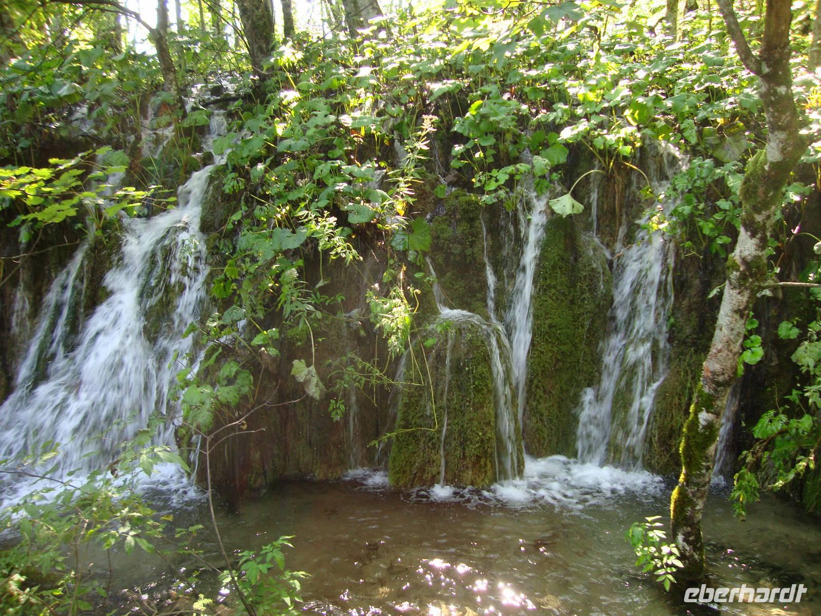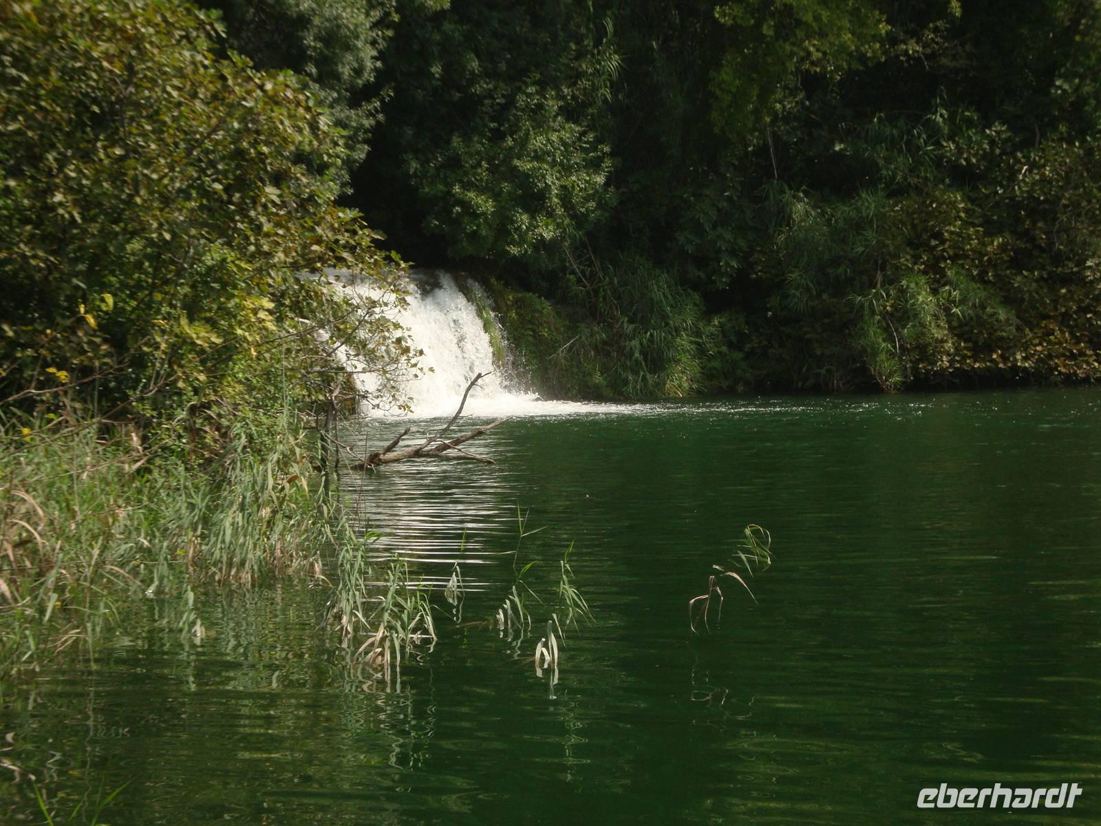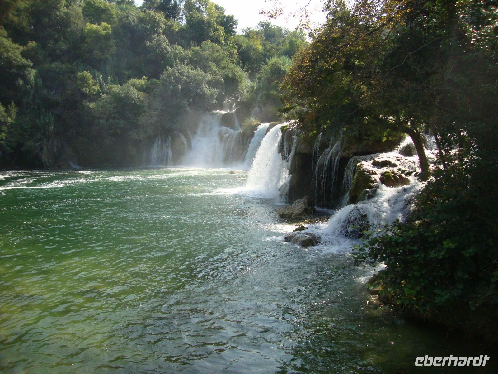 Karst gebirge. Smaragdgrün schimmernde Seen, über Kalkterassen tosendes Wasser, tiefgrüne Badebuchten, Waldwege und Holzstege über Tümpel, in denen sich kleine Fische tummeln, in der Luft Habichte und Falken, die ihre Kreise ziehen: Der über 100 km² große , 1985 gegründete Krka-Nationalpark steht in seiner wilden Schönheit den Plitwitzer Seen nicht nach. All das erlebten wir bei unserer gemeinsamen Wanderung, die bei allen Gästen einen bleibenden Eindruck hinterlies.