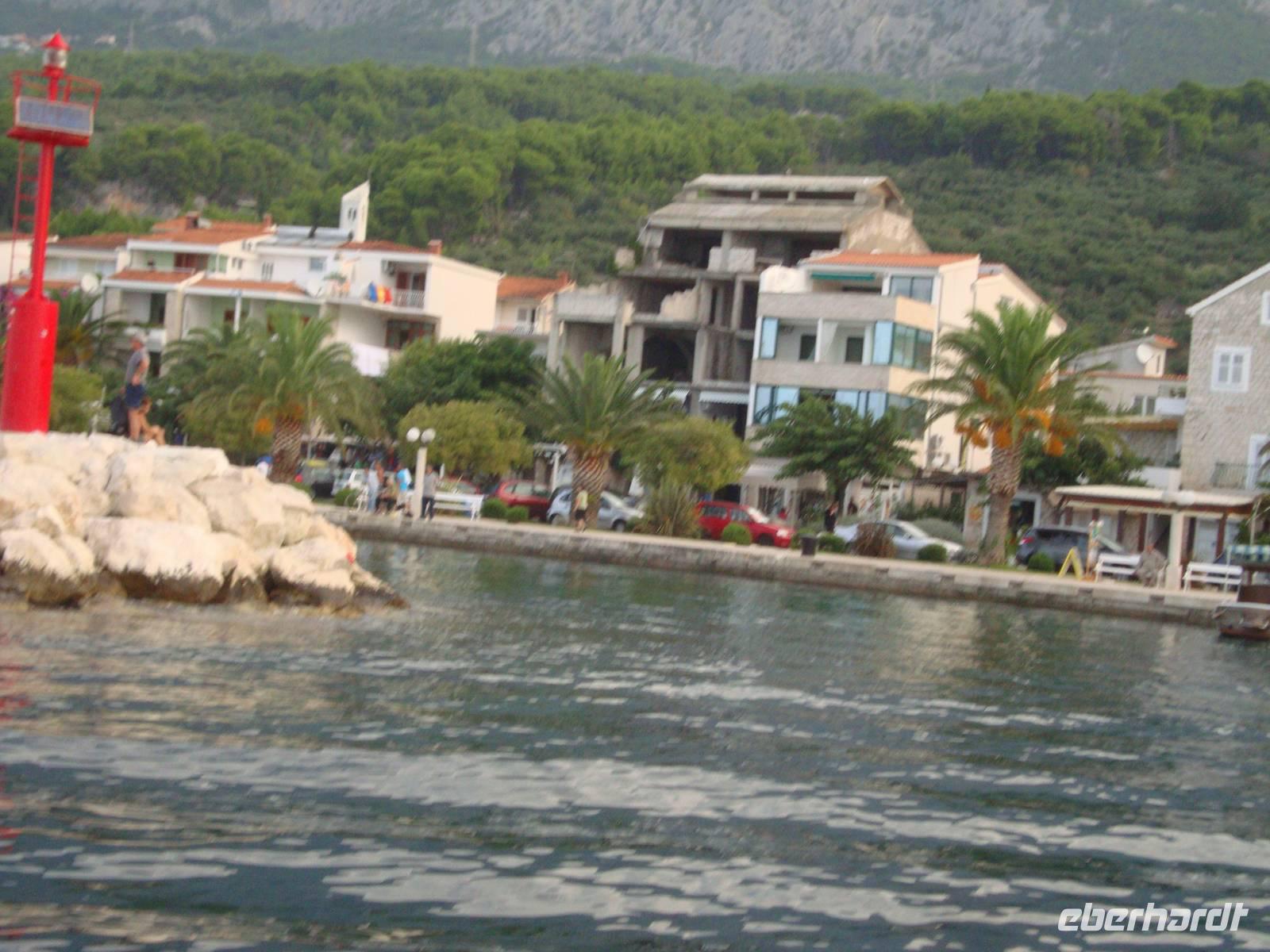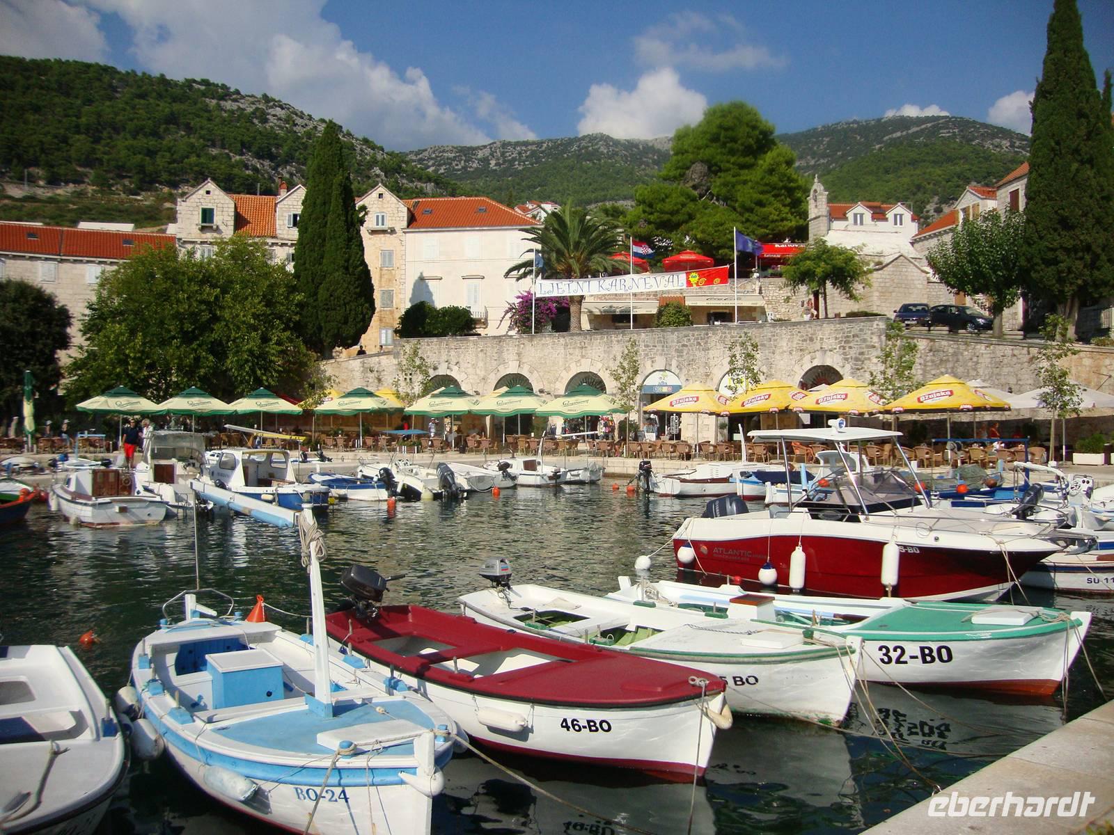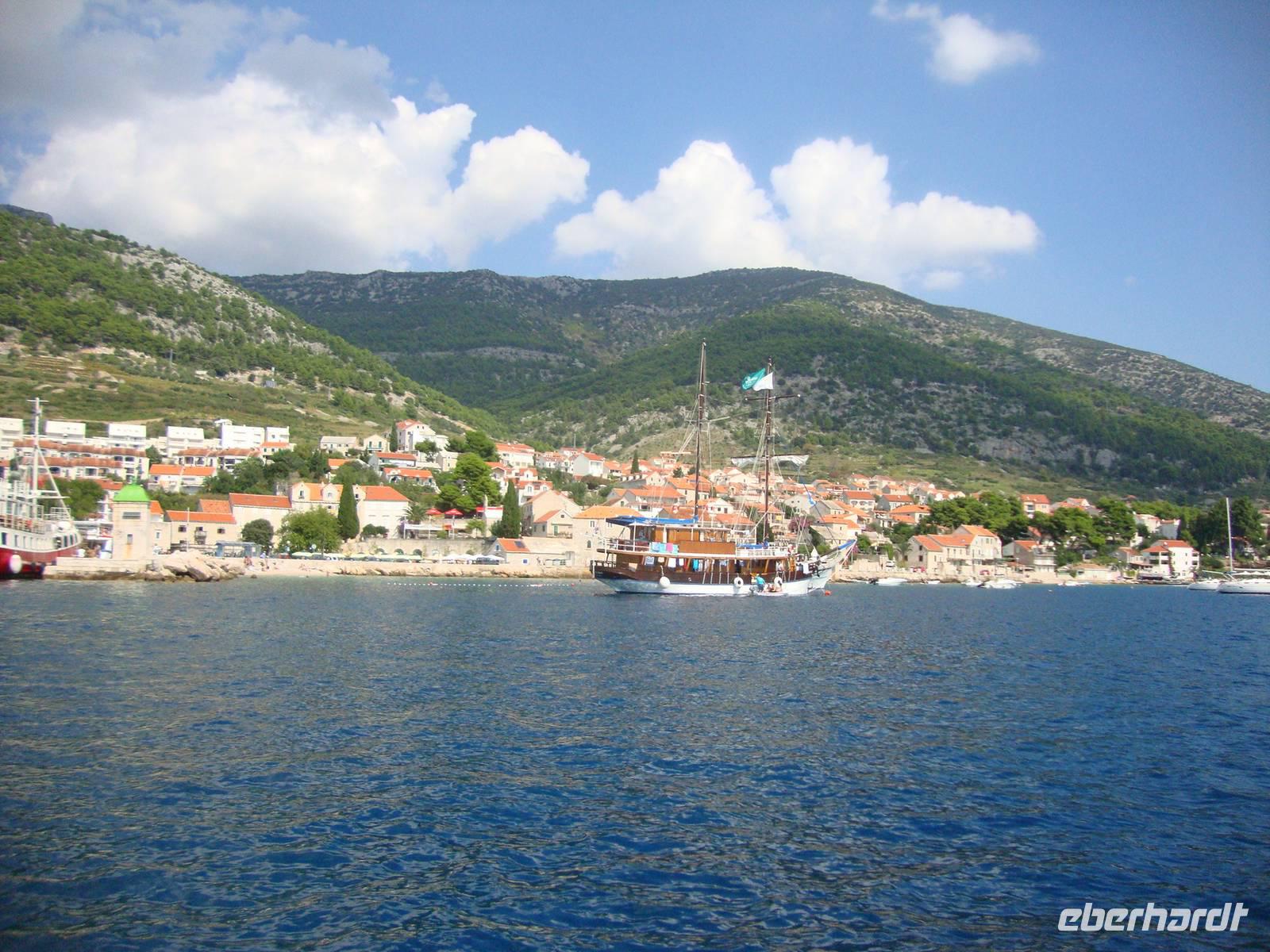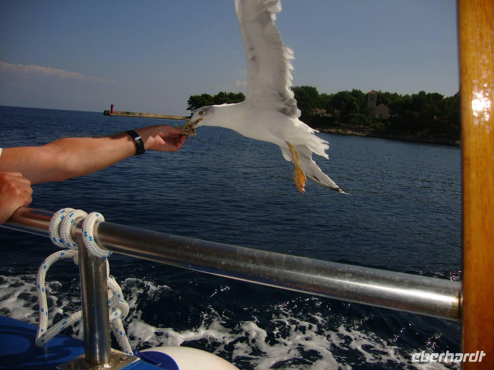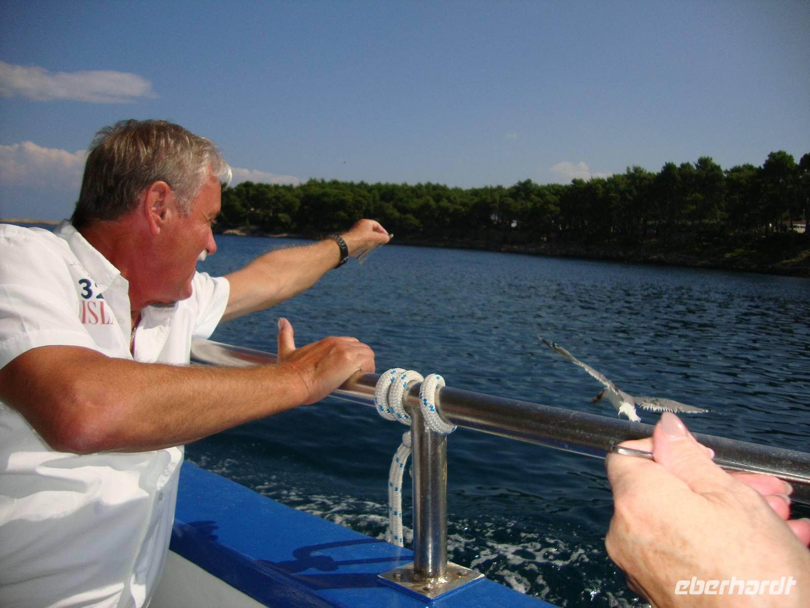 Nach dem etwas zeitigerem Frühstück laufen wir zum Hafen, wo das Ausflugsschiff "Vittorio" auf uns wartet. Wir nehmen unsere reservierten Plätze ein und die Fahrt kann beginnen. Zuerst nimmt der Kapitän Kurs zur Insel Hvar, aber vorher werden alle Gäste mit einem Grappa begrüßt. Die Insel gilt als die schönste der dalmatinischen Inseln und wird jedes Jahr von Urlaubern nahezu gestürmt. In Jelsa, einem kleinen Badeort, machen wir Station. Sonnenüberflutet zeigt sich das kleine Städtchen und wir sehen ein Wasserflugzeug landen und wieder starten. Zur Mittagszeit gibt es frisch gegrillte Makrele, Weßbrot, Tomaten -und Gurkensalat, alles vom Koch, einem Meister seines Faches, frisch und appetitlich zubereitet. Die Möwen erhalten während der Fahrt die Gräten, wie man auf den Bildern sehen kann. In Bol, auf der Insel Brac, haben wir den nächsten Landgang. Die meisten zieht es zum "Goldenen Horn" (Zlatni Rat). Auf einer schattigen Promenade erreicht man diesen Feinkiesstrand nach einer halben Stunde Fußweg. Auf Brac wird der marmorähnliche Kalkstein gebrochen, der für den Bau des "Weißen Hauses" in Washington ebenso verwendet wurde wie für Paläste Venedigs und den Berliner Reichstag. Bei herrlichstem Sonnenschein fahren wir zurück nach Tucepi und legen am frühen Abend im Hafen an. Ein erlebnisreicher Tag geht zu Ende.