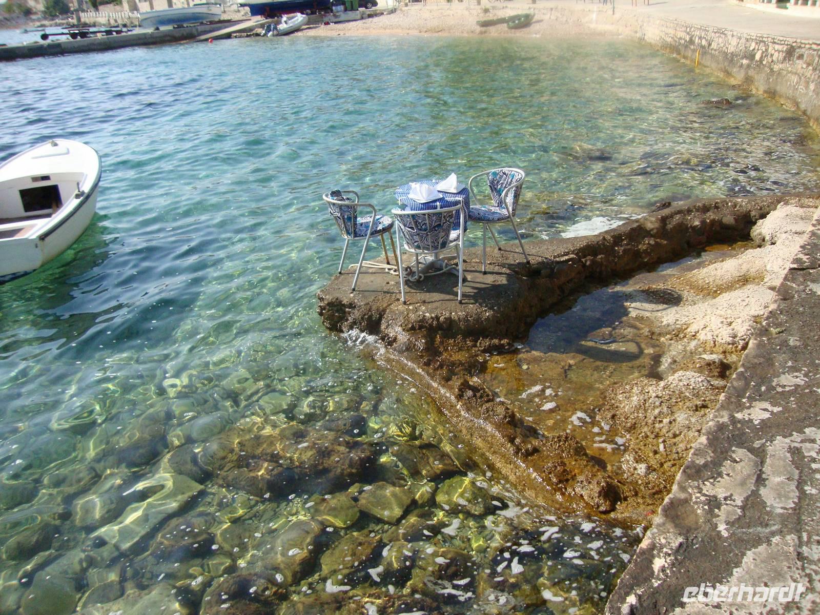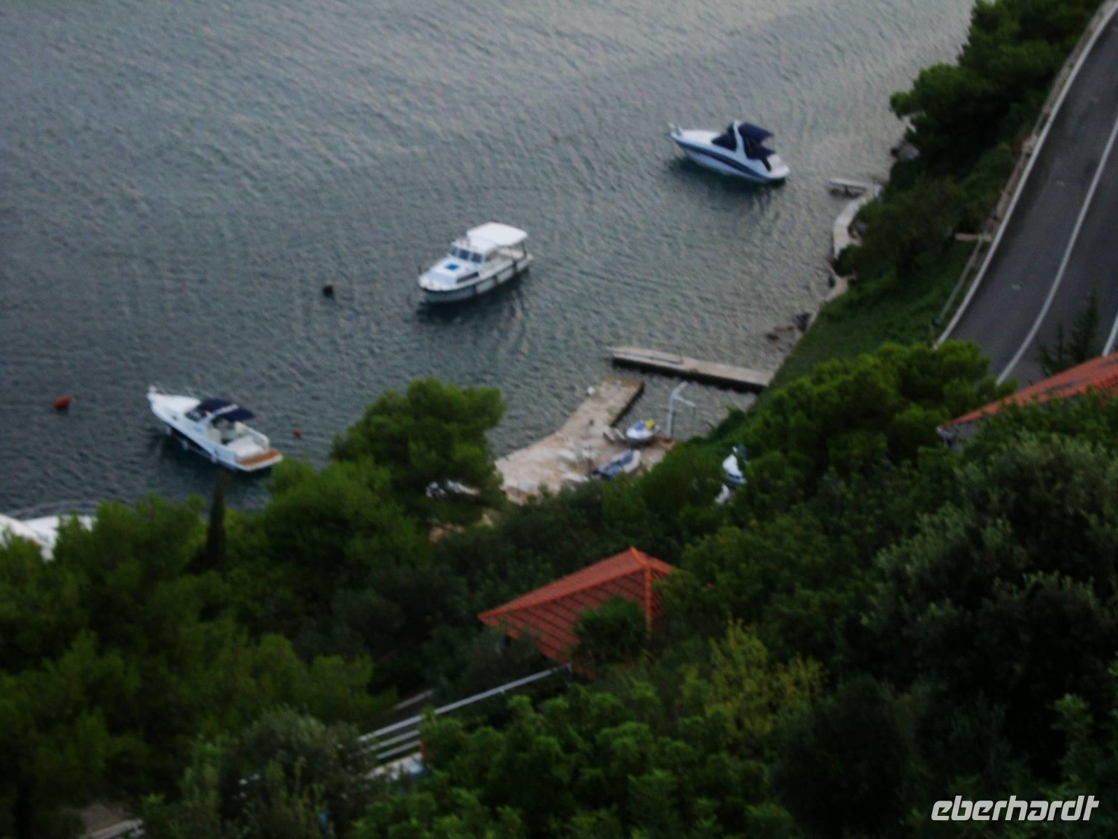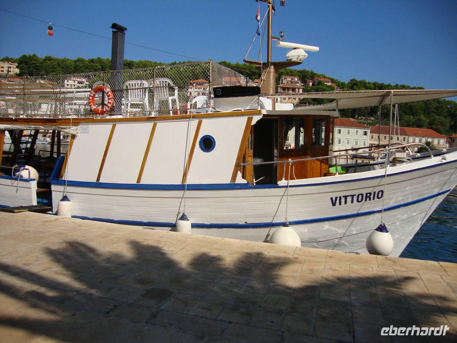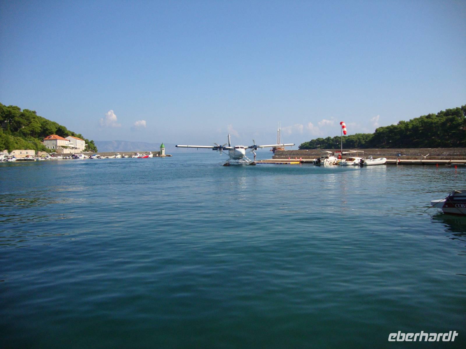 Nach dem etwas zeitigerem Frühstück laufen wir zum Hafen, wo das Ausflugsschiff "Vittorio" auf uns wartet. Wir nehmen unsere reservierten Plätze ein und die Fahrt kann beginnen. Zuerst nimmt der Kapitän Kurs zur Insel Hvar, aber vorher werden alle Gäste mit einem Grappa begrüßt. Die Insel gilt als die schönste der dalmatinischen Inseln und wird jedes Jahr von Urlaubern nahezu gestürmt. In Jelsa, einem kleinen Badeort, machen wir Station. Sonnenüberflutet zeigt sich das kleine Städtchen und wir sehen ein Wasserflugzeug landen und wieder starten. Zur Mittagszeit gibt es frisch gegrillte Makrele, Weßbrot, Tomaten -und Gurkensalat, alles vom Koch, einem Meister seines Faches, frisch und appetitlich zubereitet. Die Möwen erhalten während der Fahrt die Gräten, wie man auf den Bildern sehen kann. In Bol, auf der Insel Brac, haben wir den nächsten Landgang. Die meisten zieht es zum "Goldenen Horn" (Zlatni Rat). Auf einer schattigen Promenade erreicht man diesen Feinkiesstrand nach einer halben Stunde Fußweg. Auf Brac wird der marmorähnliche Kalkstein gebrochen, der für den Bau des "Weißen Hauses" in Washington ebenso verwendet wurde wie für Paläste Venedigs und den Berliner Reichstag. Bei herrlichstem Sonnenschein fahren wir zurück nach Tucepi und legen am frühen Abend im Hafen an. Ein erlebnisreicher Tag geht zu Ende.