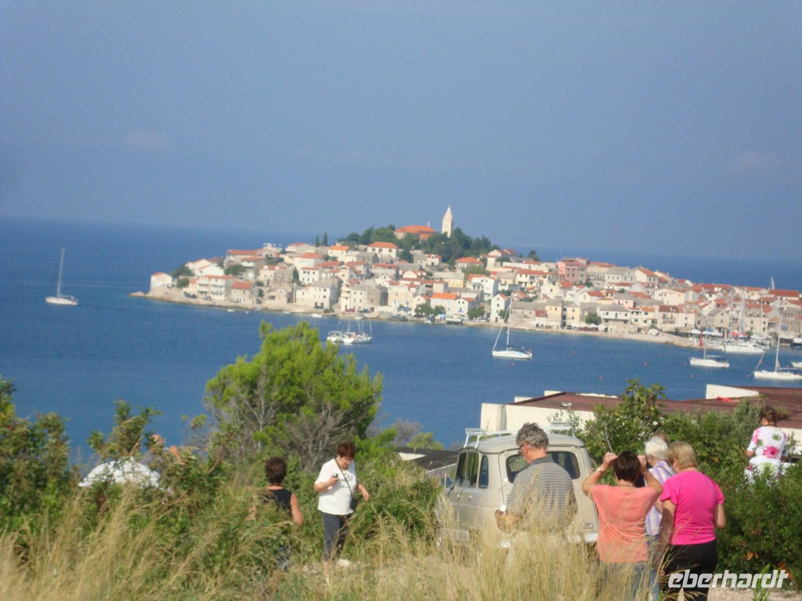 Wir nehmen Abschied von Petrcane und fahren entlang auf einer der schönsten Küstenstraße der Welt: der "Jadranska Magistrala" Richtung Süden. Wir passieren die schönen Badeorte und machen den ersten Stop an der Krka - Brücke vor Sibenik, ein imposanter Anblick, wie die Krka in die Adria mündet. Eigens Halteplätze sind eingerichtet, für den Blick auf Primosten, einem Bilderbuchstädtchen am Meer. Auf dem Inselhügel staffeln sich dicht gedrängte Steinhäuser um das Kirchlein Sveti Juraj mit seinem weißen Campanile, und alles ist umgeben vom tintenblauen, mit weißen Segeln gepunkteten Merr. Ein Bild des Friedens und der Anmut. Gegen Mittag erreichen wir Trogir, wo wir von unserer Gästeführerin Suzi herzlich in Empfang genommen werden. Auf einer Insel gelegen, nur durch je eine Brücke mit dem Festland und der Insel Ciovo verbunden, hat sich die historische Altstadt von Trogir ihren mittelalterlichen Charakter bewahrt.