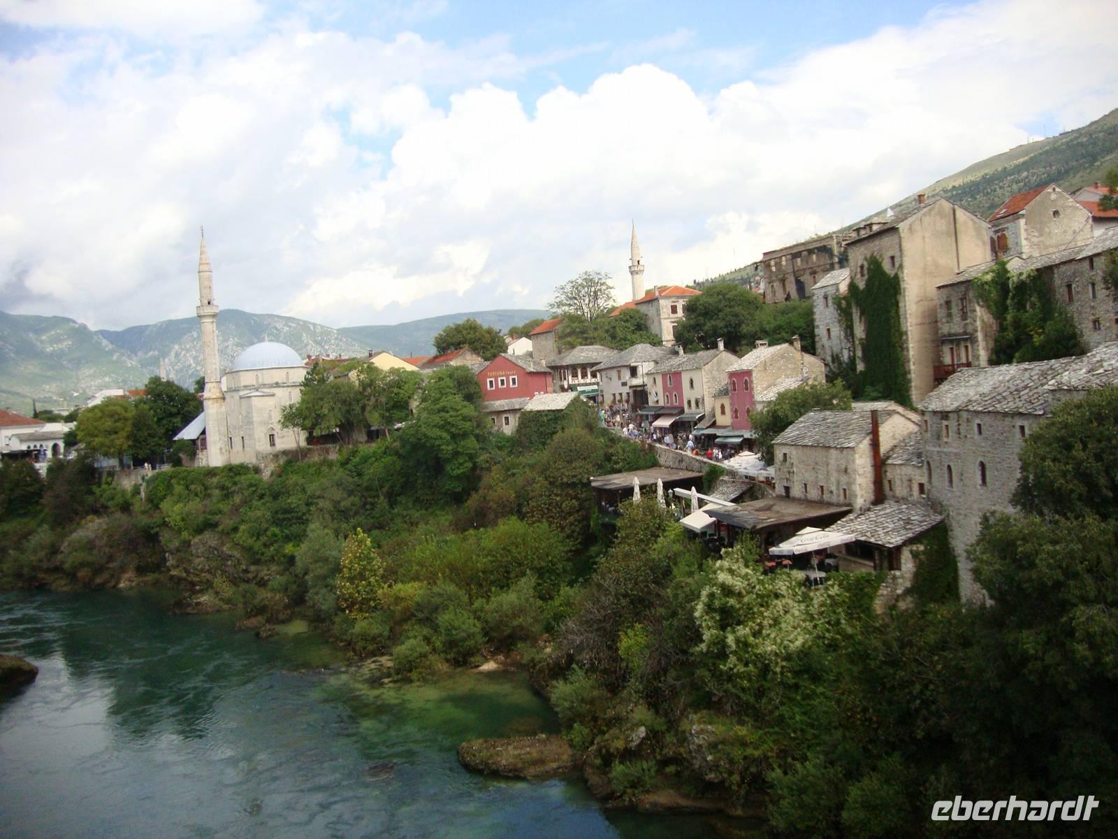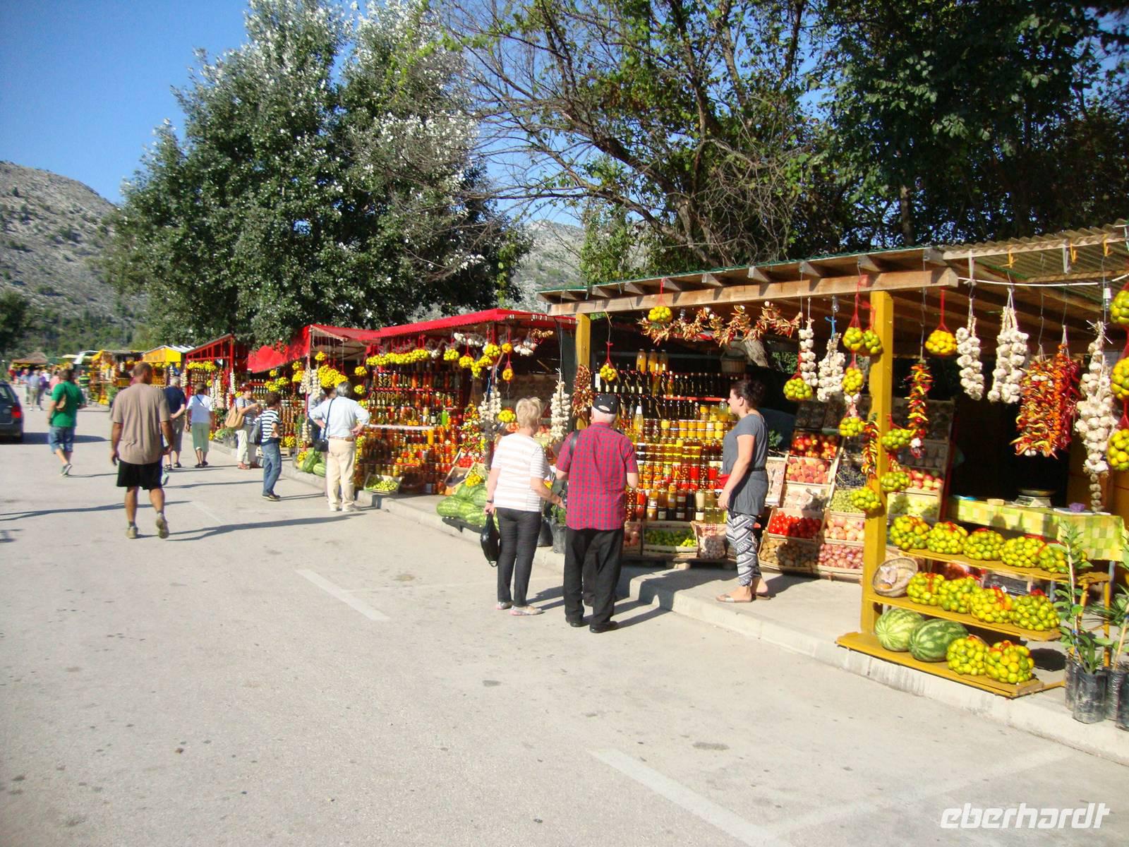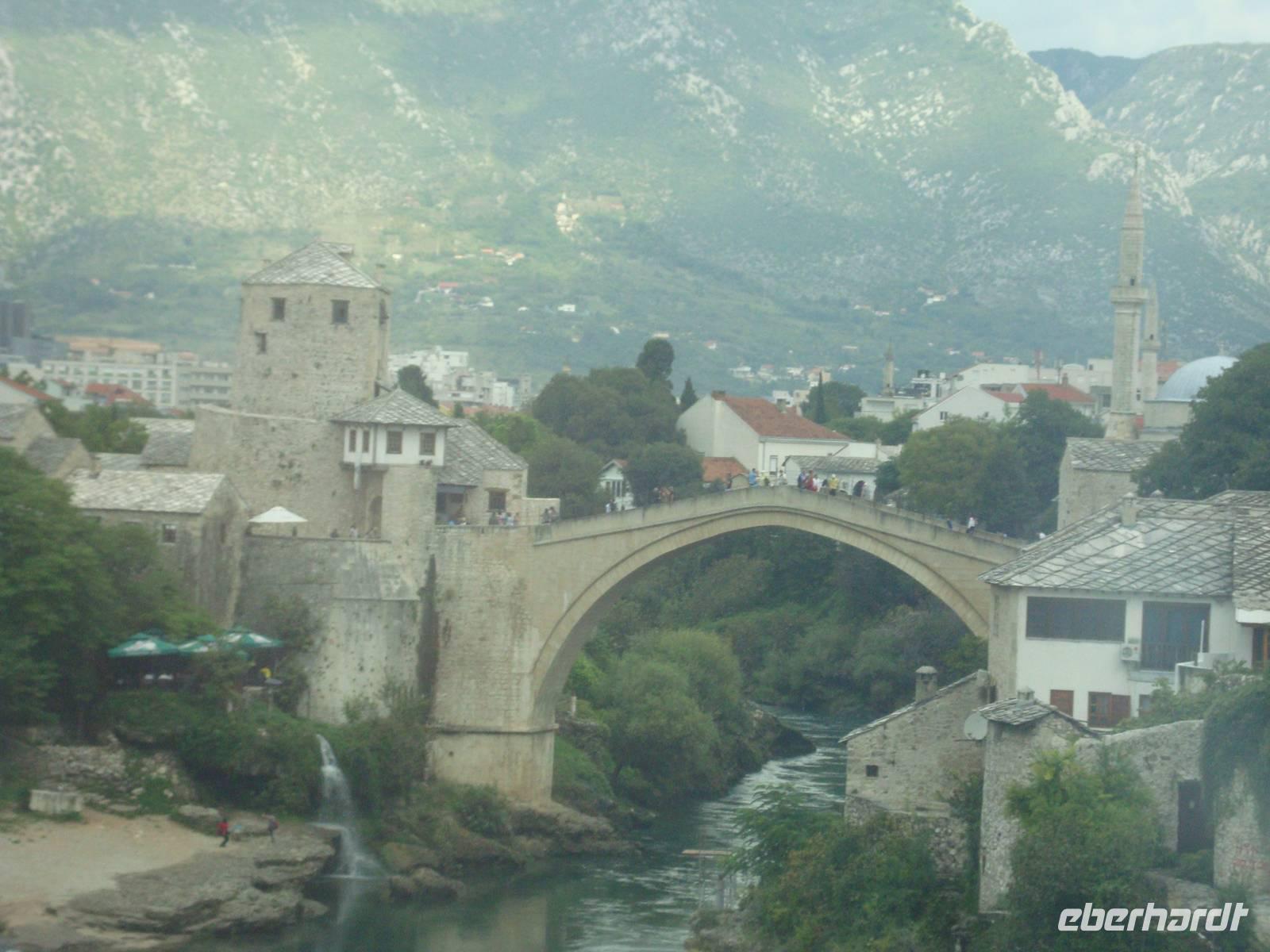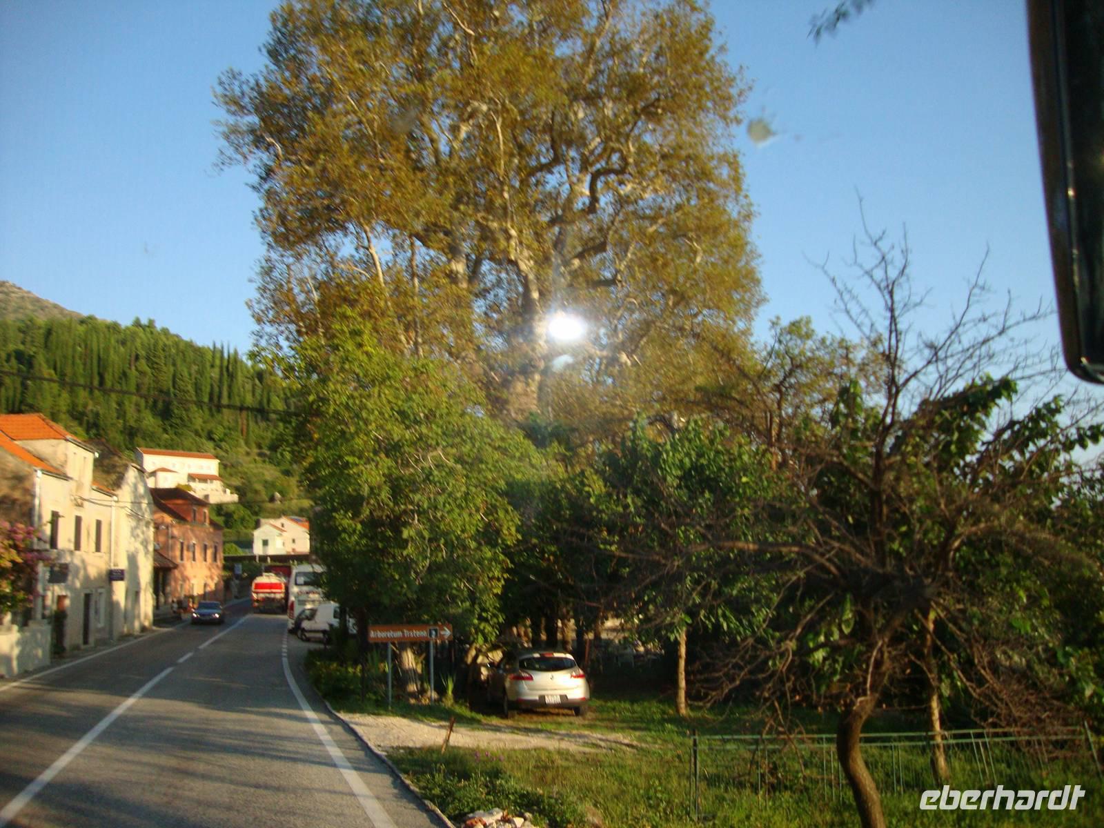 Als wir am Morgen um 08.00 Uhr in Mlini starten, scheint die Sonne wieder, so als hätte es kein Unwetter gegeben. In Neum, am Hotel, machen wir die erste Pause. Bald sind wir in Metkovic und dort haben wir die Grenzformalitäten zur Einreise in die Herzegowina zu erledigen, ich sammle alle Pässe ein und gebe sie zur Kontrolle ab. Dieses Mal ging es recht zügig und wir warteten nur eine halbe Stunde. Am Mittag erreichen wir Mostar. Wahrzeichen der Stadt ist die osmanische Brücke "Stari Most" über die Neretva. 1566 war die 27 m lange Einbogenkonstruktion vom Architekt Mimar Hajrudin errichtet worden - ein Meisterwerk der Ingenieurkunst. 1993 wurde sie zerstört und dann wieder aufgebaut, 2005 in die Weltkulturerbeliste aufgenommen. Alima, unsere Begleiterin, führt uns in die Türkische Moschee und das alte türkische Haus. Die Franziskanerkirche, mit ihrem schlanken Turm erinnert an einen Campanile. Die Zeit vergeht recht schnell, aber es werden auch noch einige Erinnerungsstücke mit genommen. Am Nachmittag sind wir zu Gast in der "Villa Neretva", wo wir mit dalmatinischen Spezialitäten verwöhnt werden. Zur Fahrt an die Makarska - Rivera machen wir noch einen Stop in Opuzen, an den zahlreichen Ständen, an denen die Frauen aus dem Neretva Tal die Produkte, wie Mandarinen oder Olivenöl u.a. anbieten.