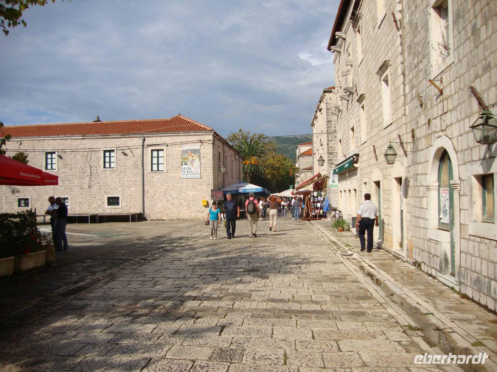 Am Morgen, als wir unseren Trip nach Dubrovnik starten, scheint die Sonne. Ivana, unsere Gästeführerin empfängt uns am Pile-Tor und wir beginnen unseren Stadtrundgang. Es sind viele Reisegruppen unterwegs, um die Altstadt, zum Weltkulturerebe zählend, zu besichtigen. Nach einer Stunde ziehen dunkle Wolken auf und zum Wolkenbruch entlädt sich der Himmel. Im Nu steht der Stradun, die Hauptstrasse, unter Wasser und wir finden Unterschlupf am Eingang zum Museum. Die Kathedrale, Velika Gospa, soll im Jahre 1192 von Richard Löwenherz gestiftet sein. Aber leider fällt dieser Tag buchstäblich ins Wasser. Als uns Marino um 15.30 Uhr abholen will, kann er nicht da sein. In Kupati steht die Straße und die Wiesen unter Wasser. Abends, im Regionalfernsehen, kann man das Ausmaß des Unwetter sehen. Unser Hotel ist auch in Mitleidenschaft gezogen, das Wasser tropft von der Decke im Speisesaal und viele Zimmer im Erdgeschoß sind nicht mehr bewohnbar. Schade, das dieser Tag so viel Unvorzusehendes bringt und so endet.