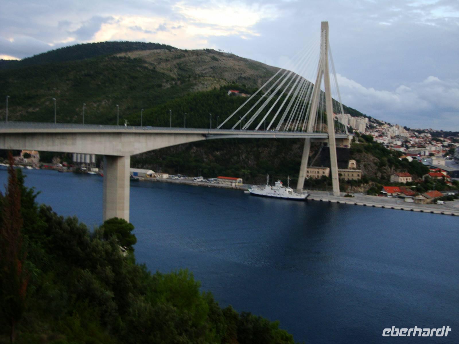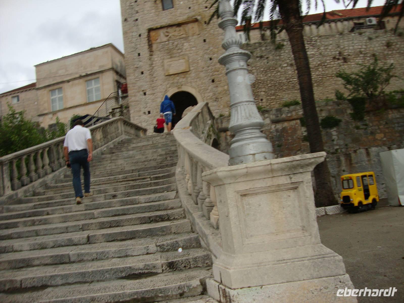 Nach dem ersten Frühstück im Hotel "Astarea" begeben wir uns auf den Weg zur Halbinsel Peljesac, der zweitgrößten Kroatiens. Eine mächtige Befestigungsmauer auf halber Höhe der kahlen Karstberge, und dann gleich eine zweite, noch massivere, als Stadtbefestigung, das ist die Festung Ston. Die Republik Ragusa lies diese ab dem 14.Jh. errichten. Gebaut wurde bis zum Ende des 15.Jh., dann war das nach der chinesischen Mauer weltweit größte Befestigungswerk fertig: 5,5 km lang, mit 41 Wehrtürmen und sieben integrierten Bastionen. Das nahmen wir natürlich bei unserem Aufenthalt in Augenschein. Während der Fahrt nach Orebic kamen wir auch vorbei and den Salinen, in denen seit Jahrhunderten das "weiße Gold", das Salz gewonnen wird. Es war im Mittelalter die einzige Möglichkeit Fleisch haltbar zu machen, indem man es in Salzlauge pökelte. Am Fährhafen nach Korcula angekommen, begann es zu regnen, aber zum Glück mußten wir nicht lange warten bis zur 20 minütigen Überfahrt mit der "Lovor". Auf Korcula wurden wir von Stanka, unserer Gästeführerin, herzlich empfangen. Vom Fährhafen führt eine breite Freitreppe zum Landtor, von dem in wenigen Schritten der zentrale Platz mit der Kathedrale Sveti Marko erreicht ist. Stanka führt uns durch die engen Gassen bis zum Haus, in dem der berühmte Weltreisende Marco Polo geboren sein soll. Immer wieder regnet es und wir müssen Unterschlupf suchen, um nicht durchnäßt zu werden. Am Nachmittag überqueren wir mit der Fähre die Enge zwischen Korcula und Peljesac in 25 Minuten, denn eine kleine "Bora" beginnt zu stürmen. Als WOW halten wir im Weingut "Matusko", um die bekannten Weine Dingac, Postup und Plavac zu probieren. Auch ein Grappa zum Abschluß ist von ausgezeichneter Güte. Ehe wir Dubrovnik erreichen halten wir zum Fotostop vor der Dr. Franjo-Tudjman-Brücke, einem imposanten Bauwerk, welches die Bucht vor der Stadt überquert. Die Brücke wurde von der deutschen Firma Walther-Bau errichtet, die inzwischen Insolvenz ist. Noch ahnen wir nicht, was uns am nächsten Tag in Dubrovnik bevor steht.