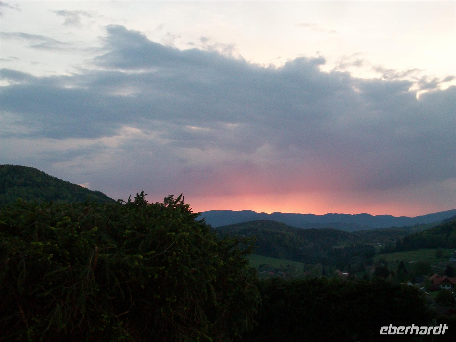 Bald sind wie in der Steiermark angekommen und werden hier von starken Schauern überrascht. Das kann uns allerdings nicht stören, vom Bus aus und im Trockenen können wir die Dinge betrachten. Wenige Zeit vor der Hotelankunft bekommen wir ein besonderes Naturschauspiel zu sehen: während auf der linken Seite noch dicke Wolken ihre Regenlast abwerfen, schicktdie Sonne von rechts schon ihr Licht gegen den Regen und zaubert uns einen schönen Regenbogen der uns auf vielen Kilometer folgt.