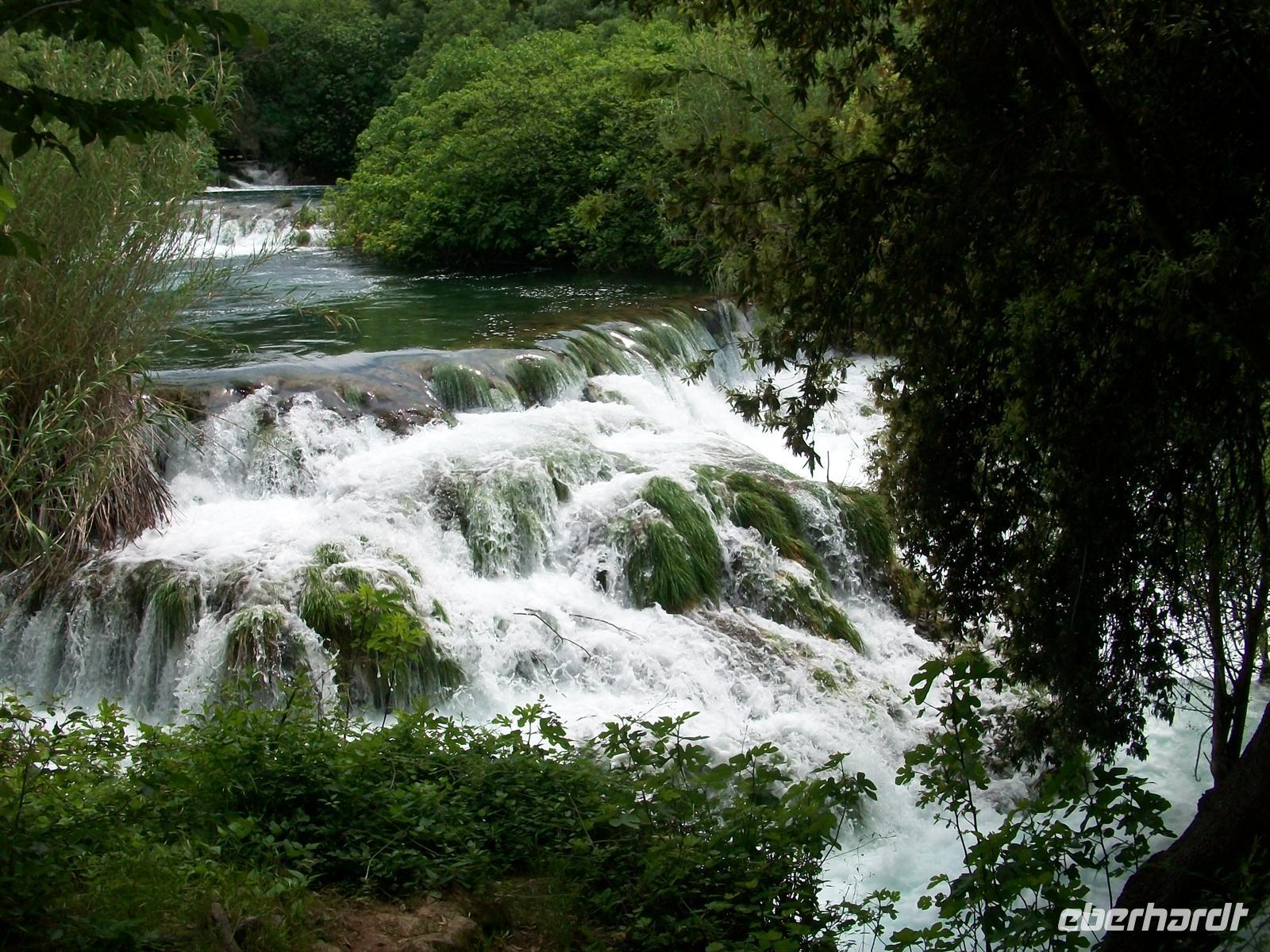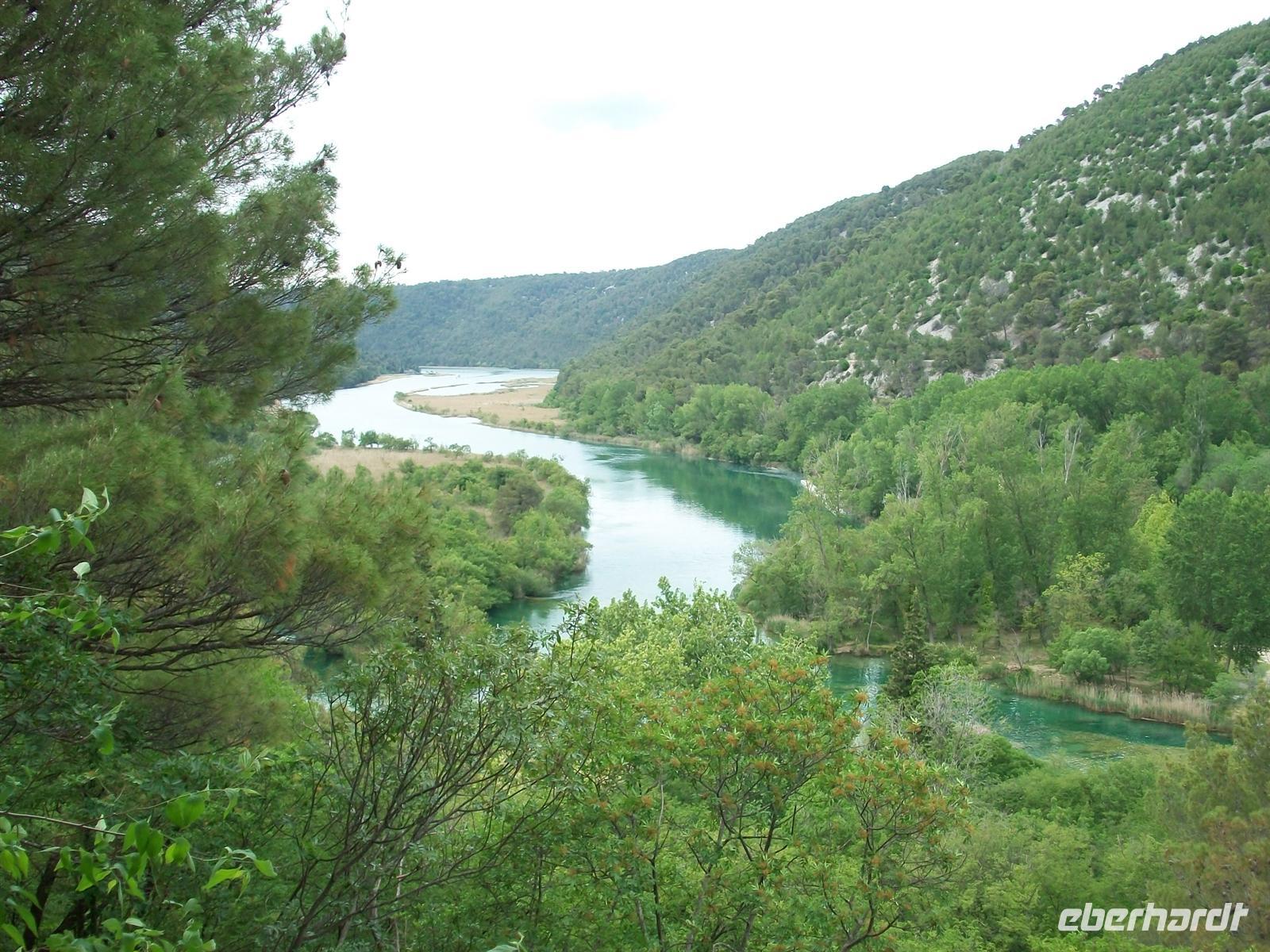 Es ist auch das Gebiet in dem zahlreiche Quellen entsprießen und sich zu Karstflüssen vereinigen die manchmal unterirdisch ihren Lauf nehmen. Einer dieser Flüsse ist die Krka die in der Nähe des Ortes Knin entspringt. Von da an nimmt sie ihren Weg in Richtung Adria, dort wo ihr Lauf am schönsten ist befindet sich der Nationalpark. Es ist immer wieder ein Hochgenuss die Serpentinen zum Wasserfall hinunter zu fahren, jede Kurve gibt den Blick frei auf eine wirklich schöne Szenerie. Seenartig hat sich der Fluss hier ausgebreitet, fast bis zum Horizont erstreckt sich die Wasserfläche.