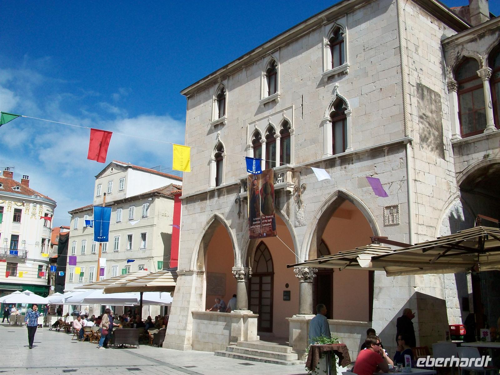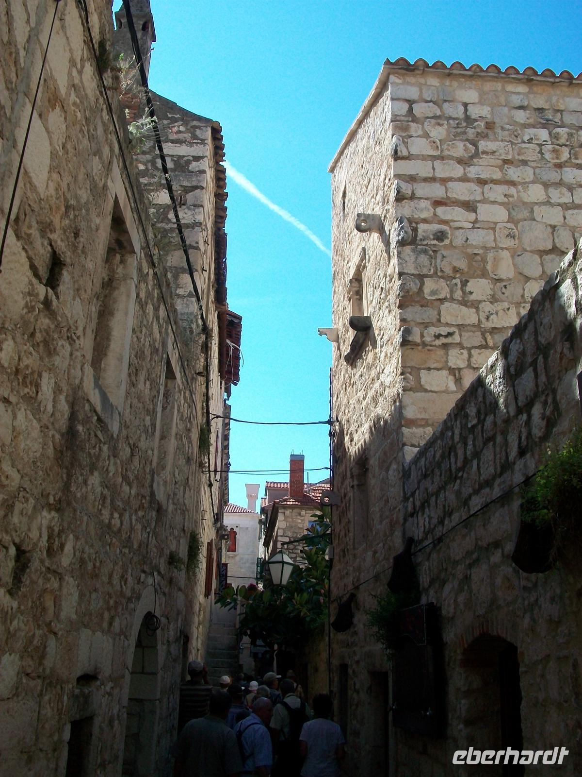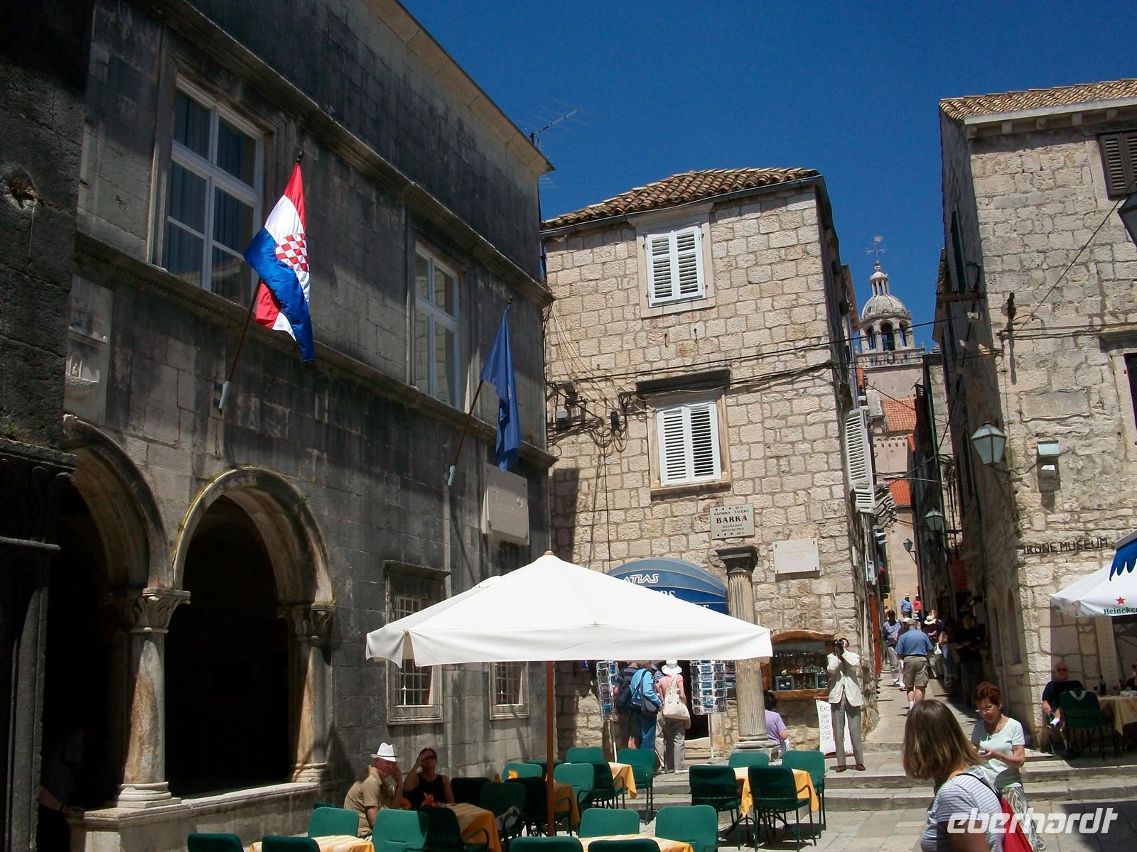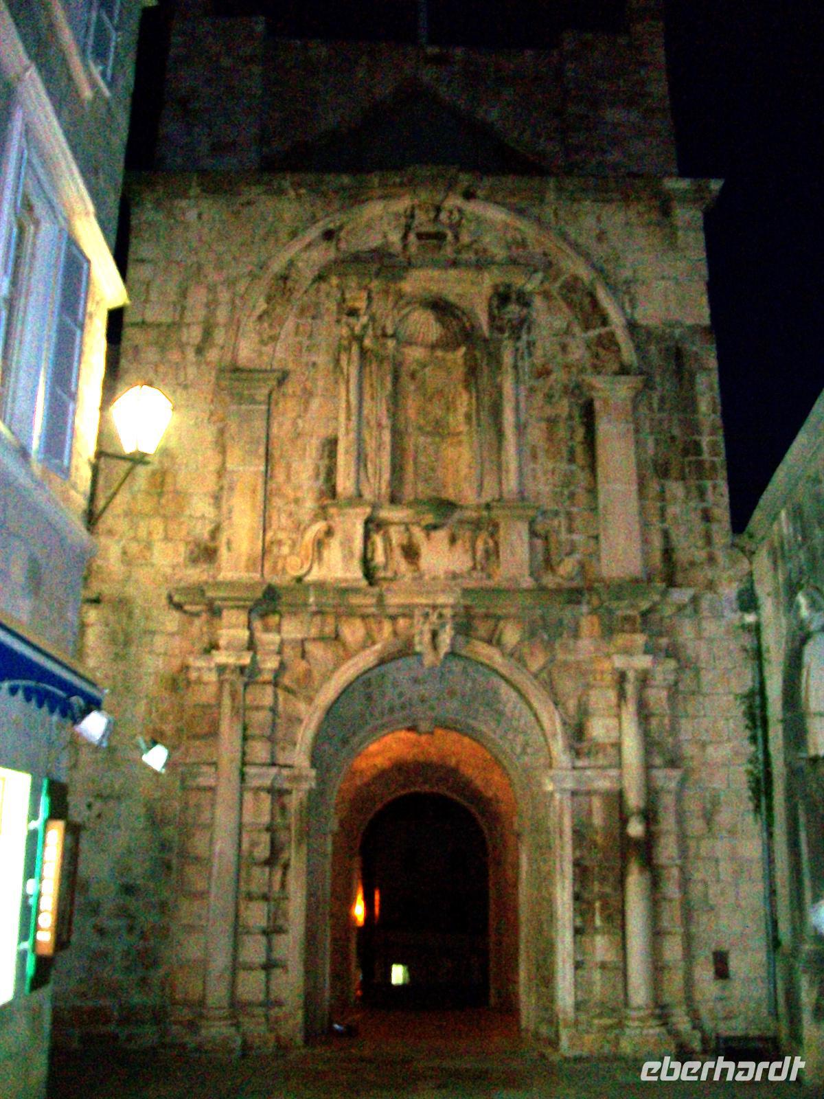 Kurz nach vier kommen wir in Trogir an, von weitem begrüßt uns schon die Spitze des Kirchturmes der Kathedrale. Am Wasser entlang führt uns der Weg zum Haupttor und dann sind wir schon mittendrin in der Welt der Venezianer. Über schmale Gassen erreichen wir den Hauptplatz. Hier ist das lebendige Zentrum, in der Vergangenheit und Heute. Das Eingangsportal der Kirche ziert die