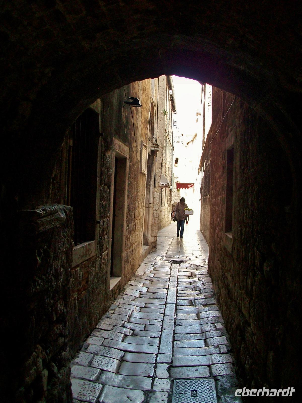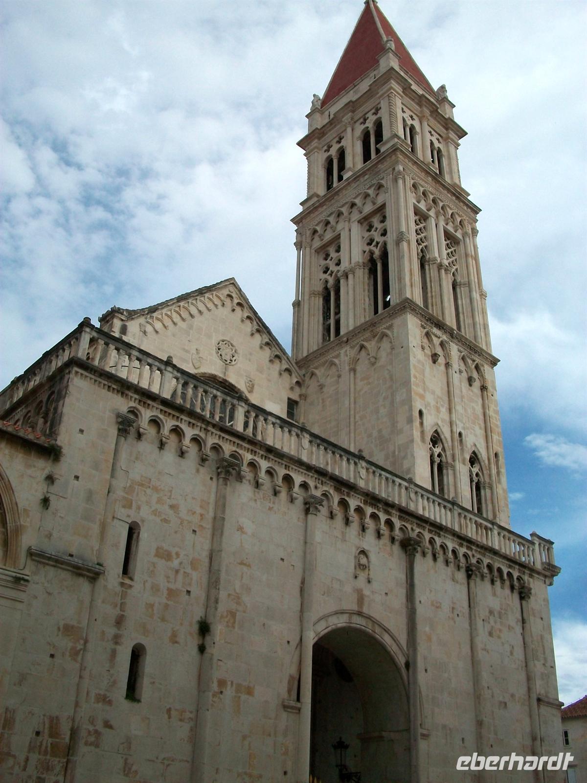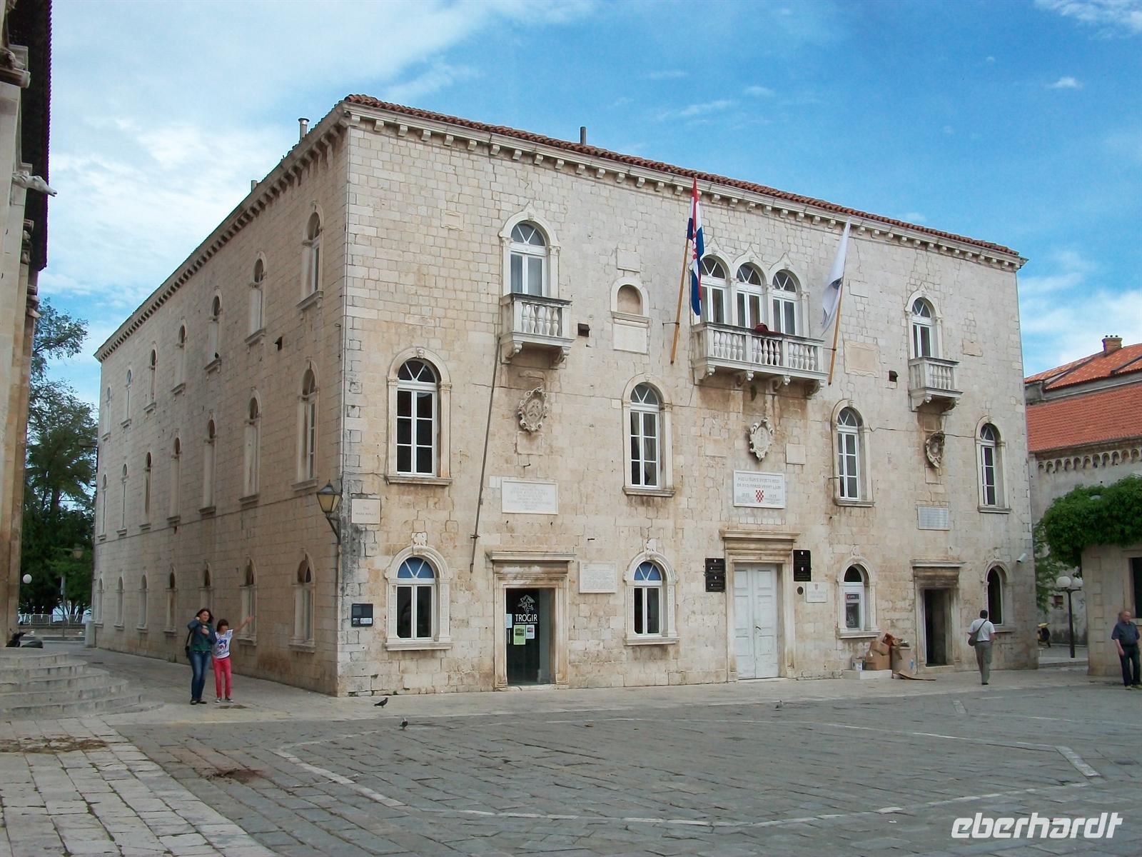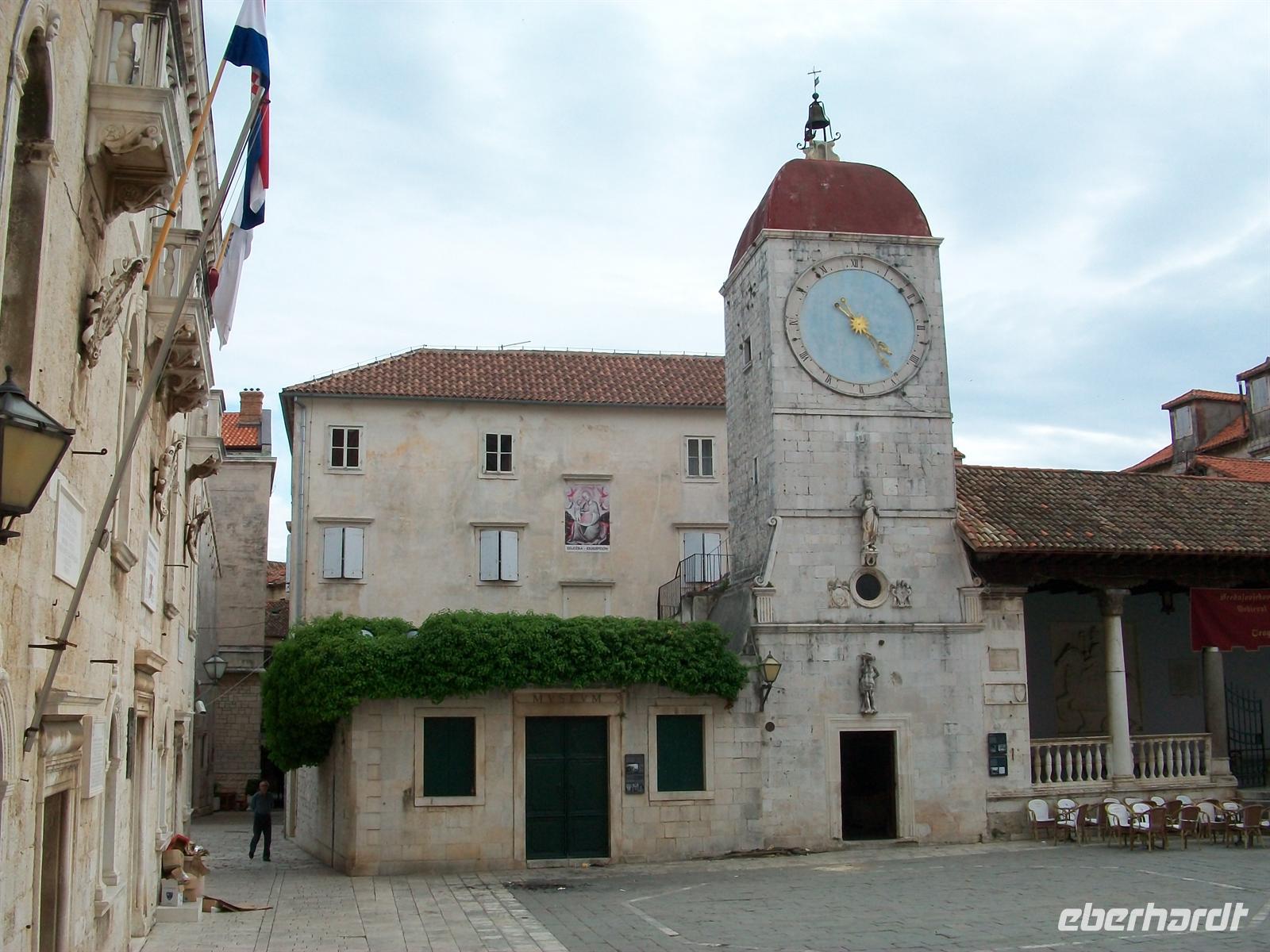 Kurz nach vier kommen wir in Trogir an, von weitem begrüßt uns schon die Spitze des Kirchturmes der Kathedrale. Am Wasser entlang führt uns der Weg zum Haupttor und dann sind wir schon mittendrin in der Welt der Venezianer. Über schmale Gassen erreichen wir den Hauptplatz. Hier ist das lebendige Zentrum, in der Vergangenheit und Heute. Das Eingangsportal der Kirche ziert die