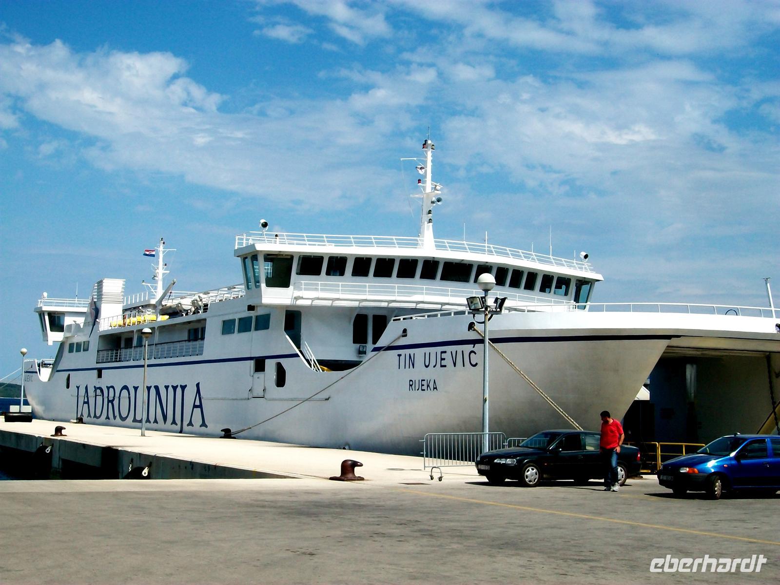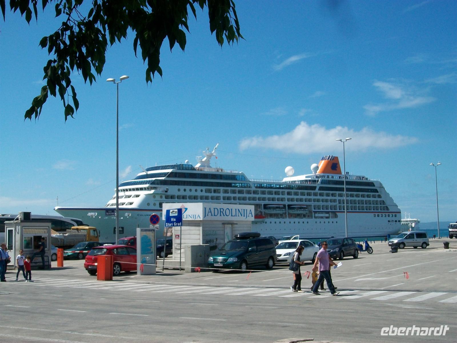 Gegen halb zwölf werden die Luken geschlossen, eine etwas stärkereVibration der Schiffsmotoren kündet davon dass wir nun Fahrt aufnehmen, unser Ziel heißt Split. Nach etwa einer Stunde haben wir die Meerenge zwischen den Inseln Bra und Šolta erreicht, nach der Passage droht das bisher schöne Wetter umzuschlagen. Der Wellengang wird etwas höher, das Schiff fängt etwas zu schaukeln an. Als wir gegen halb zwei in Split anlegen ist es endgültig mit dem schönen Wetter vorbei; dunkle Wolken haben sich über die Berge gelegt und die wilde Bora bläst und lässt Sträucher und Bäume schwanken. Die Straße führt uns aufwärts zur Autobahn wir haben unser nächstes Ziel im Auge: