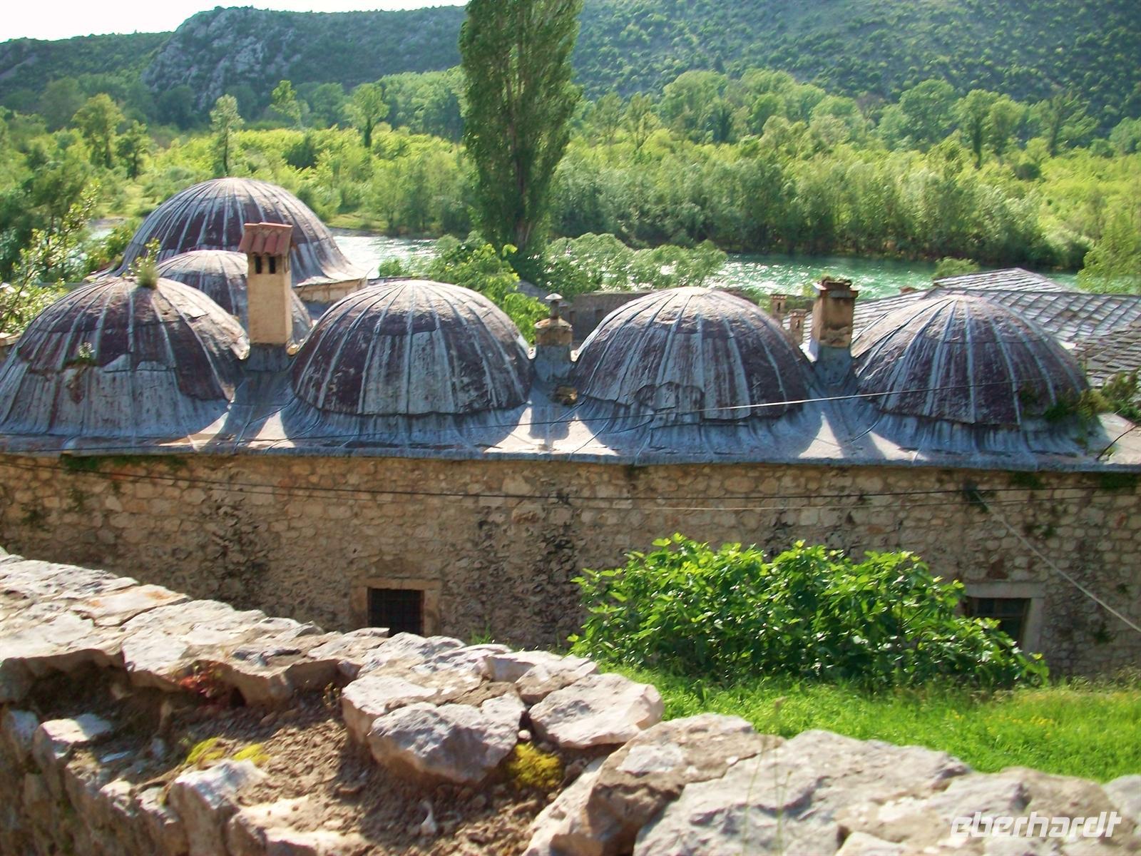 sehen wir nun die schlanken Minarette der Moscheen. Ein sehr interessanter Ort ist Poitelj, der auch als Türkisches Dorf bezeichnet wird. Ein Stopp lohnt sich immer, alles ist hier wie im Morgenland. Als wir die Moschee betreten ist gerade Gebetszeit und der Muezzin ruft die Gläubigen nach der vorgeschriebenen Zeremonie zum Nachmittagsgebet. Von hier haben wir einen schönen Blick hinunter zur Neretva und den Kuppeln des ehemaligen türkischen Bads.