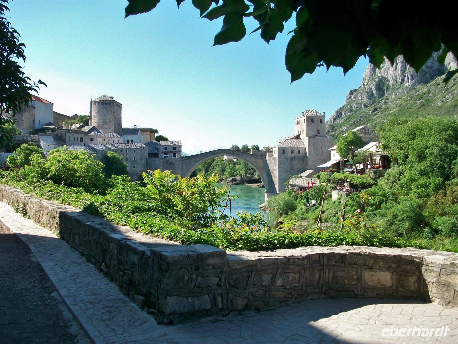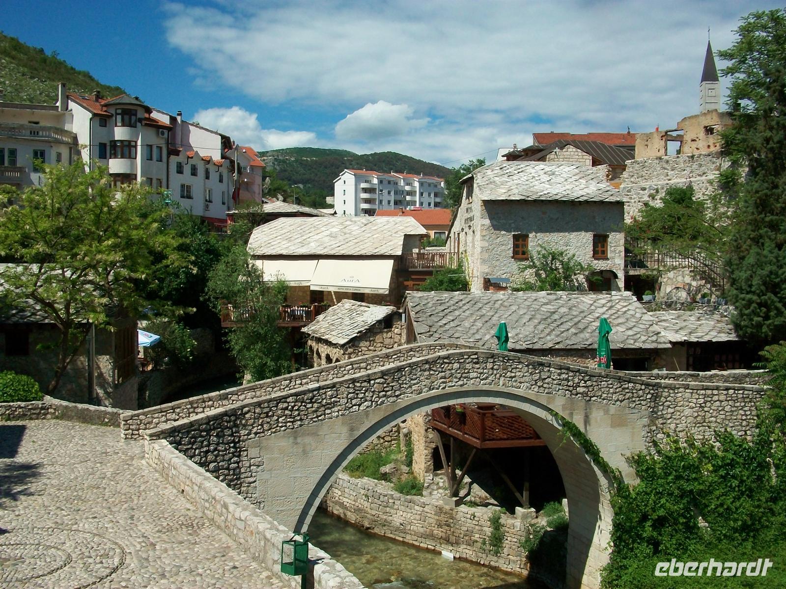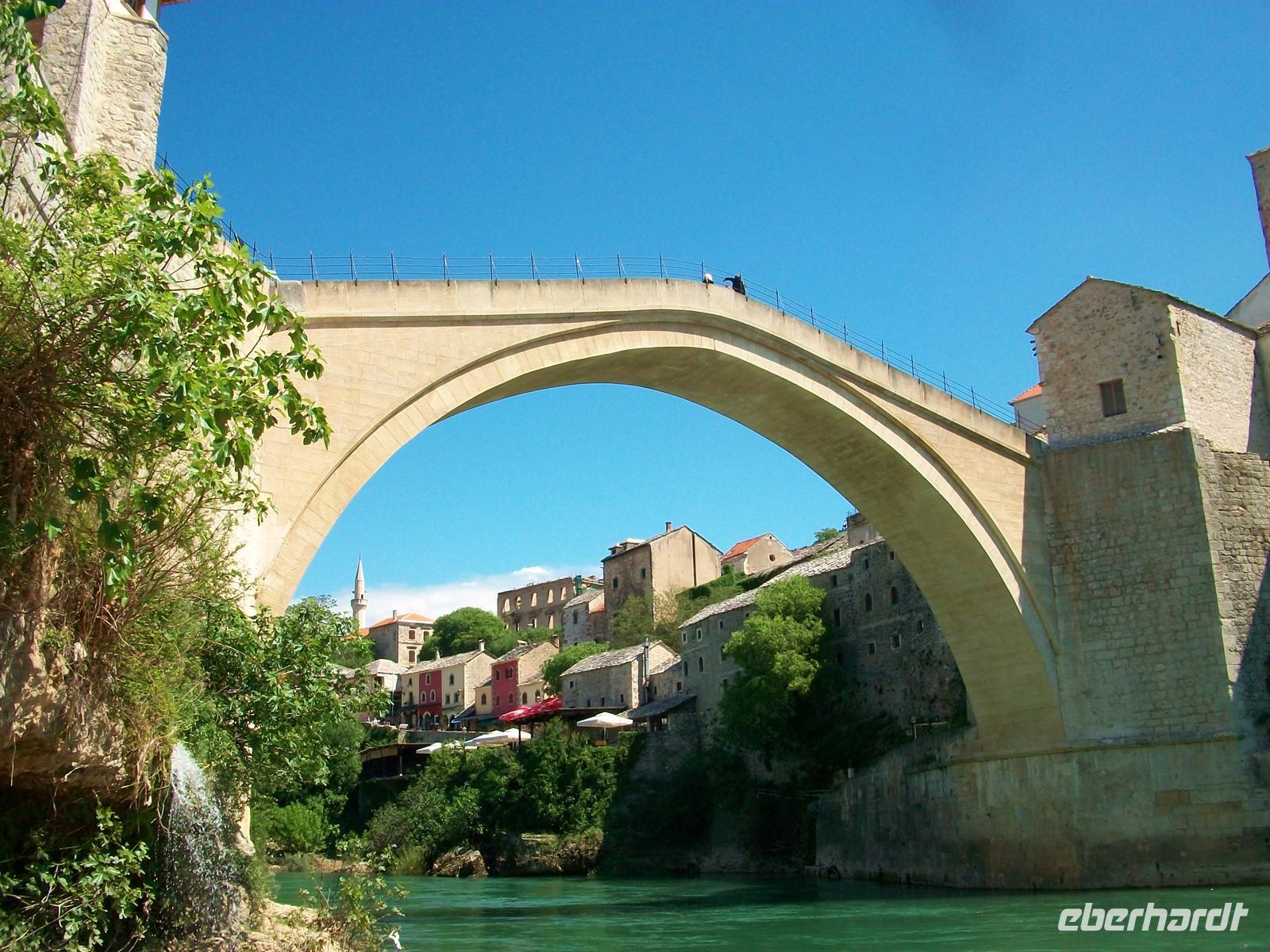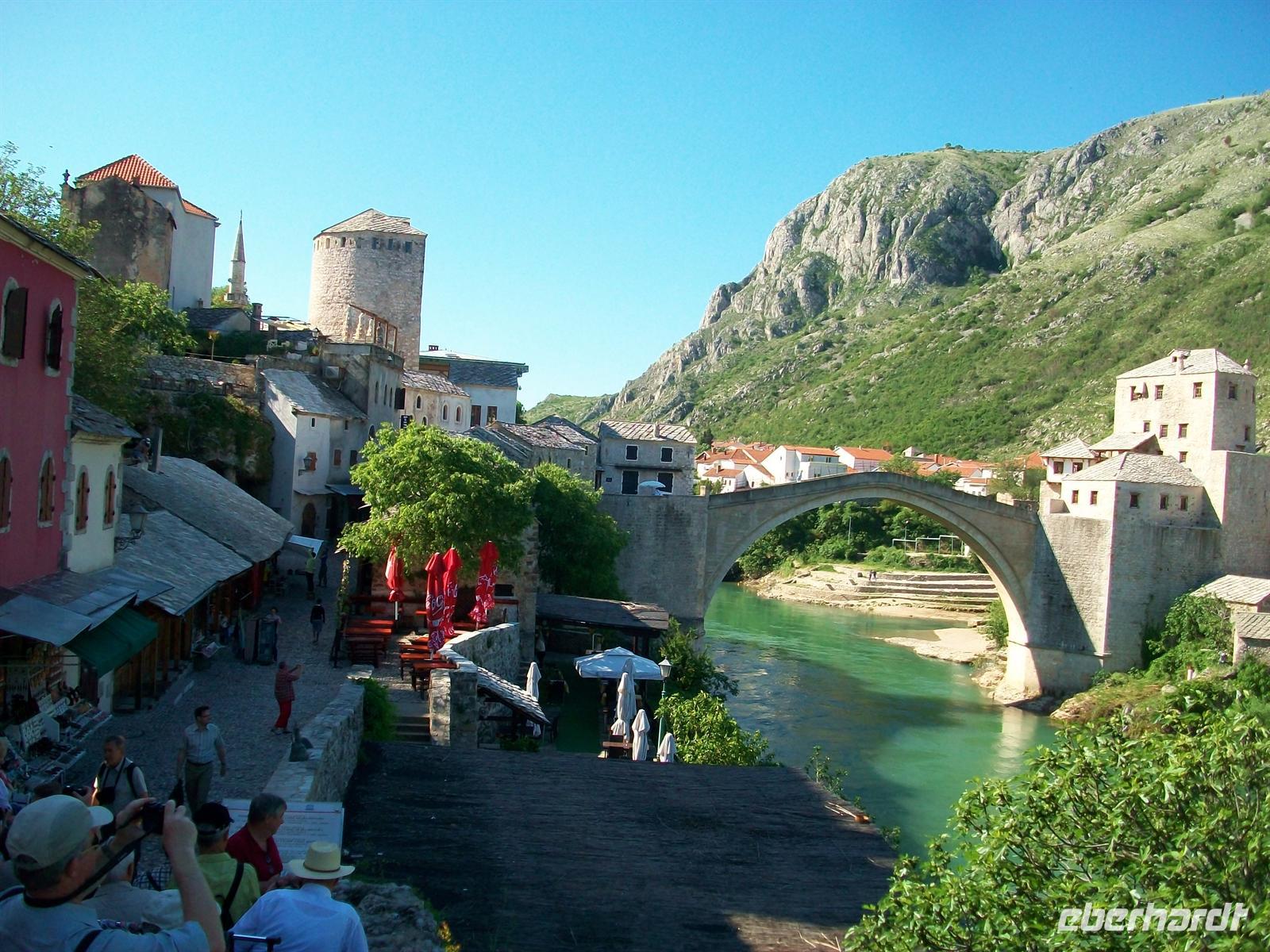 8.5.2012. Es hat auch heute über Nacht geregnet, doch pünktlich zum Sonnenaufgang haben sich alle Wolken verzogen. Wir sind zu Fuß unterwegs den reizvollen Ort Mostar zu erkunden; Adnan unser Stadtführer wird uns auf den Wegen begleiten die mit dem türkischen Pflaster unseren Schuhen einiges abverlangen werden. Die Souvenirhändler räumen gerade ihre Waren heraus, es ist noch früh am Tag. Der Weg führt uns zuerst über die Alte Brücke, es ist das wichtigste Monument aus Osmanischer Zeit. Elegant überspannt sie in einem Bogen die Neretva,