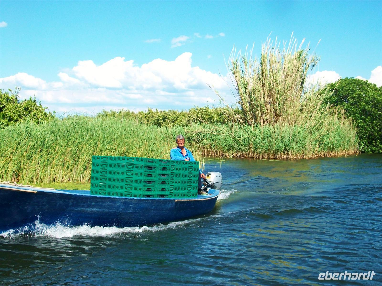Dann steigen wir ein in die ehemaligen Fischerboote um vom Wasser aus diese schöne Region zu erkunden. Zahlreich sind die Kanäle die wir durchfahren, unendlich reizvoll die schönen Fotomotive die wir uns von hier aus erschließen können. Wir sehen einige Wasservögel und hören auch den lauten Ruf des Teichrohrsängers der beim Vorbeifahren unseres Bootes kurz innehält um danach