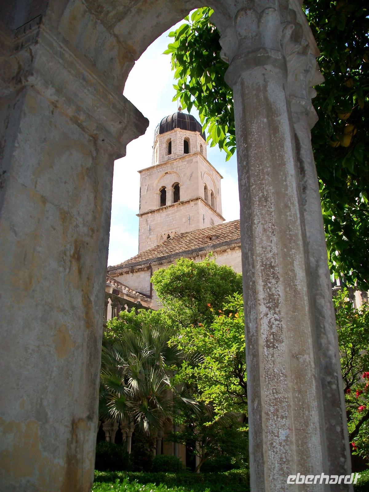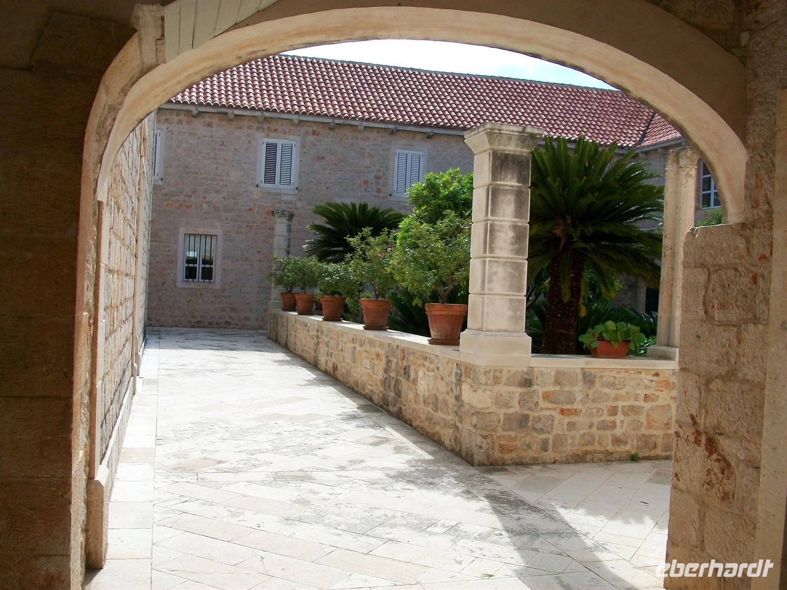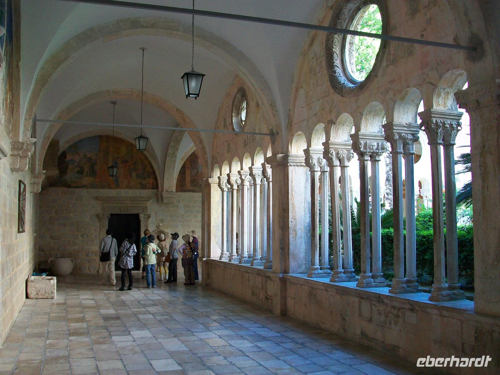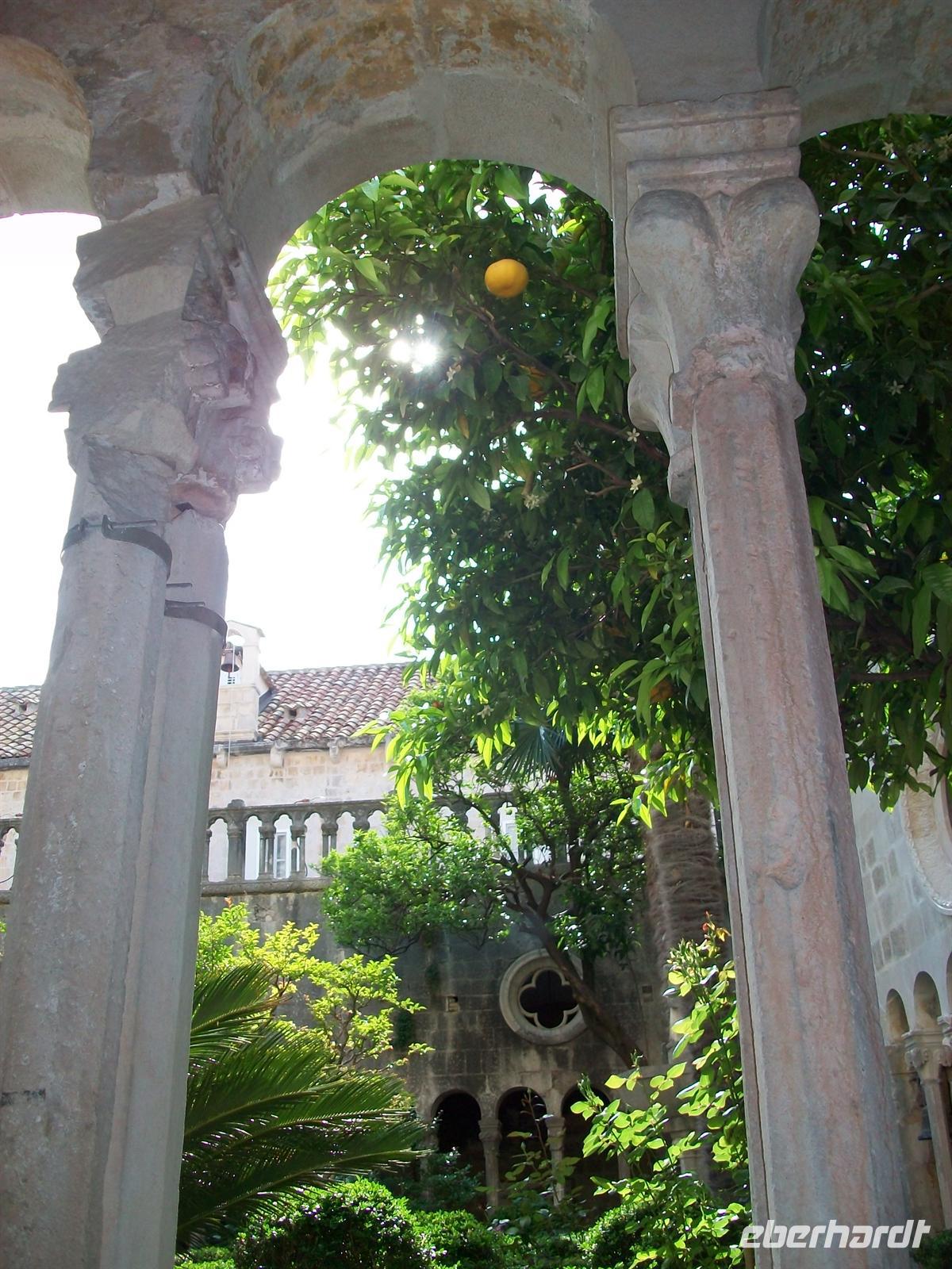 Am großen Onofriobrunnen haben sich schon einige Touristen versammelt, von hier gelangen wir in das Franziskanerkloster und die Alte Apotheke „Male Brae“. Ein Besuch hier lohnt immer, die Sonnenstrahlen fallen schräg durch die Säulen des Kreuzganges und geben uns an diesem schönen Ort ein Wechselspiel von Licht und Schatten. Im Innenhof sind Zitrusbäume mit ihren reifen Früchten zu sehen. Wir lernen hier viel vom religiösen Leben kennen; sehenswert ist die Apotheke mit den historischen Gegenständen.