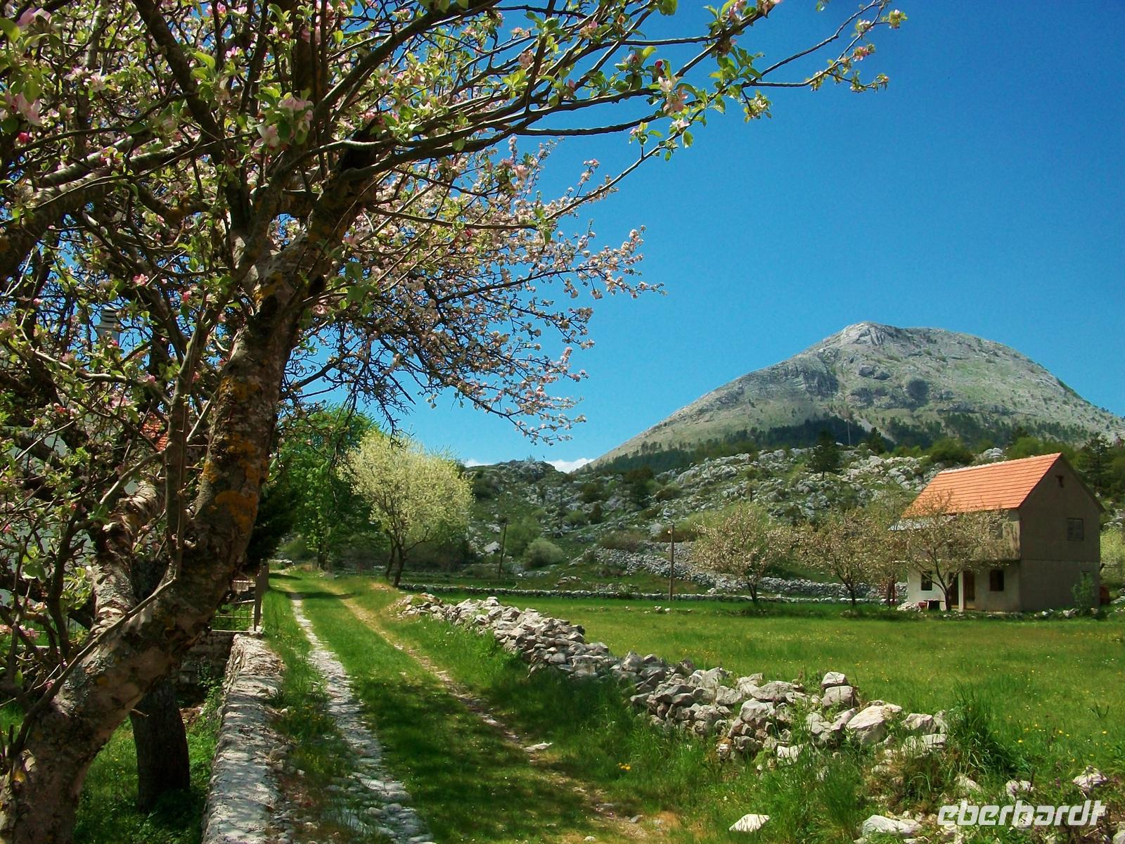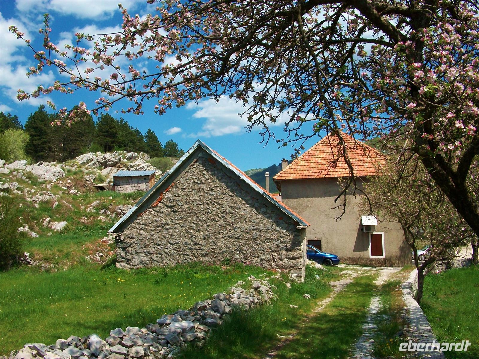 Nach zwölf sind wir dann wieder unterwegs. Der Weg führt uns in die Berge, in zahlreichen Serpentinen schrauben wir uns auf etwa 1 000 Meter hinauf, atemlos sehen wir die Bucht immer kleiner werden und bald sind wir in der Hochebene von Njeguši. Schlagartig ändert sich auch die Klimasituation, die Vegetation ist hier oben noch weit zurück, schön ist die Baumblüte zu betrachten die hier voll im Gange ist. In unserem Restaurant bekommen wir unseren Mittagsimbiss, lockeres, selbstgebackenes Weißbrot belegt mit leckerem Käse und Schinken der Region.