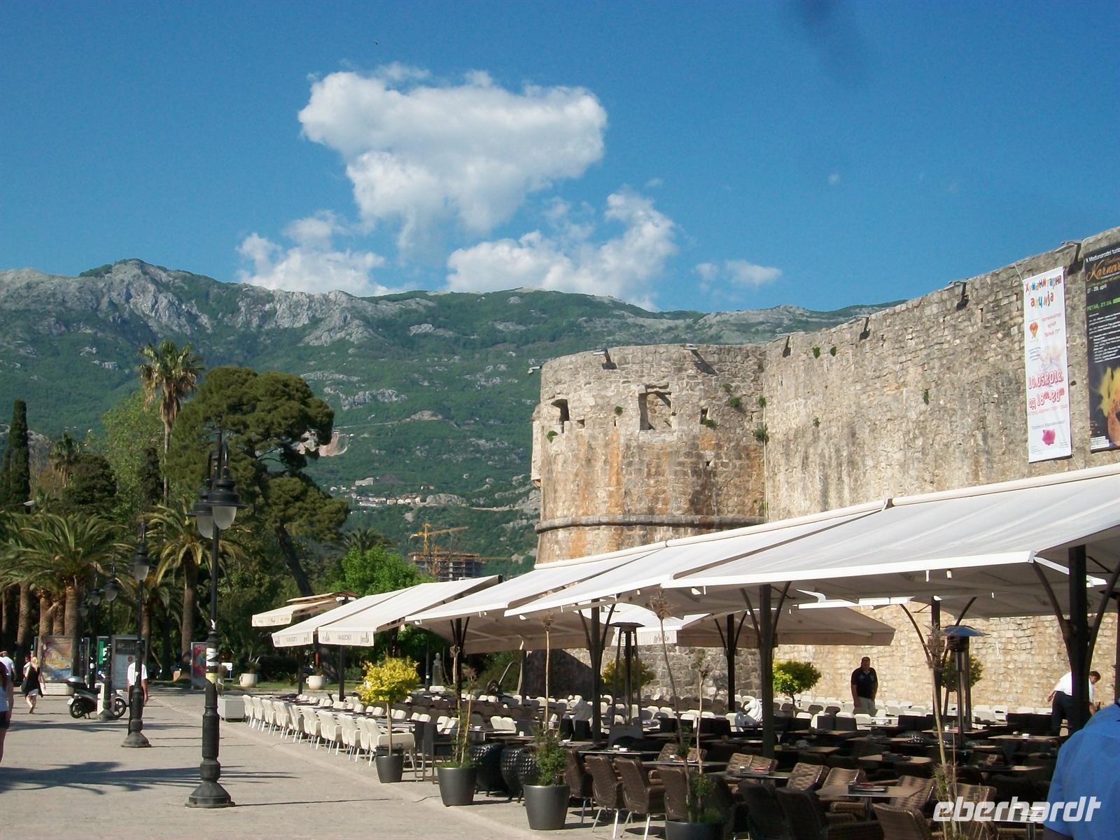 Schnell vergeht die Zeit und die strahlende Nachmittagssonne sieht uns schon auf dem Weg hinunter zur Adria. Gleich nach dem Bergsattel öffnet sich der Blick hinunter zur riesigen Wasserfläche des Meeres, der Horizont versinkt etwas im Dunst. Bald sind wir unten in Budva angelangt und die Altstadt wird nun von unseren Gästen individuell erkundet. Es ist ein schöner