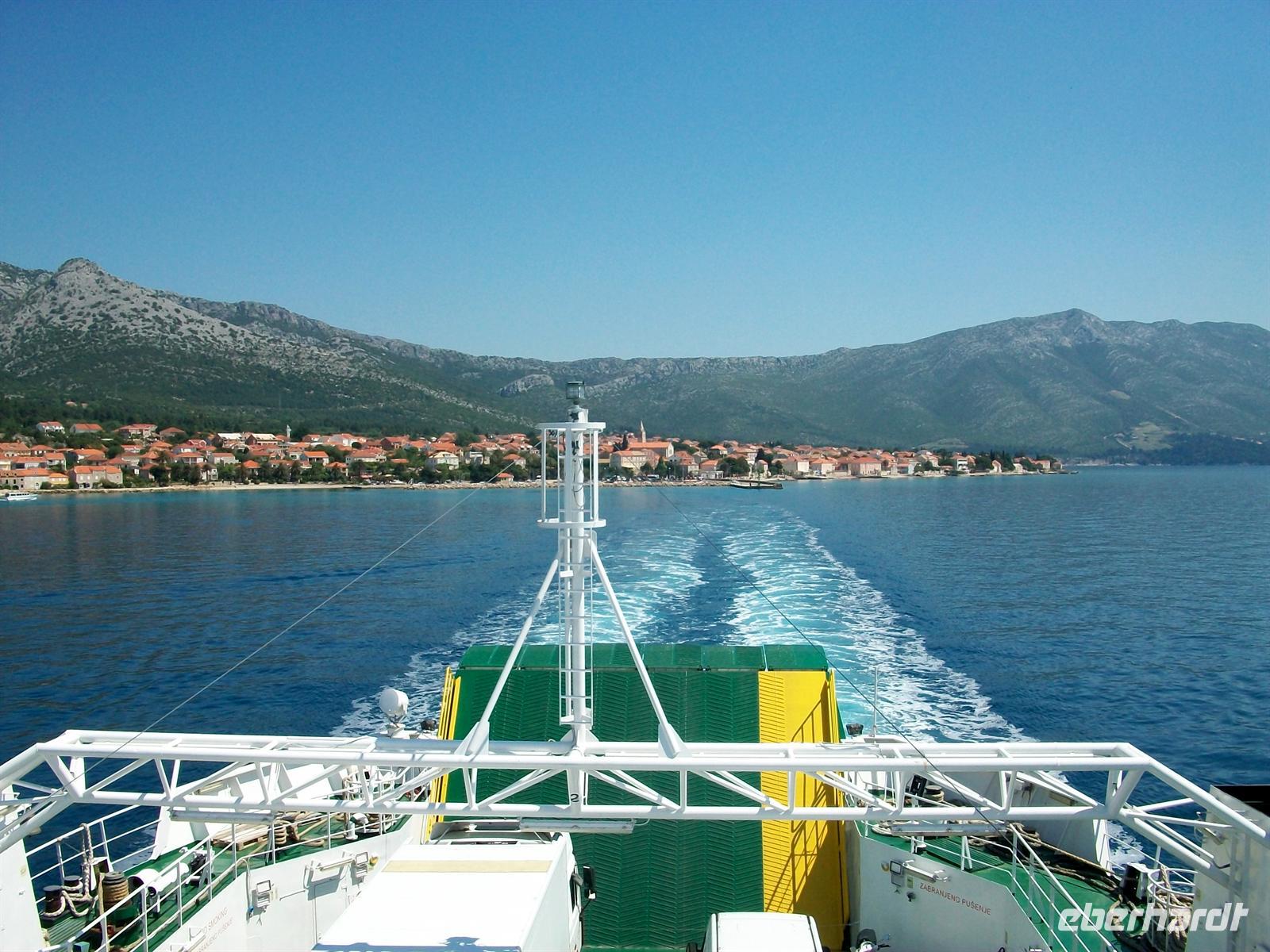 12.5.2012. Die Route des heutigen Tages führt uns zurück zum Festland. Zuerst setzen wir mit der Fähre über zur Halbinsel Pelješac, wir sehen ein letztes Mal die Altstadt von Korula die auf einer felsigen Halbinsel liegt und die hinter uns immer kleiner wird. Es ist wieder ein strahlend schöner Morgen, das Meer ist ruhig und hat einen eigenartigen blauen Schimmer; im Hintergrund