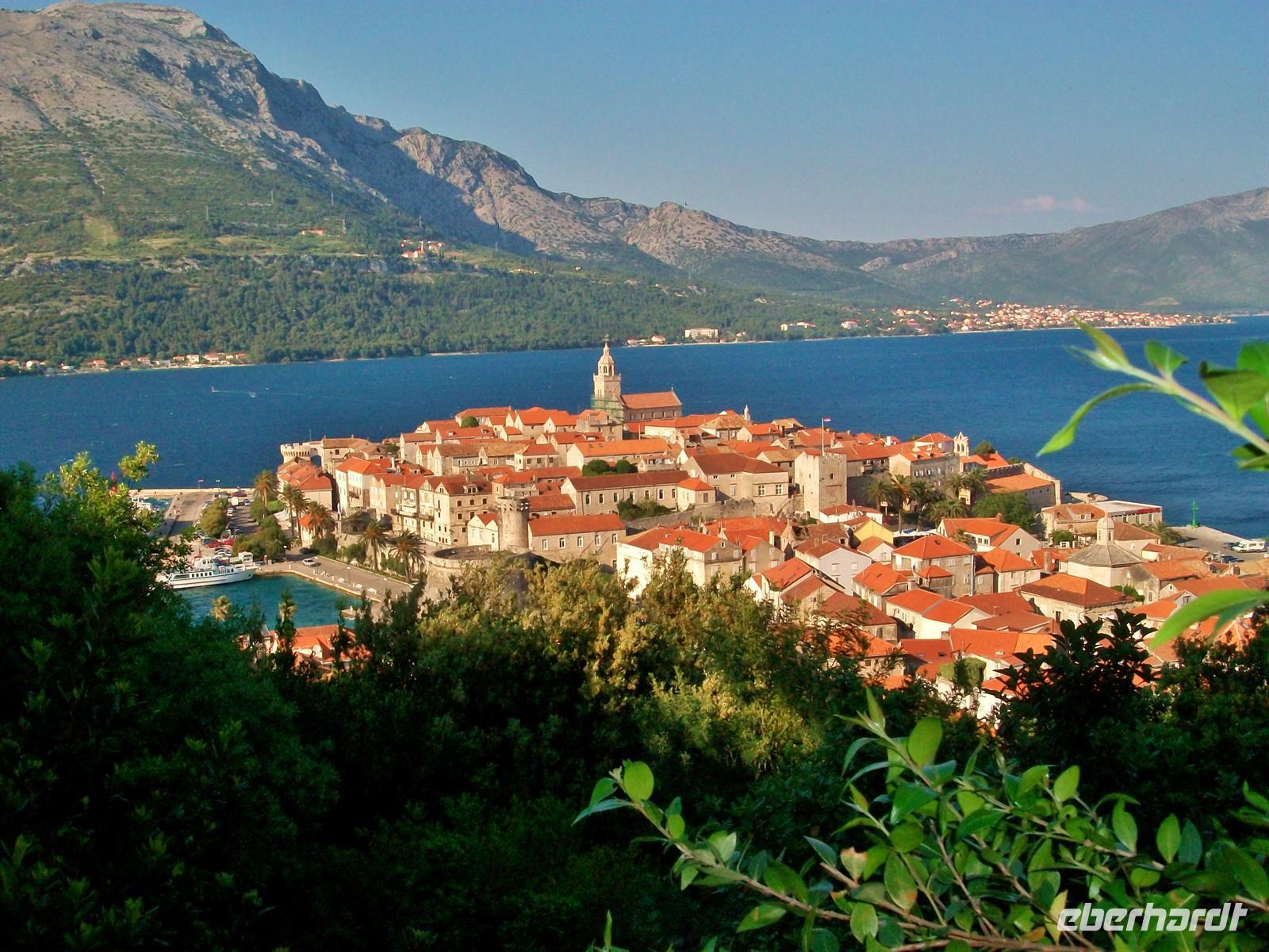 Dann geht es weiter auf der Halbinsel Pelješac, die geprägt ist vom Weinbau. Kurz vor Orebi stehen wir staunend am Aussichtspunkt und schauen hinunter auf das Meer und die Insel Korula. Mächtig erhebt sich vor unseren Augen der Eliasberg, es ist die höchste Erhebung der Halbinsel.