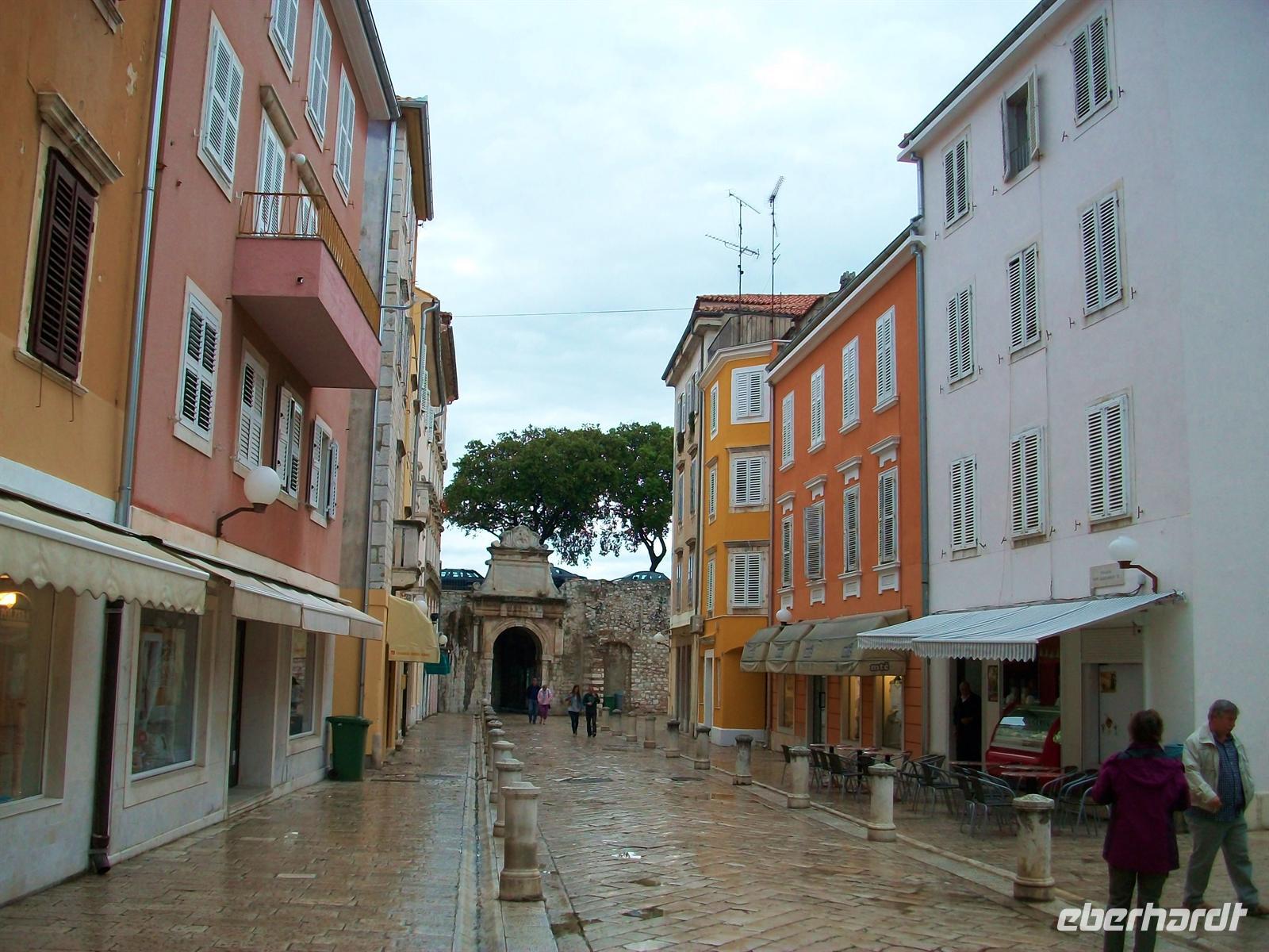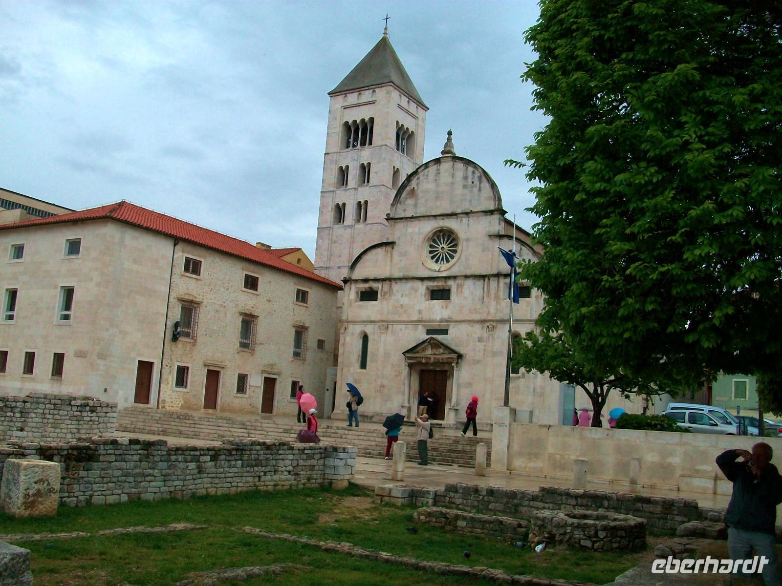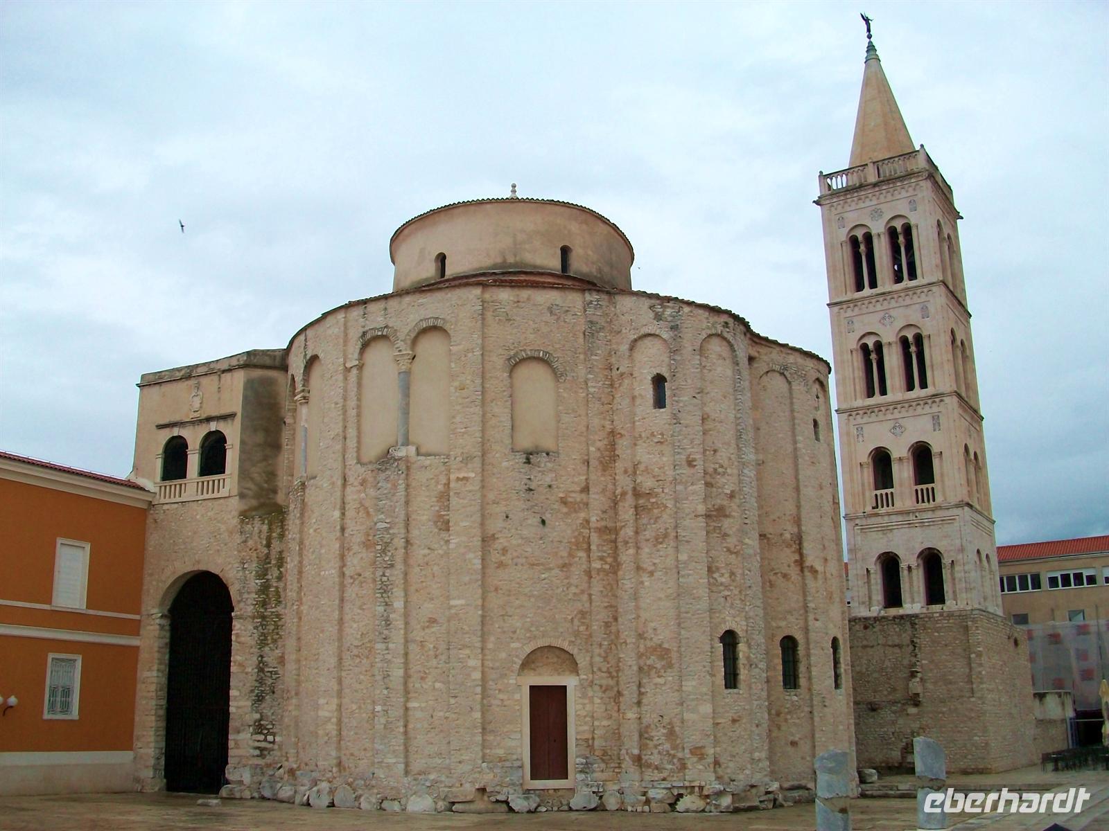 Gegen vier kommen wir in Zadar an, der schlimme Regen hat sich erst einmal nach Norden verzogen, dort sind auch grelle Blitze zu sehen. Hier in Zadar ist es aber relativ ruhig, ein leichter Niesel stört aber kaum die interessante Stadtführung mit Edi. Er ist wiederholt unser Guide und bringt uns sehr anschaulich den Ort näher der von den römischen Überbleibseln über Romanik, Gotik bis zur Moderne viel Sehenswertes zu bieten hat. Wir sehen die Rotunde der Donatskirche, machen einen Abstecher zur Kathedrale und erfahren von Edi am Hauptplatz etwas über die verschiedenen Herrscher der vergangenen Epochen.
