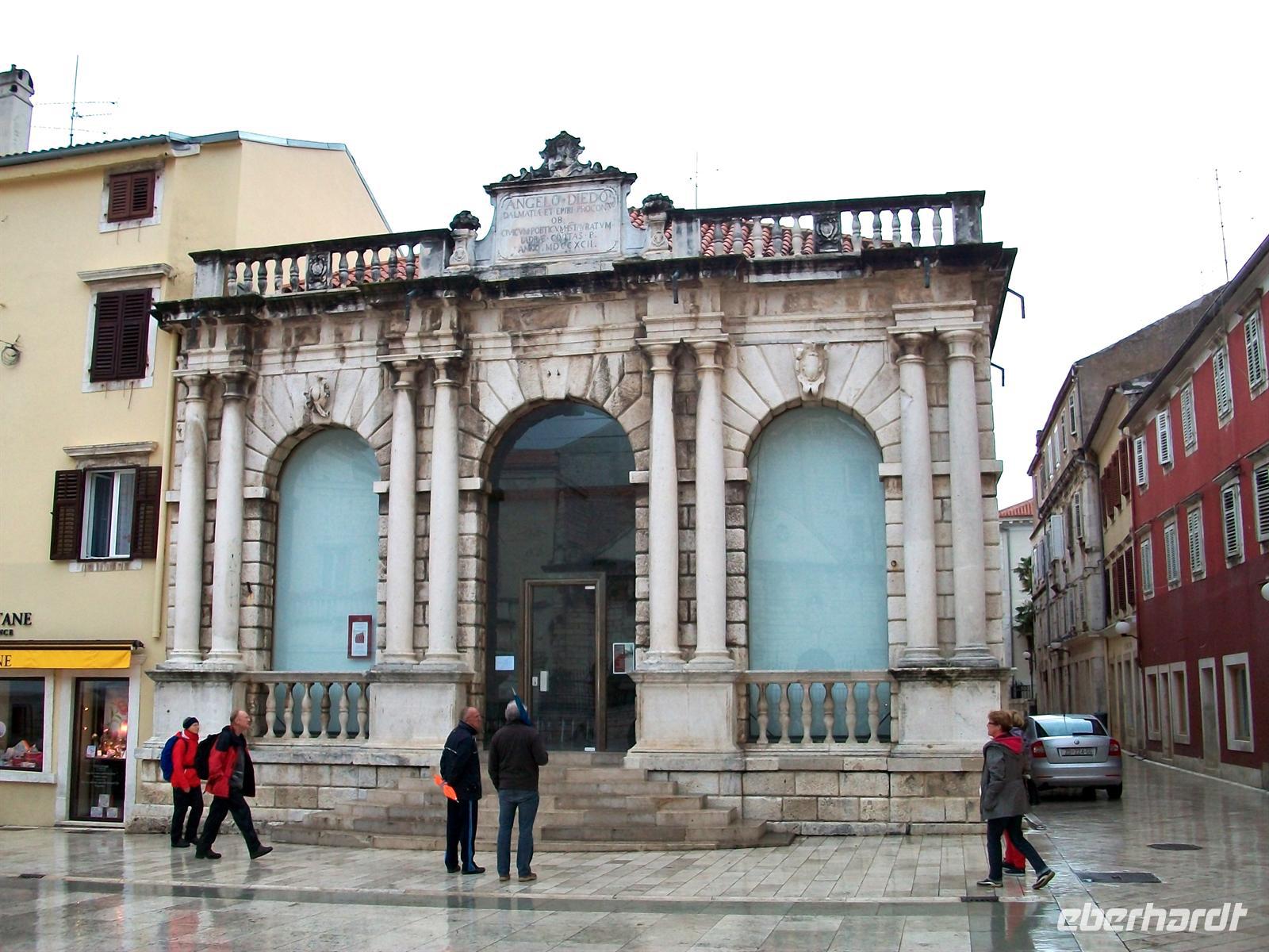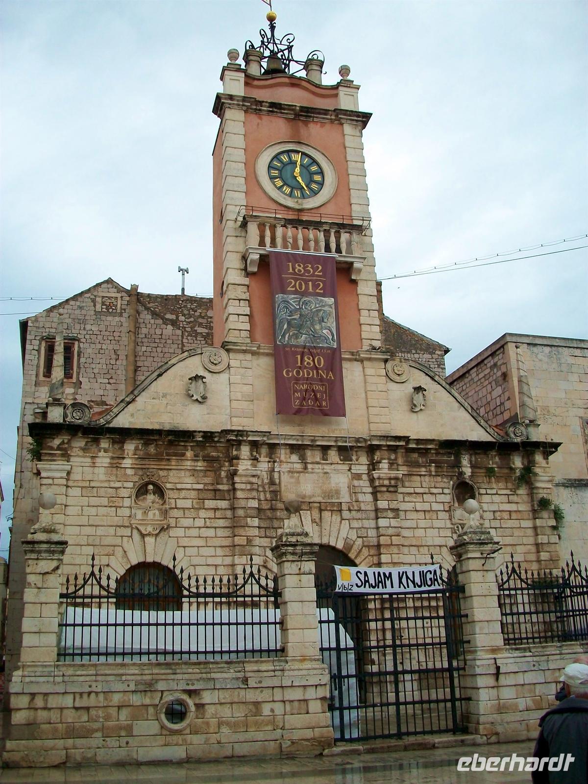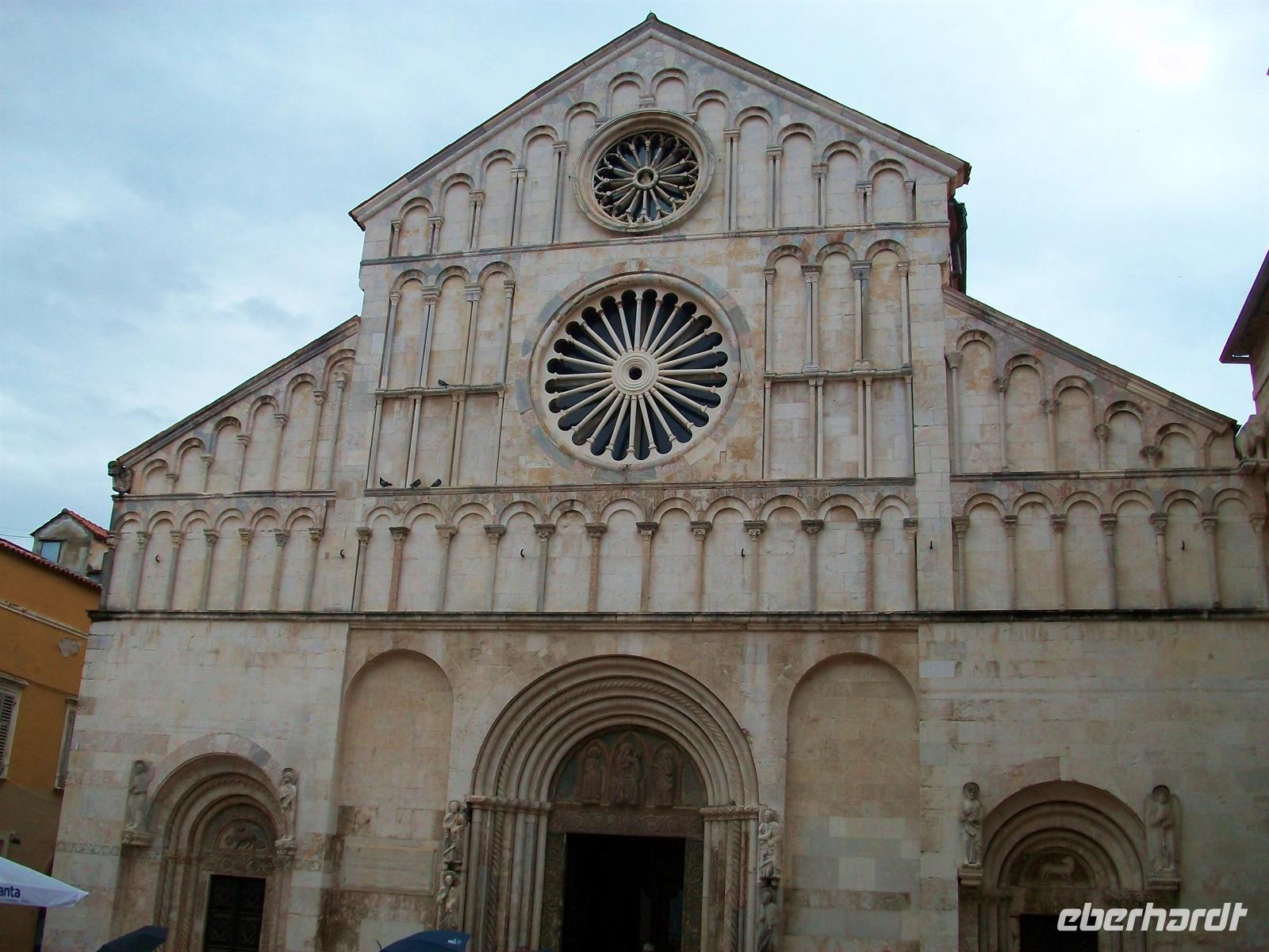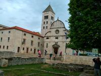 Gegen vier kommen wir in Zadar an, der schlimme Regen hat sich erst einmal nach Norden verzogen, dort sind auch grelle Blitze zu sehen. Hier in Zadar ist es aber relativ ruhig, ein leichter Niesel stört aber kaum die interessante Stadtführung mit Edi. Er ist wiederholt unser Guide und bringt uns sehr anschaulich den Ort näher der von den römischen Überbleibseln über Romanik, Gotik bis zur Moderne viel Sehenswertes zu bieten hat. Wir sehen die Rotunde der Donatskirche, machen einen Abstecher zur Kathedrale und erfahren von Edi am Hauptplatz etwas über die verschiedenen Herrscher der vergangenen Epochen.
