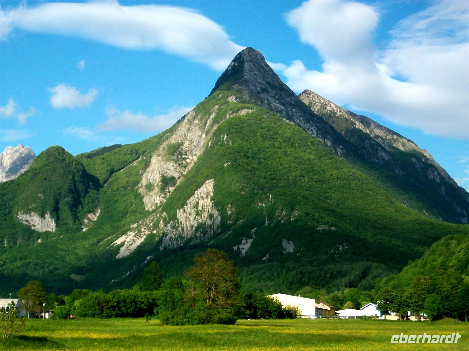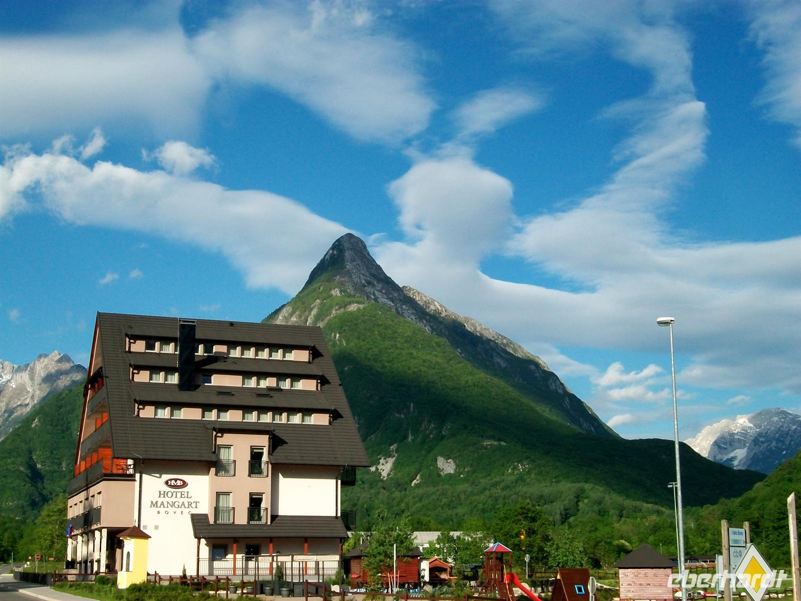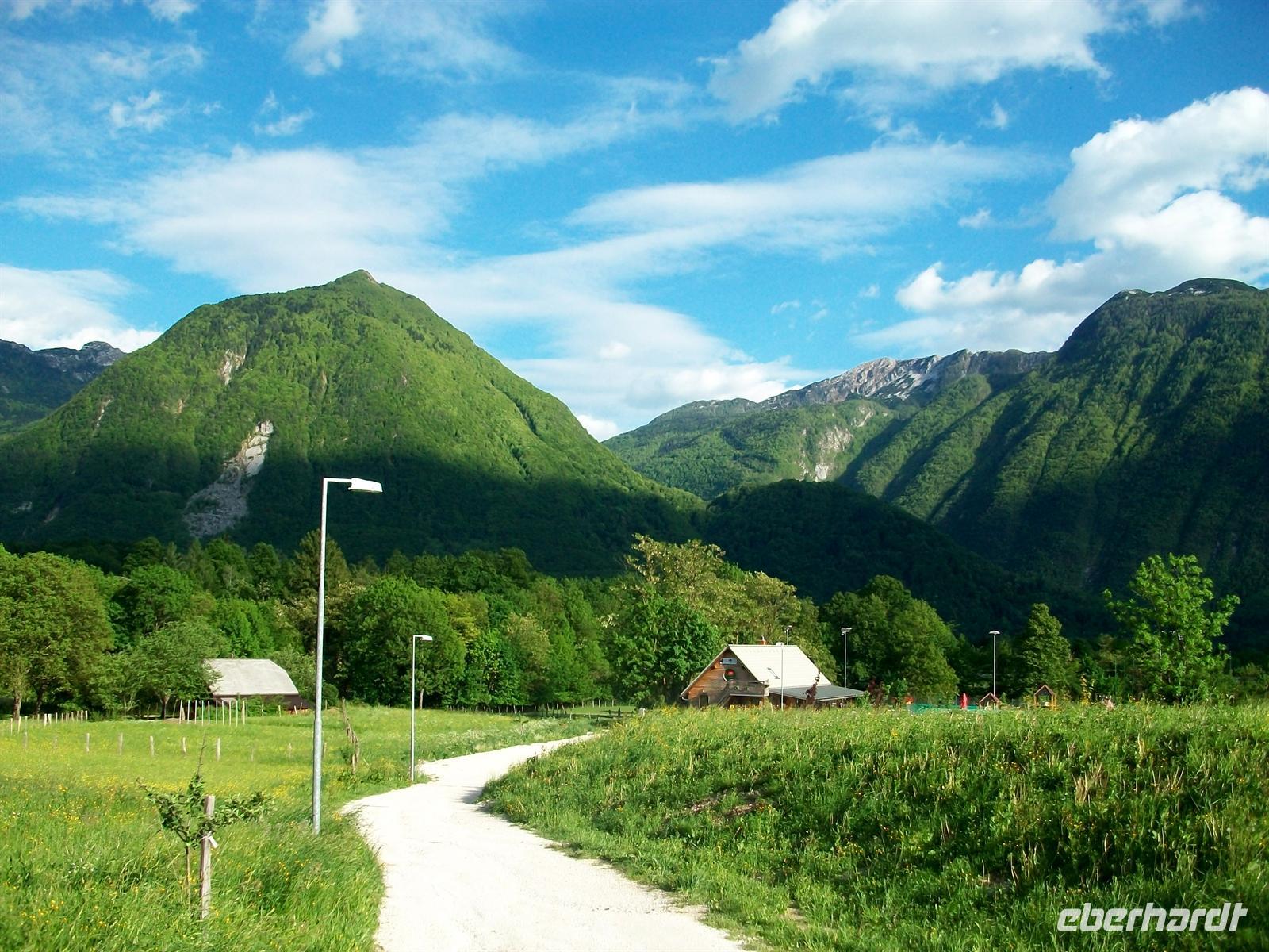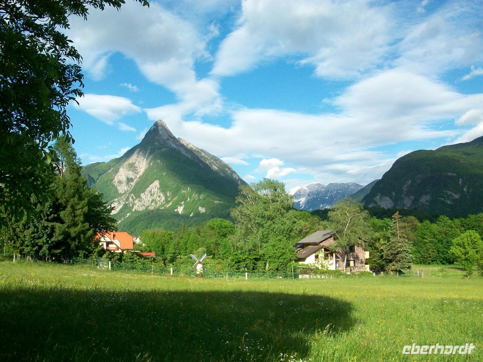 Kurze Zeit danach verlassen wir die Autobahn und fahren durch das romantische Tal der Idrijica. Petrus hat sich besonnen und sendet uns die Strahlen der Sonne auf den Weg den wir verfolgen. Dieses Tal, welches ich bisher noch nicht kannte, zählt mit zu den schönsten hier in Slowenien. Der Fluss hat sich zwischen den Felsen und Bergen seinen Weg gesucht und die Straße folgt dessen Verlauf. Bei Tolmin sehen wir auch die grünen Fluten der Soa, dem Fluss der am Triglav dem höchsten Berg Sloweniens entspringt und folgen ihm nun fortan. Gegen 17.40 Uhr kommen wir in Bovec an, das Wetter ist sehr angenehm und lädt zu einem Spaziergang nach dem doch etwas aufregenden Tag ein. Die saubere und klare Gebirgsluft, die Ruhe hier oben bringt uns vor dem Abendessen genügend Entspannung und ich glaube hierin sind wir sind uns alle einig: trotz der Änderung der Fahrtroute haben wir dabei viel gesehen und neue und schöne Eindrücke gesammelt.