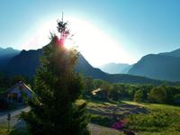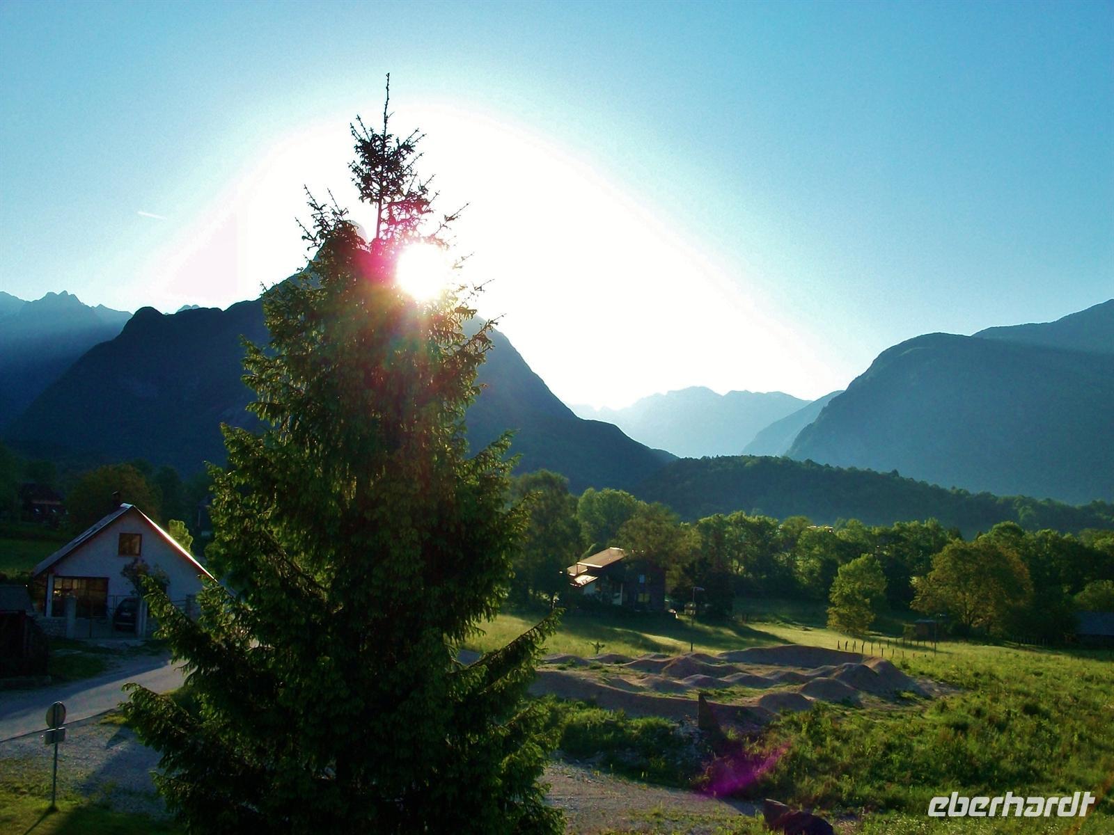 15.5.2012. Ich genieße den Sonnenaufgang vom Balkon meines Zimmers. Schnell ist die Sonne hinter den Spitzen der Berge aufgetaucht und sendet ihre goldenen Strahlen auf die saftig grünen Wiesen die sich hinter dem Hotel ausbreiten. Es ist hier im Tal himmlisch still und mit diesem schönen Tagesbeginn genießen wir alle dieses letzte Frühstück der Reise.