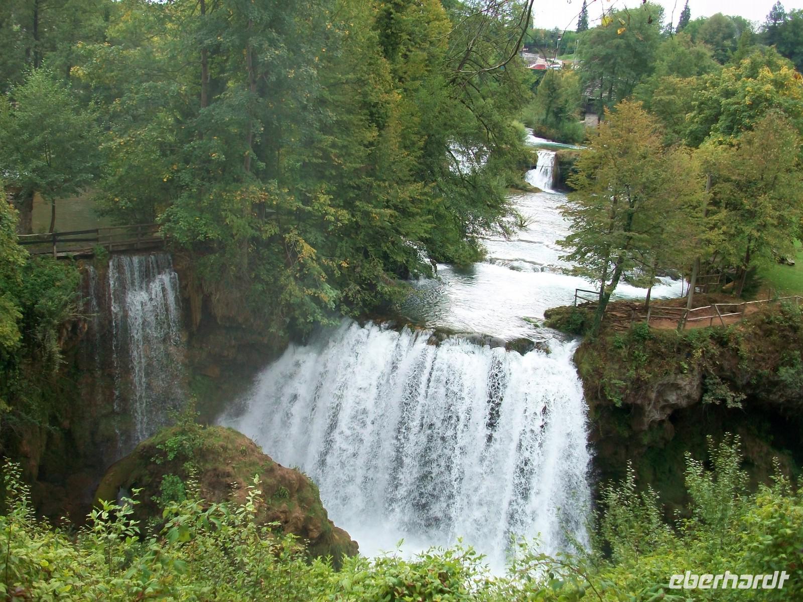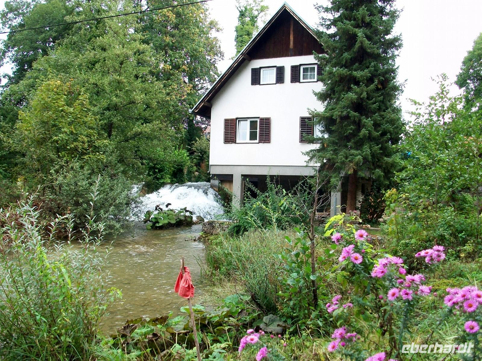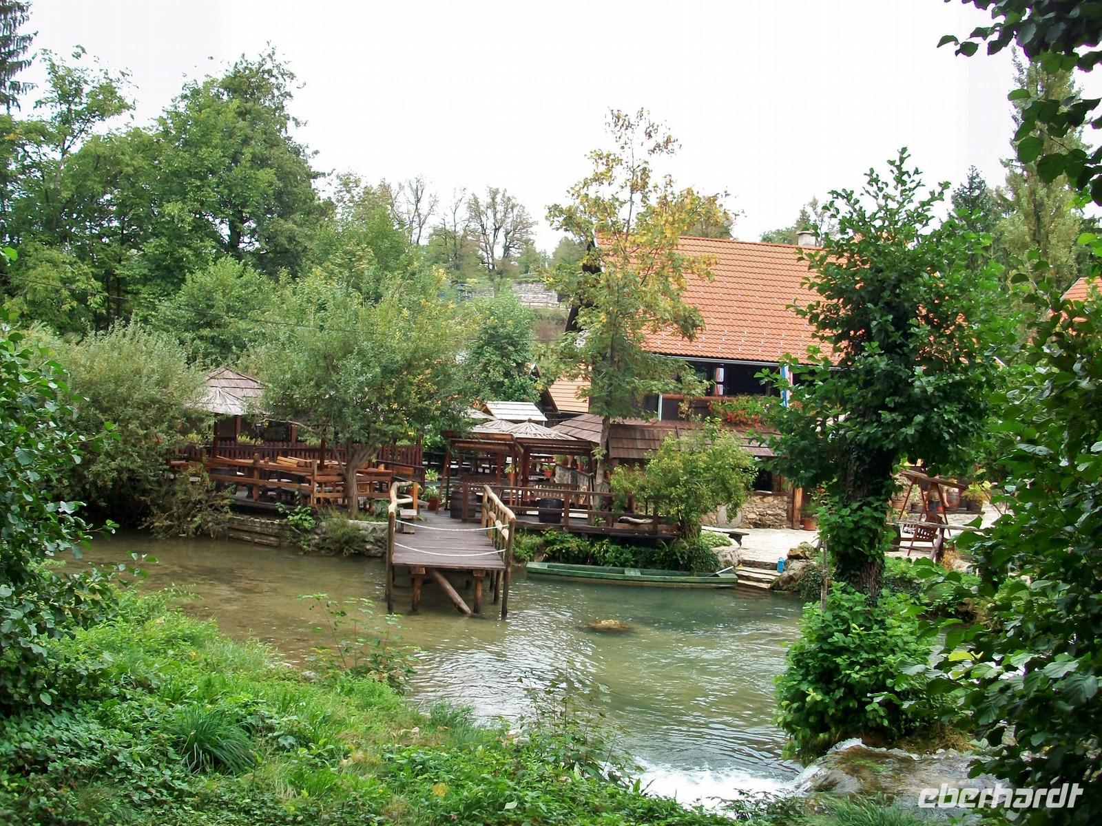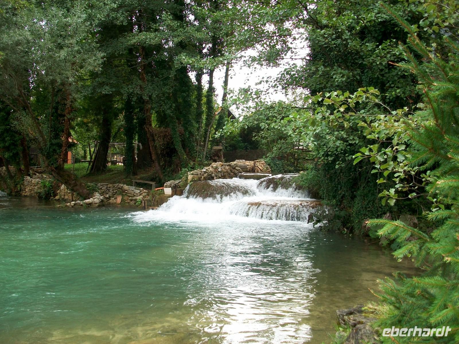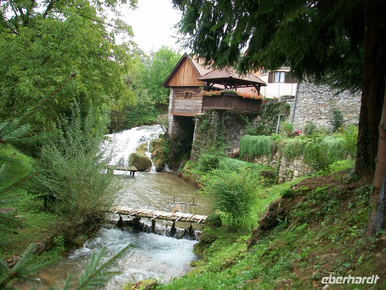 Es ist kurz nach halb neun und wir sind auf dem Weg Zagreb zu verlassen; da heute Sonntag ist hält sich der Verkehr in Grenzen. Bald sind wir auf der Autobahn in Richtung Karlovac unterwegs. Hier ändert sich auch die Landschaft; fuhren wir bisher durch die Pannonische Ebene so sind wir nach dieser ehemaligen Habsburger Garnisonsstadt bald in den Bergen unterwegs. Entlang des Flusses Korana die sich von Plitvice herunterschlängelt nehmen wir unsere Bahn. Auf dieser Strecke ist noch einiges von den Kriegsereignissen der 90er Jahre zu sehen, die Natur selbst ist geprägt durch den Karst und übt auf den Betrachter einen herben Charme aus. Bald sind wir am Ort Slunj angelangt; hier nehmen wir uns Zeit die Wassermühlensiedlung Rastoke einer näheren Betrachtung zu unterziehen. Der Fluss Korana hat sich an diesem Ort verzweigt und zwischen den Häusern und manchmal auch darunter hindurch, nimmt das rauschende Element seine Bahn- faszinierend!