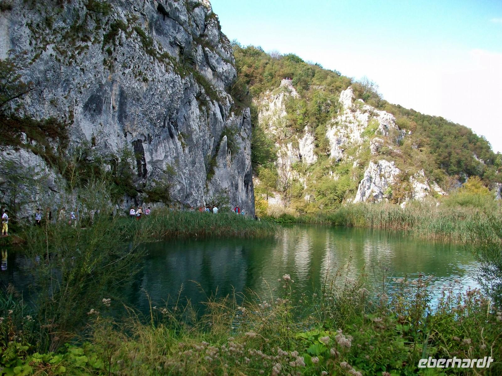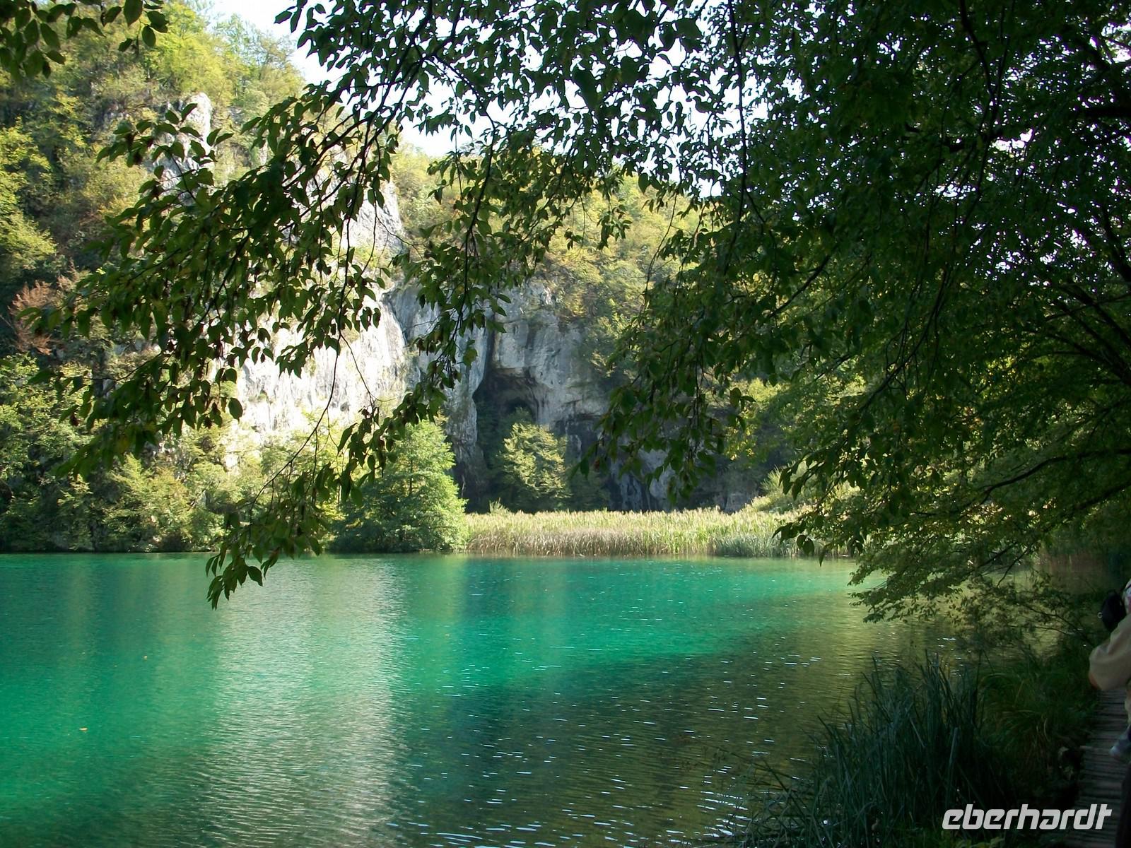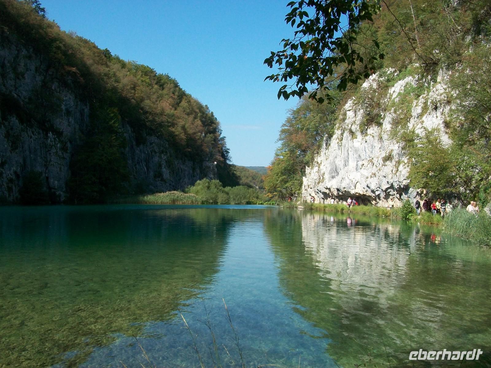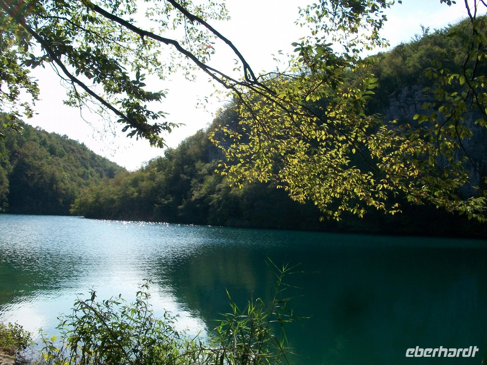 Dann geht es weiter aufwärts, bald kommen wir an dem See vorbei der im Film der Silbersee war, sehen auch die Höhle wo der Schatz versteckt wurde und staunen über die Wunder der Natur hier im Nationalpark. Das Wasser sucht sich immer wieder neue Wege, in seinem Verlauf nach unten bildet es neue Kaskaden und Wasserfälle an denen sich das Auge kaum satt sehen kann. Dann führt der Weg wieder am Seeufer entlang, hier ist es still; das Wasser ist türkisfarben und sehr klar. Vom Rand des Sees schaut man direkt auf den Grund; ins Wasser gefallene Baumstämme haben im Laufe vieler Jahre eine Kalkummantelung bekommen, eines der vielen Phänomene des Karstes. Im klaren Wasser stehen die Saiblinge die sich in den Strahlen der Herbstsonne erwärmen, eine Romantik der besonderen Art.