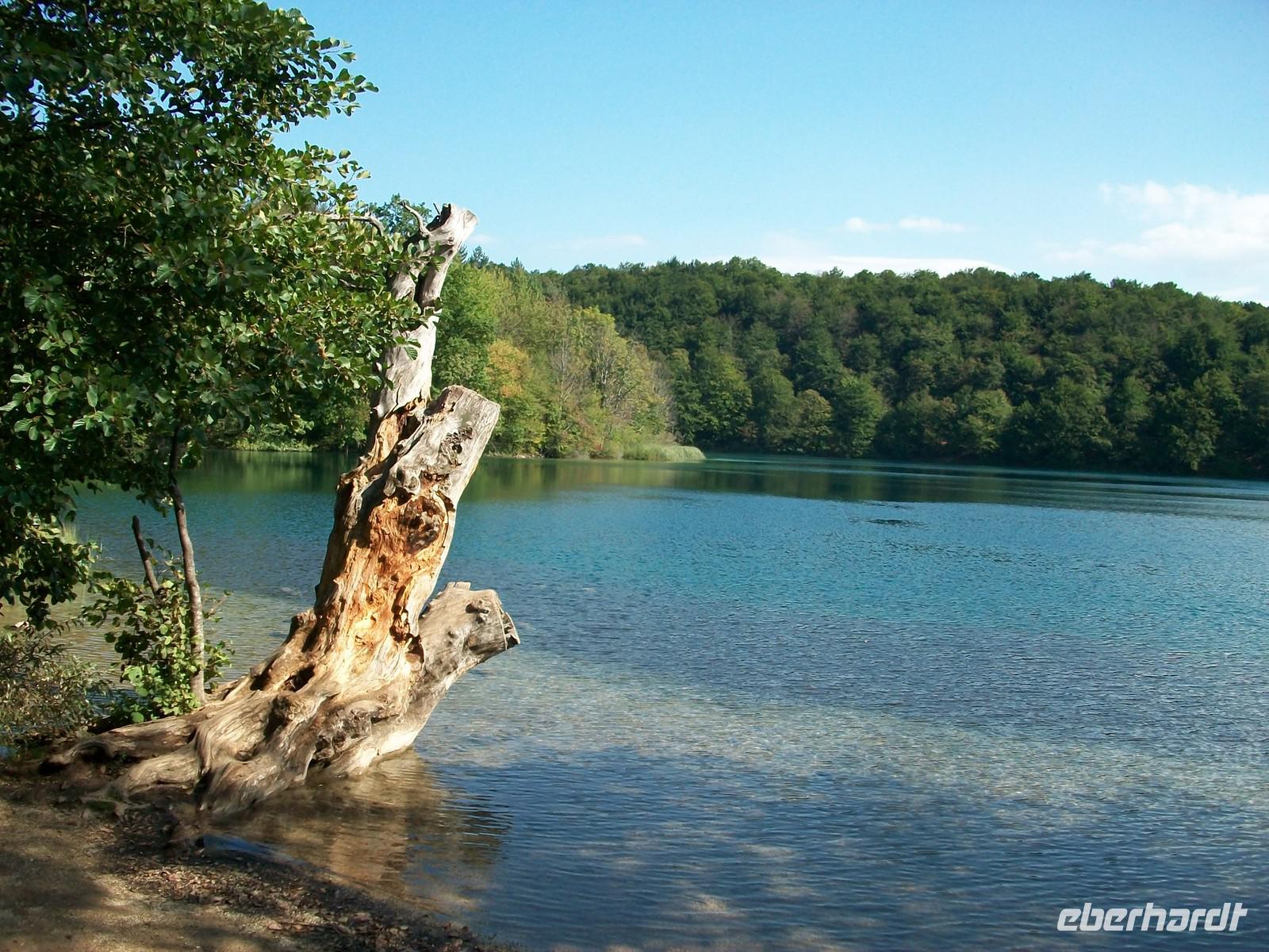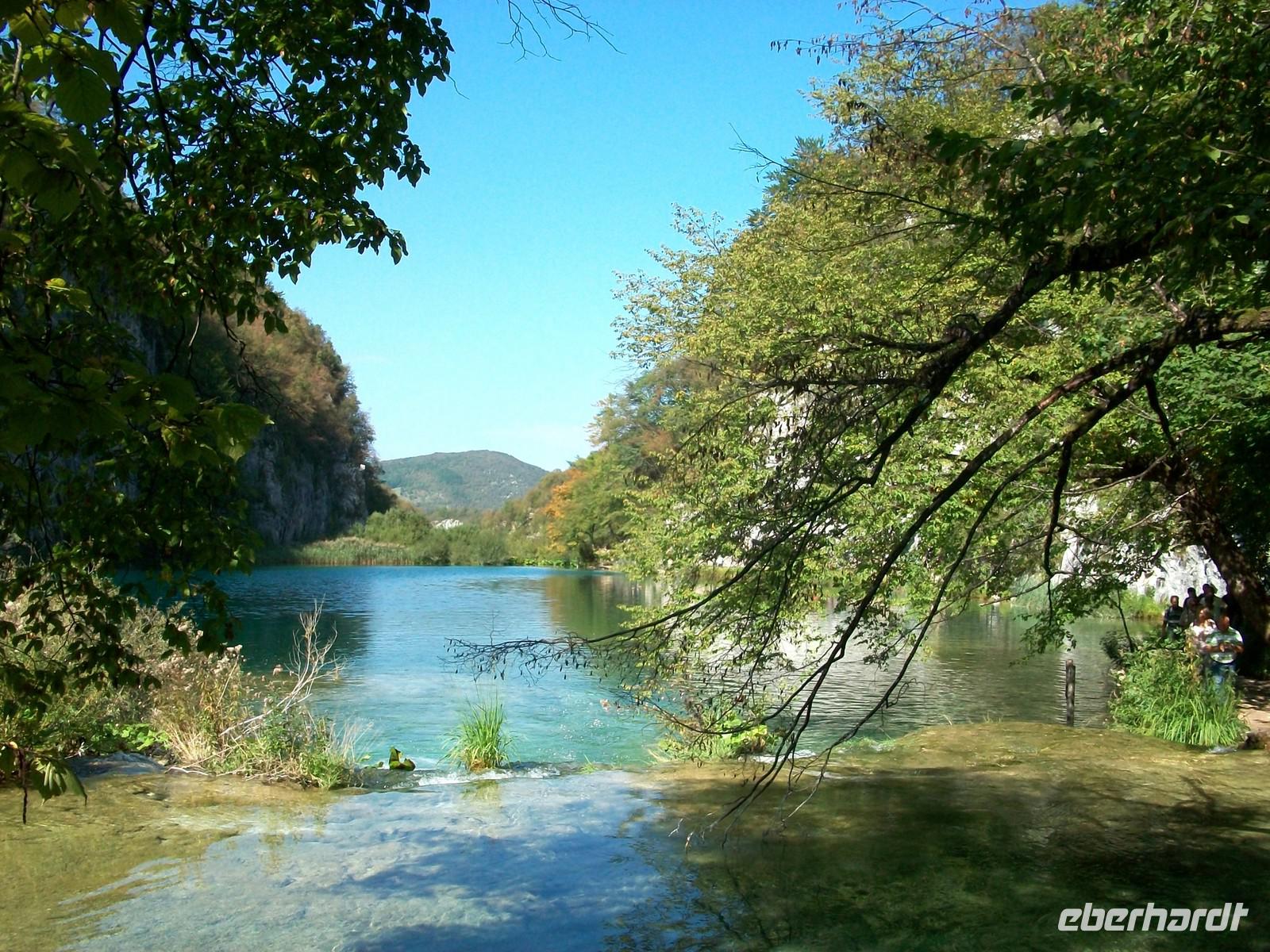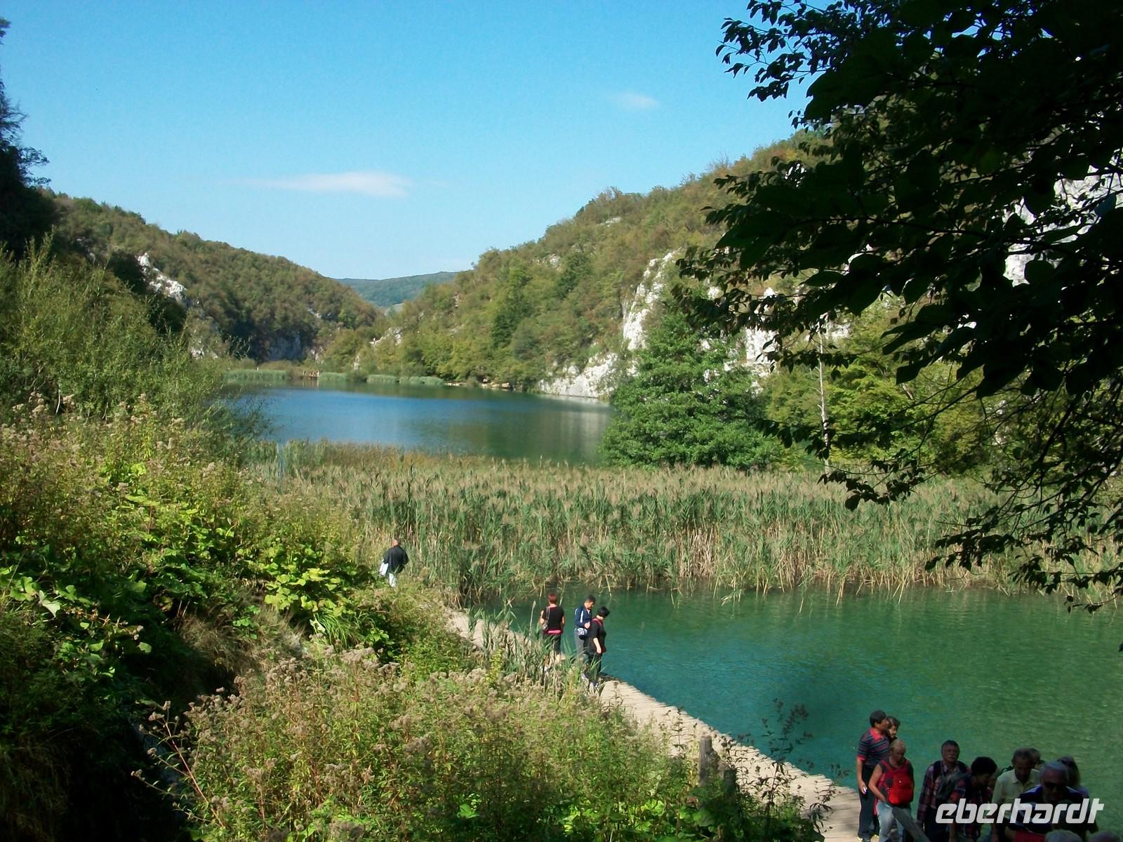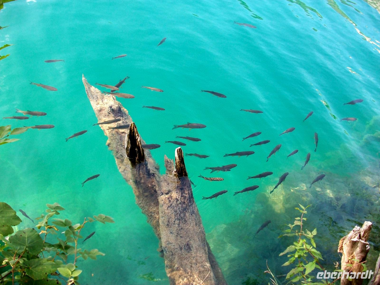 Dann geht es weiter aufwärts, bald kommen wir an dem See vorbei der im Film der Silbersee war, sehen auch die Höhle wo der Schatz versteckt wurde und staunen über die Wunder der Natur hier im Nationalpark. Das Wasser sucht sich immer wieder neue Wege, in seinem Verlauf nach unten bildet es neue Kaskaden und Wasserfälle an denen sich das Auge kaum satt sehen kann. Dann führt der Weg wieder am Seeufer entlang, hier ist es still; das Wasser ist türkisfarben und sehr klar. Vom Rand des Sees schaut man direkt auf den Grund; ins Wasser gefallene Baumstämme haben im Laufe vieler Jahre eine Kalkummantelung bekommen, eines der vielen Phänomene des Karstes. Im klaren Wasser stehen die Saiblinge die sich in den Strahlen der Herbstsonne erwärmen, eine Romantik der besonderen Art.
