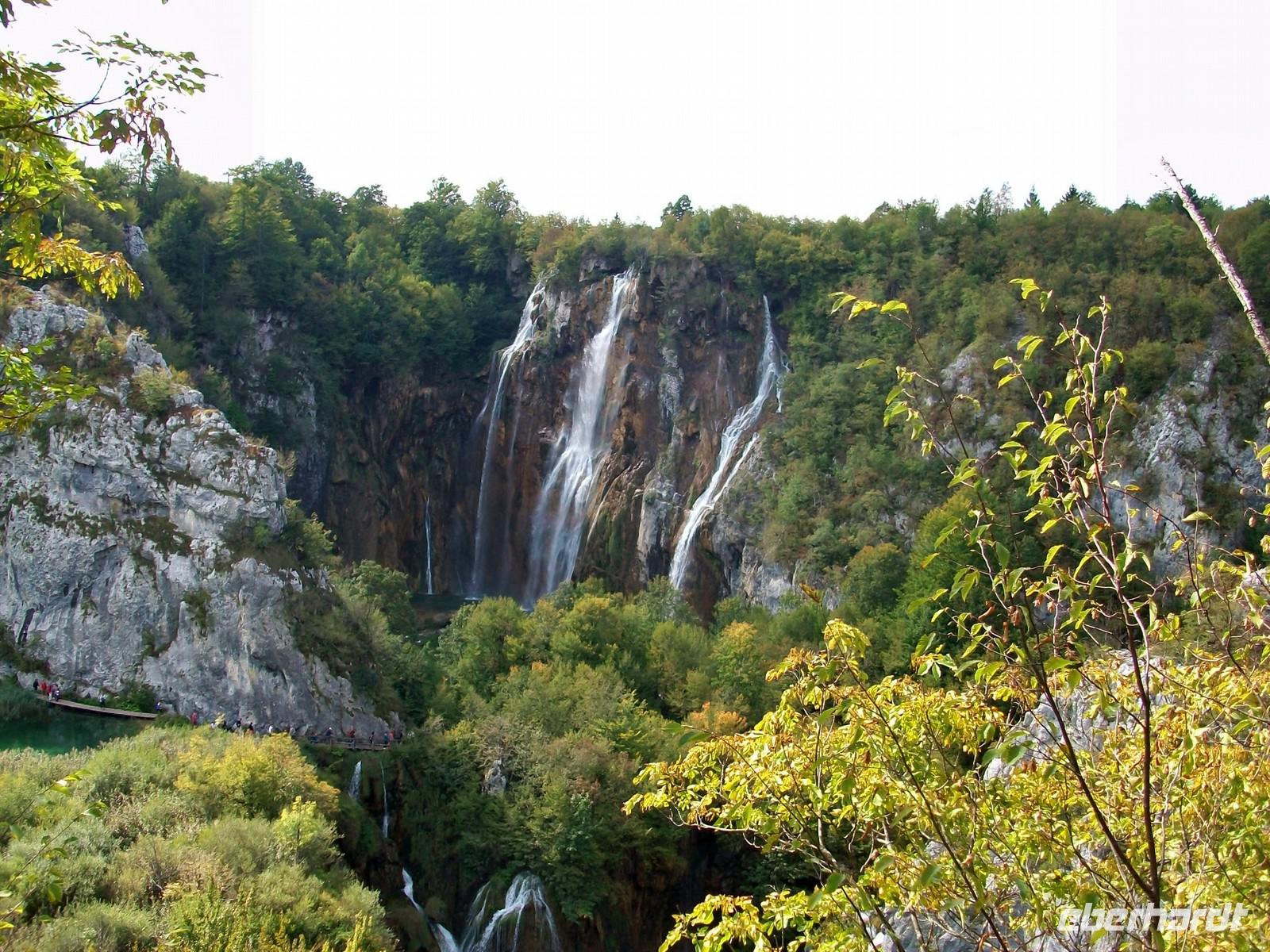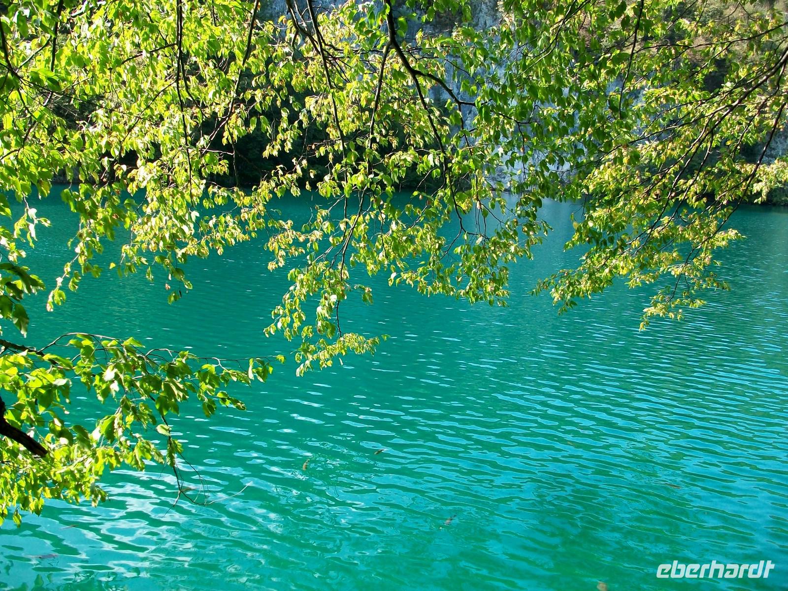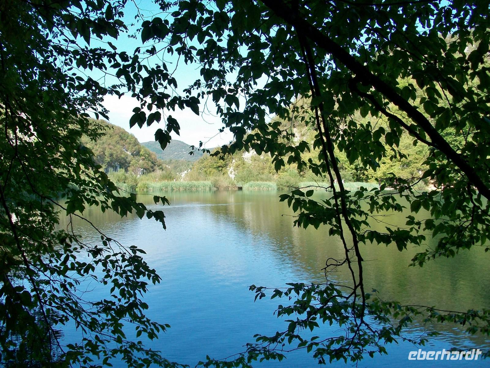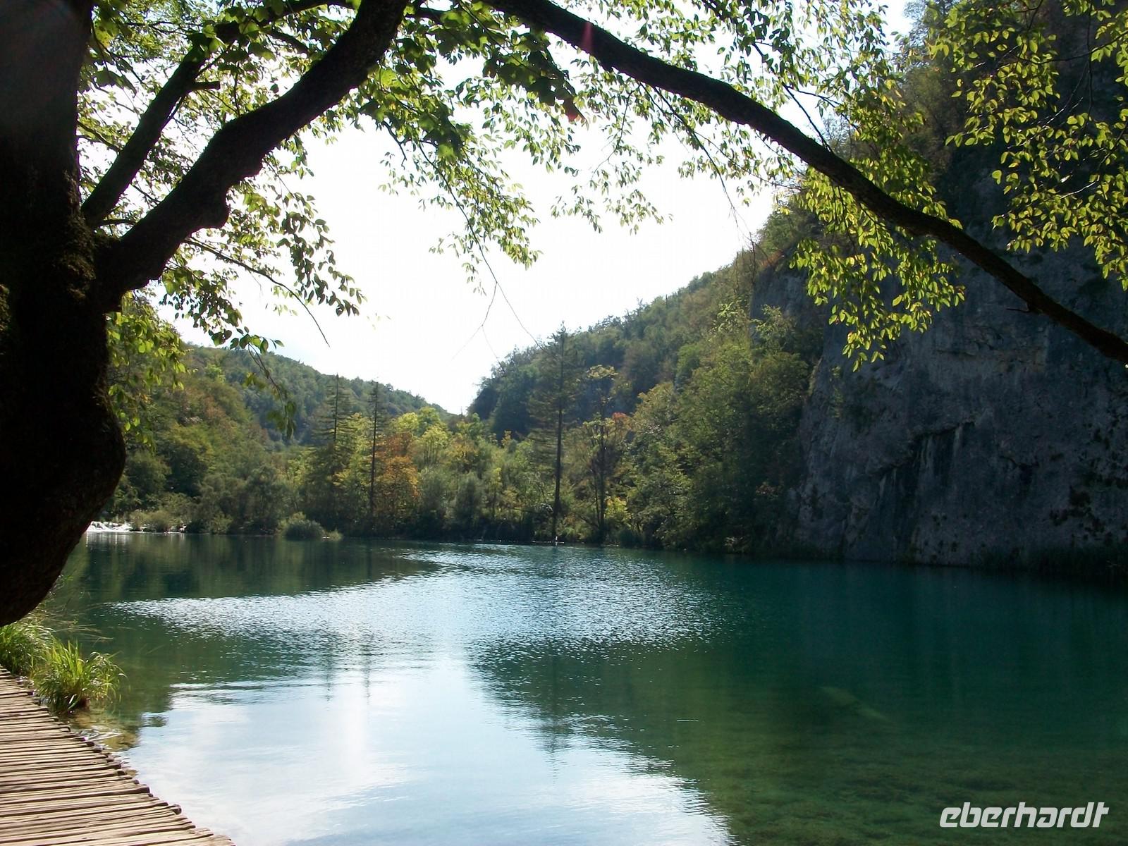 Dann geht es weiter aufwärts, bald kommen wir an dem See vorbei der im Film der Silbersee war, sehen auch die Höhle wo der Schatz versteckt wurde und staunen über die Wunder der Natur hier im Nationalpark. Das Wasser sucht sich immer wieder neue Wege, in seinem Verlauf nach unten bildet es neue Kaskaden und Wasserfälle an denen sich das Auge kaum satt sehen kann. Dann führt der Weg wieder am Seeufer entlang, hier ist es still; das Wasser ist türkisfarben und sehr klar. Vom Rand des Sees schaut man direkt auf den Grund; ins Wasser gefallene Baumstämme haben im Laufe vieler Jahre eine Kalkummantelung bekommen, eines der vielen Phänomene des Karstes. Im klaren Wasser stehen die Saiblinge die sich in den Strahlen der Herbstsonne erwärmen, eine Romantik der besonderen Art.