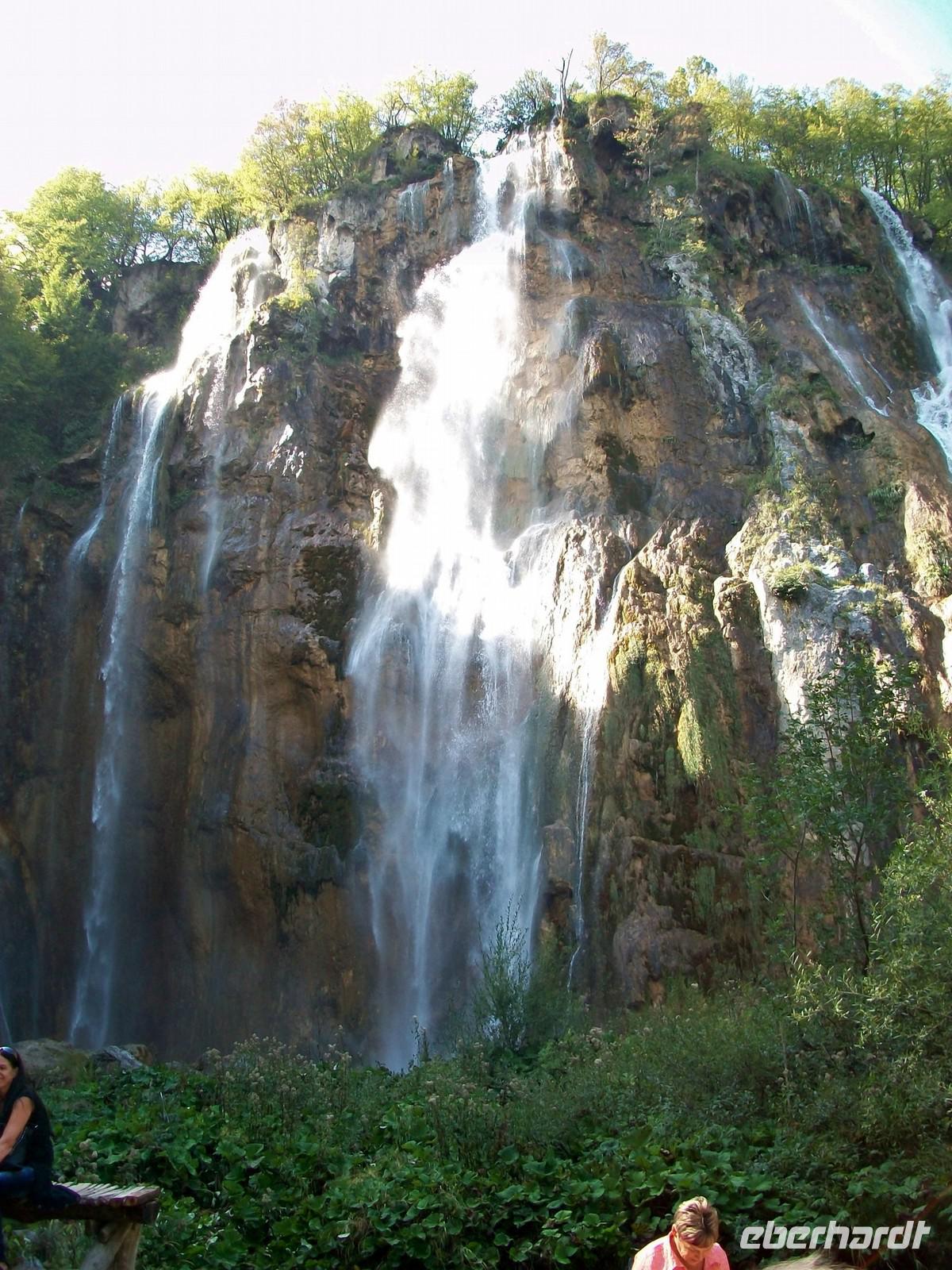 Kurz nach eins starten wir dann, pünktlich hat Petrus die letzten Wolken vom Himmel geräumt und im Sonnenschein gehen wir hinunter zum großen Wasserfall. Schon von weitem hören wir das Tosen des fallenden Wassers und als wir direkt davor stehen, halten wir den Atem an, zu gewaltig ist der Eindruck. Den Kopf in den Nacken gelegt schauen wir nach oben, fast 80 Meter ist die Fallhöhe und das Wasser hat sich hier verschiedene Wege gesucht bevor es tosend unten am Fels zerstiebt.