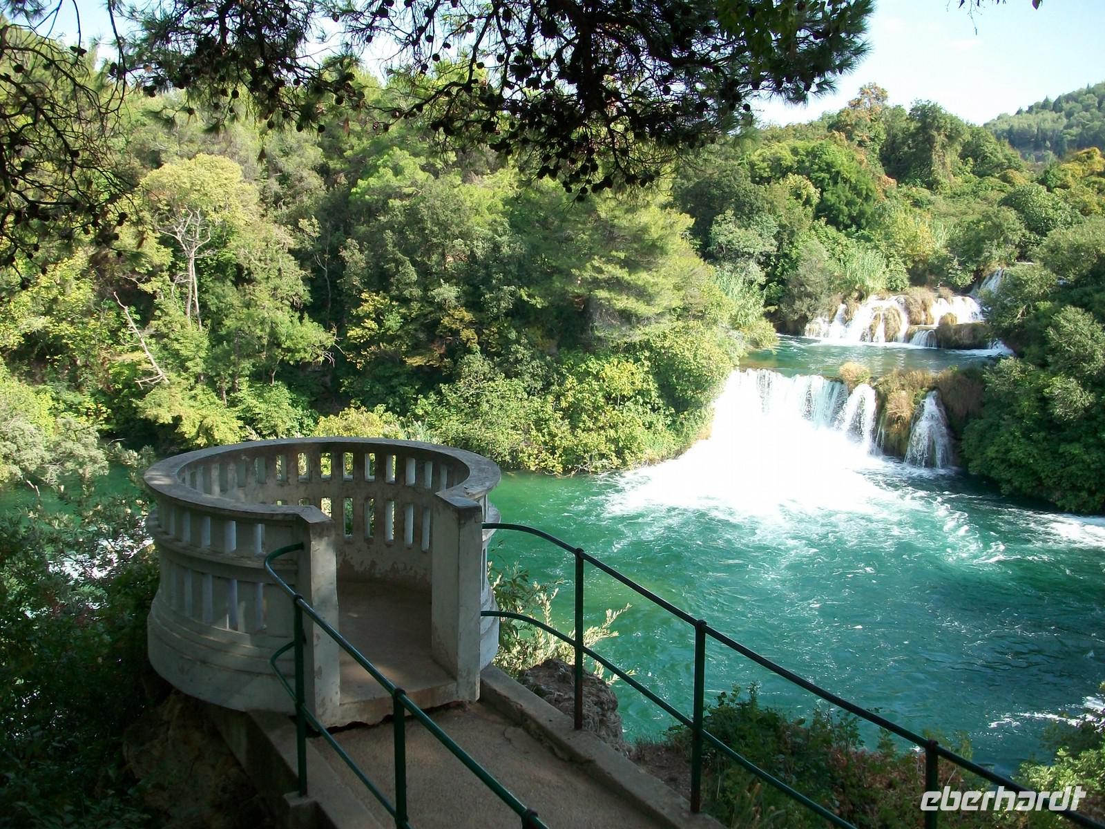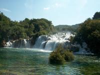 Der weitere Weg führt uns durch die Stadt Knin und hinter den Ort Drniš sind wir dann endgültig im mediterranen Einflussbereich angekommen, was uns auch die Vegetation verrät. Gegen Mittag langen wir am Krka- Nationalpark an, ein kleiner Imbiss stärkt uns für die nächsten Stunden. Dann geht die Fahrt hinunter zum Skradinski Buk, dem spektakulären Wasserfall. Die Straße führt uns in Serpentinen abwärts und es wird der Blick frei auf eine phantastische Naturlandschaft. Der Fluss Krka hat sich hier seenartig verbreitert, unter uns hat sich eine blaue Wasserfläche ausgedehnt die sich fast bis zum Horizont erstreckt.