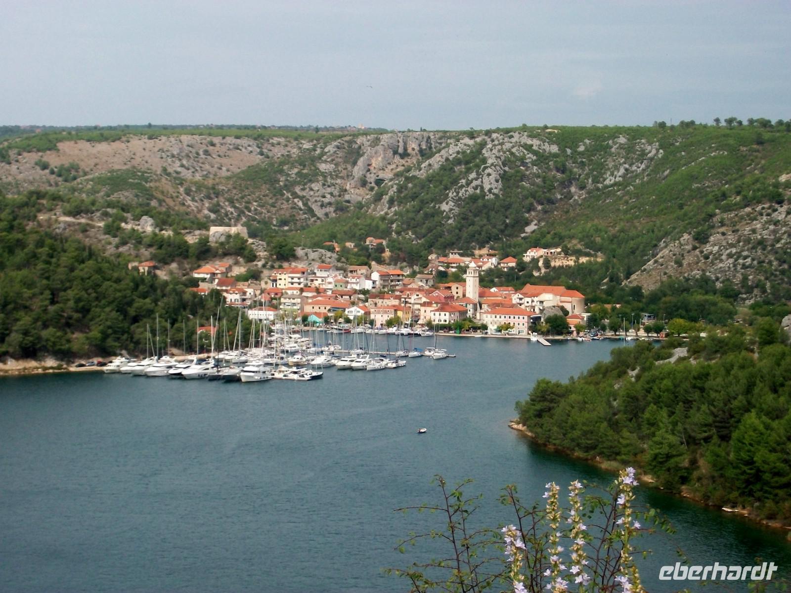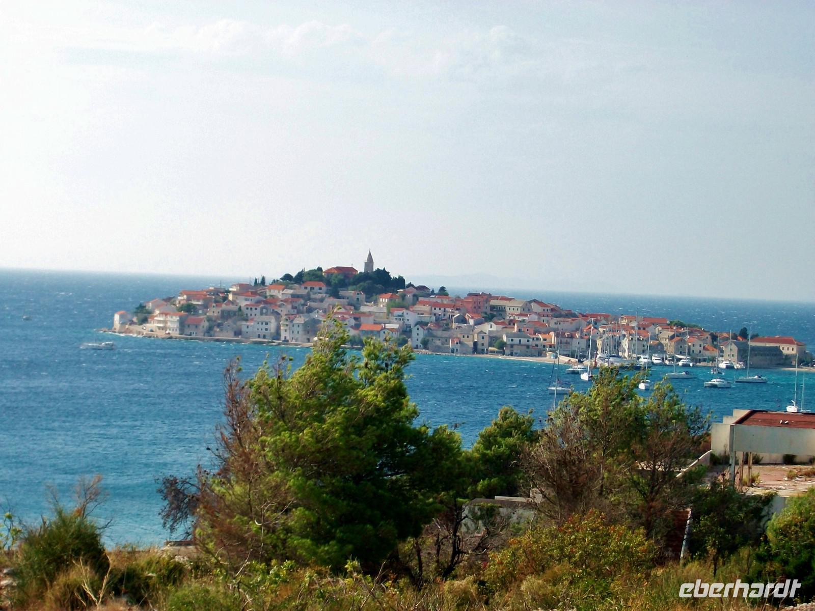 14.40 Uhr. Die Straße führt uns in Serpentinen wieder hinauf, noch einmal schauen wir dabei auf die große Wasserfläche des Flusses. Es vergeht aber nicht sehr viel Zeit und wir haben eine noch mächtigere Wasserfläche vor uns: die Adria. Bei Šibenik langen wir dann dort an und die weitere Fahrt führt uns immer direkt an der Küste entlang. Malerisch sind die Buchten und die vorgelagerten Inseln anzuschauen; ein besonderes Kleinod ist der Ort Primošten, direkt auf einer Halbinsel gelegen.
