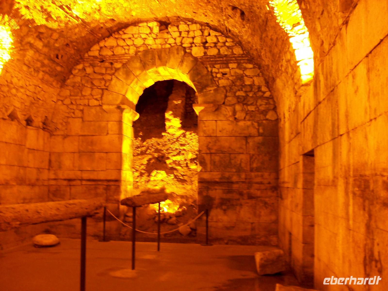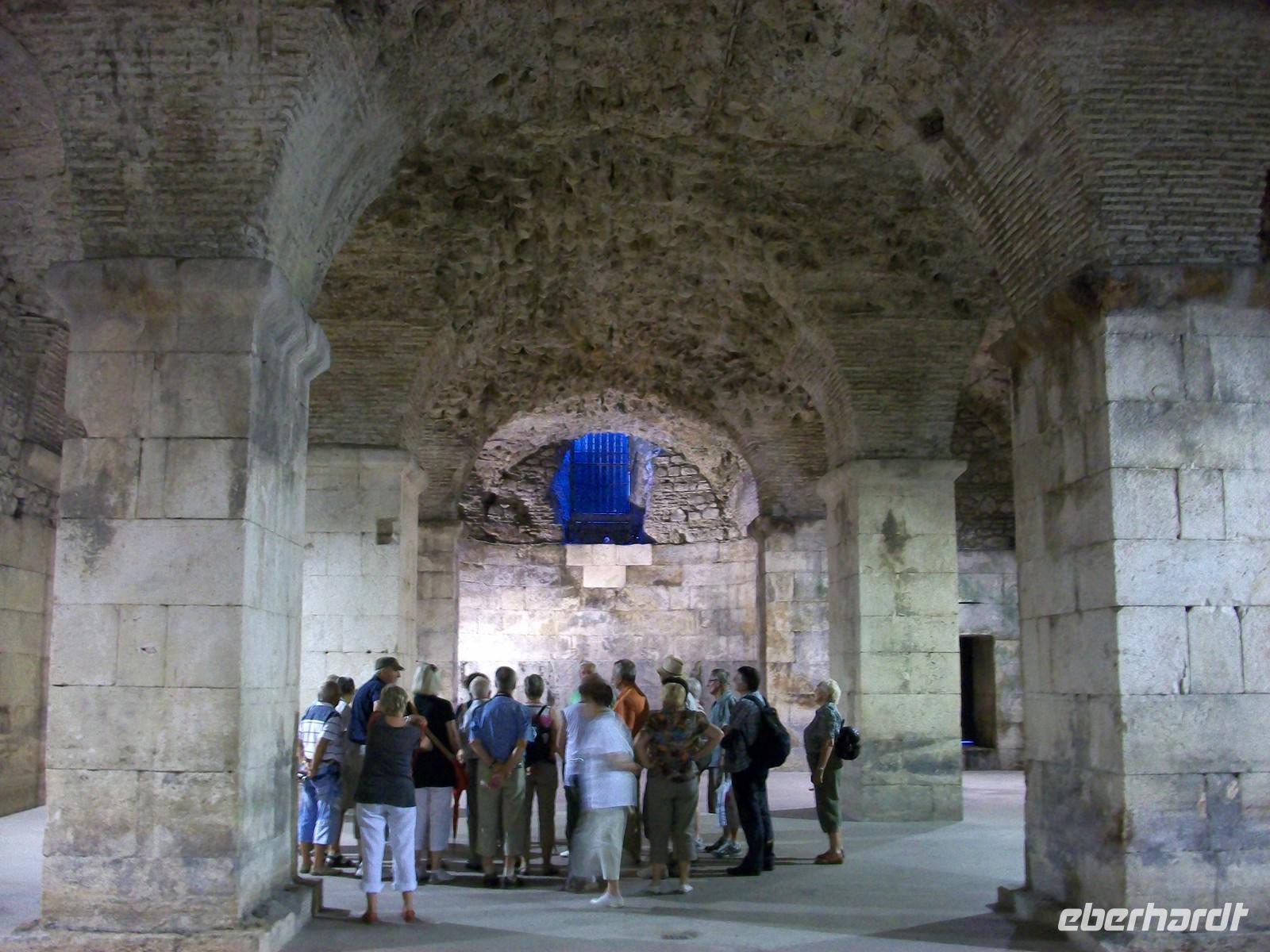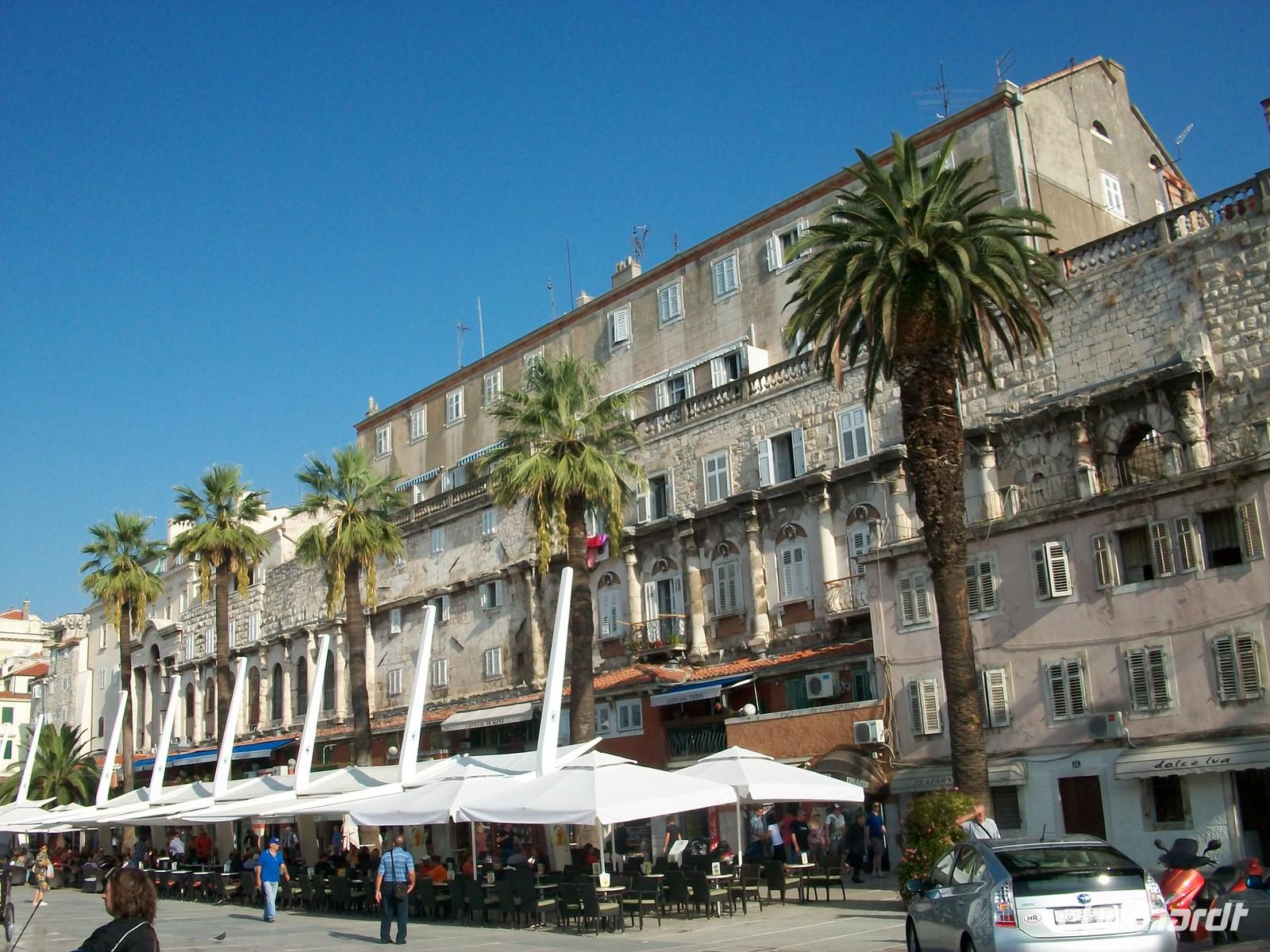 25.9.2012. Auch dieser Tag beginnt wieder sonnig, wir starten gegen neun vom Hotel und sind in wenigen Minuten an der Riva angelangt; hier werden wir schon von Vesna erwartet, sie wird uns nun in längst vergangene Zeiten entführen beim Gang durch den ältesten Teil der Stadt. Auf der Strandpromenade erfahren wir einiges über diesen wichtigen Ort; der Römische Kaiser Diokletian ließ sich seinerzeit diesen Palast bauen um seinen Ruhestand zu genießen. Dann tauchen wir ein in die Kellergewölbe und drehen auch heute wieder die Zeit zurück, dieser Palast entstand vor rund 1 700 Jahren. Vesna entführt uns in diese wichtige Zeitepoche als es im Römischen Imperium schon mächtig anfing zu kriseln. Die gigantischen Mauern und Kalksteinquader legen ein beredtes Zeugnis einstiger Macht ab!