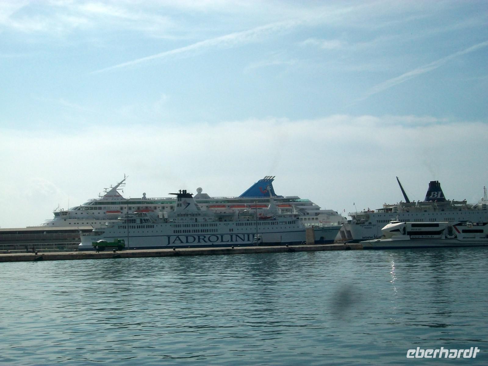 Kurz nach halb elf treffen wir uns wieder am Bus, es ist nicht sehr weit bis zum Fähranleger. Hier ist schon ein munteres Treiben das doch so typisch für alle Fährhäfen dieser Welt ist. Unser Schiff liegt auch schon am Kai, bald können wir an Bord gehen um uns es hier gemütlich zu machen. 11.30 Uhr, ein leichtes vibrieren geht durch das Schiff, die Motorengeräusche werden lauter und langsam setzt sich die Fähre in Bewegung. Die Sonne ist auch wieder herausgekommen und viele Gäste nutzen das Oberdeck zu einem Sonnenbad, die Seebrise fächelt uns dabei angenehm frische Luft ins Gesicht. Bald haben wir die Meerengen zwischen den Inseln Brac und Šolta erreicht, dahinter ist in der Ferne schon das Häusermeer von Split zu sehen. Dahin nehmen wir Kurs und nach einer weiteren Fahrstunde laufen wir im Hafen dieser Stadt ein. Jetzt heißt es erst einmal das Gewühl der Ausfahrt zu meistern, unser Chauffeur muss aufpassen das es zu keiner Kollision mit Mensch oder Auto kommt- doch das gelingt ihm grandios. Eine Viertelstunde später haben wir das Großstadtgewühl hinter uns gelassen und befinden uns auf dem Weg hinauf zur Autobahn in den Bergen hinter Split. Bei den zahlreichen Serpentinen gelingt immer wieder ein Blick zurück.