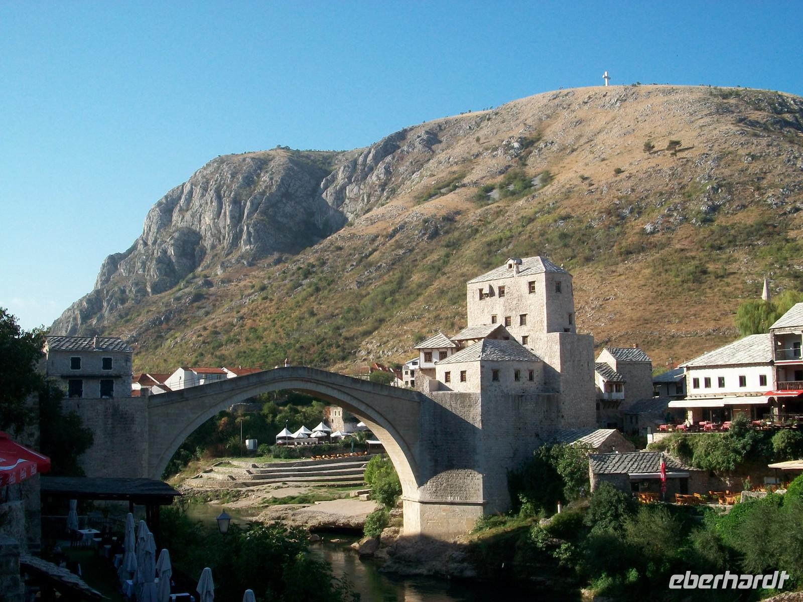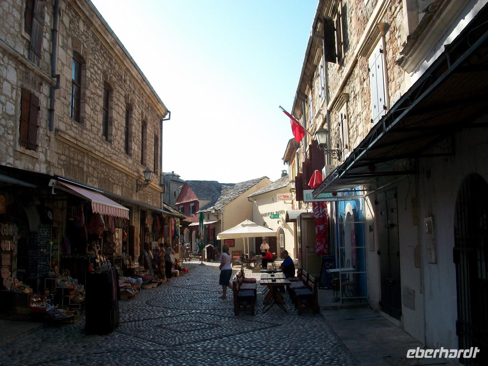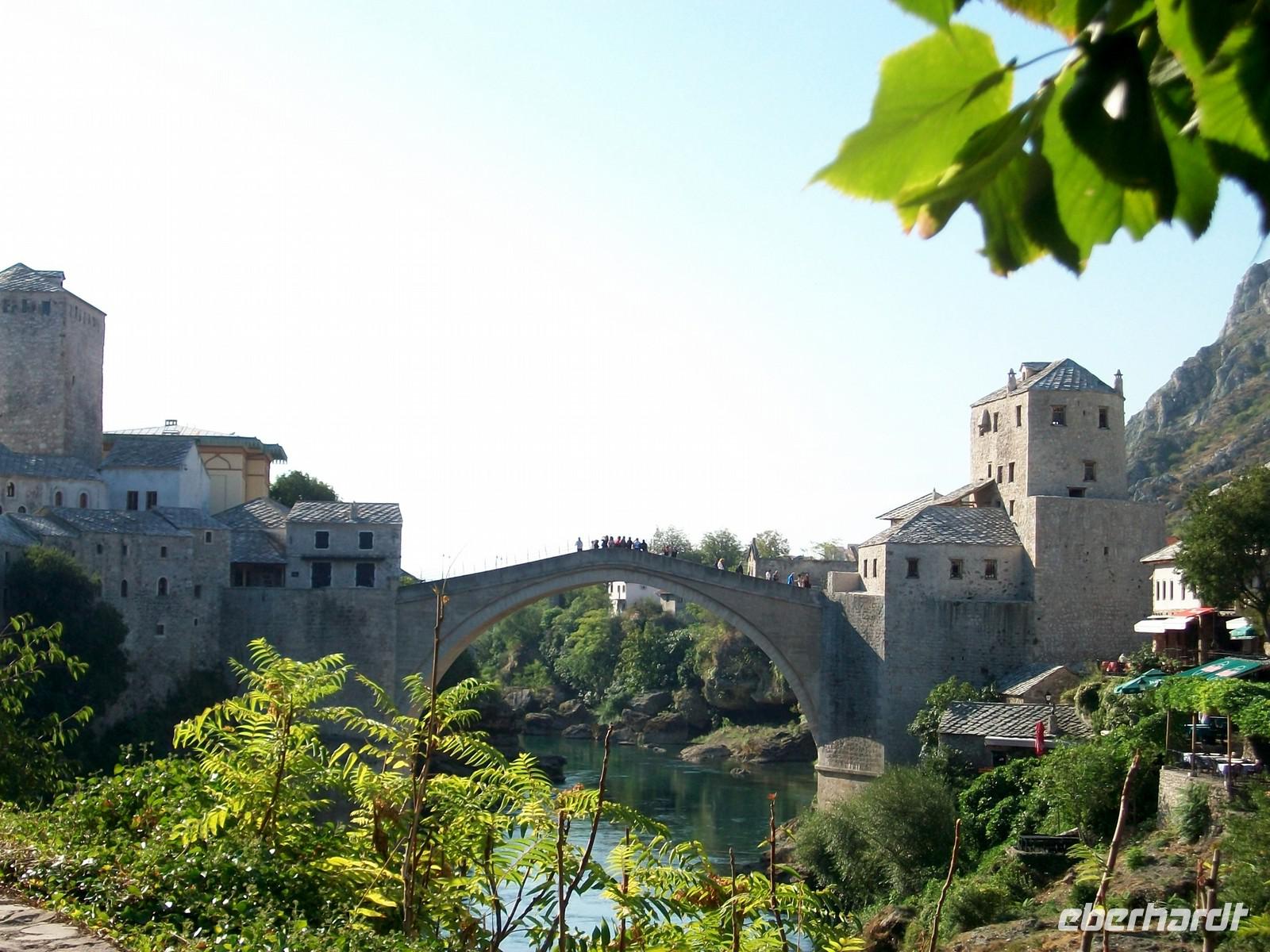 Nach dem wir die Hauptstraße überquert haben, ändert sich das Bild schlagartig. Plötzlich sind wir im Orient angelangt; wir laufen über holpriges türkisches Pflaster und sehen die typischen Bauten dieser langen osmanischen Zeitepoche. Da es noch früh am Tage ist, sind die schmalen Gassen noch fast leer, das Programm welches wir uns vornehmen kann ganz entspannt vonstatten gehen. Bald kommen wir am wichtigsten Wahrzeichen von Mostar an: der Alten Brücke. Etwas mühselig ist die Überquerung, unter unseren Füßen schlängeln sich die grünen Fluten der Neretva entlang. Am gegenüberliegenden Ufer haben wir einen schönen Blick auf dieses elegante Bauwerk welches ab 2004 wieder in alter, neuer Schönheit das Auge des Besuchers erfreut.